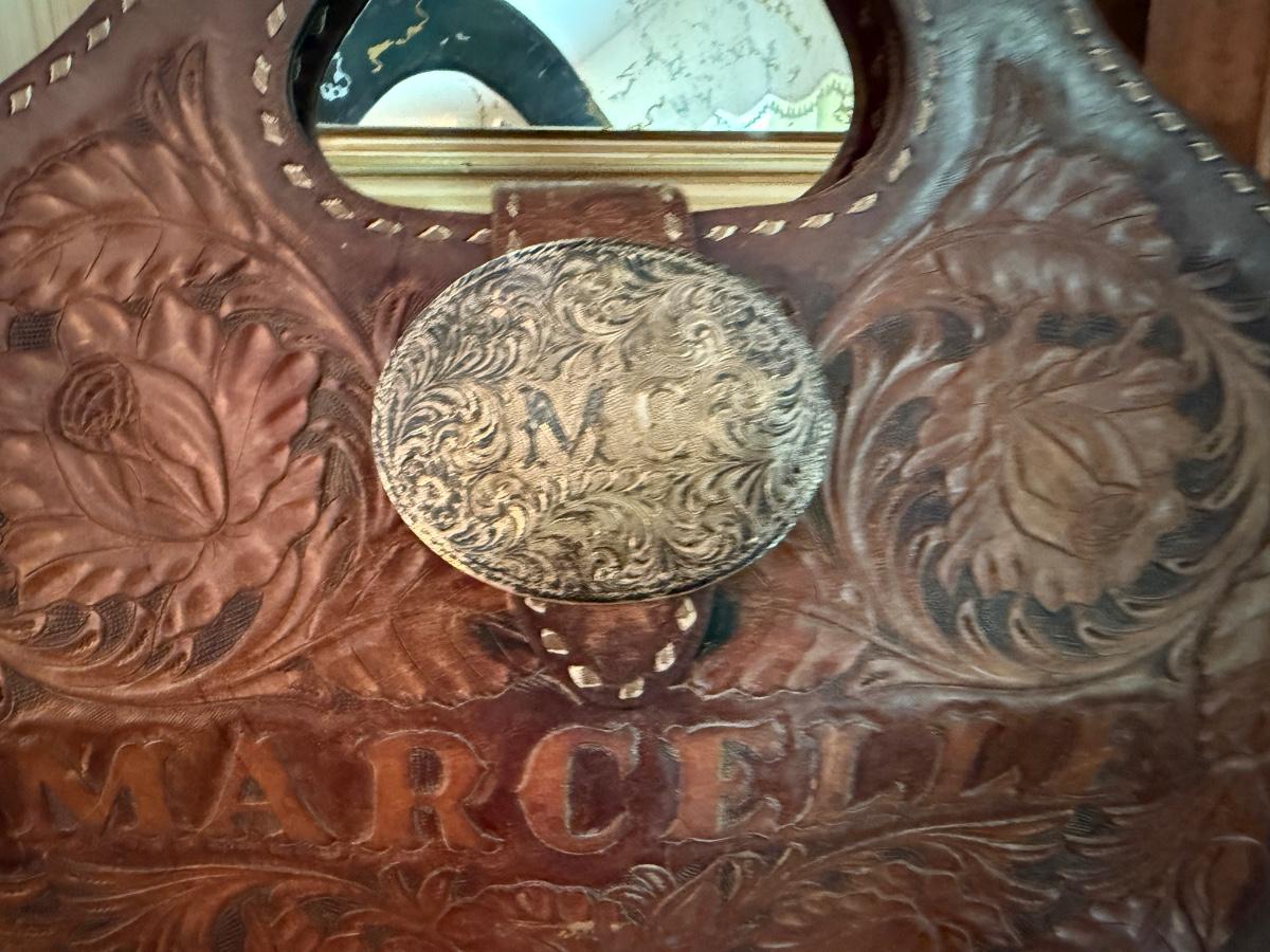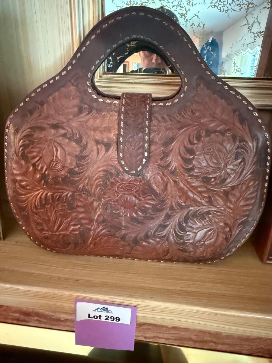 Vtg,. tooled leather Bag w/Sterling Silver buckle