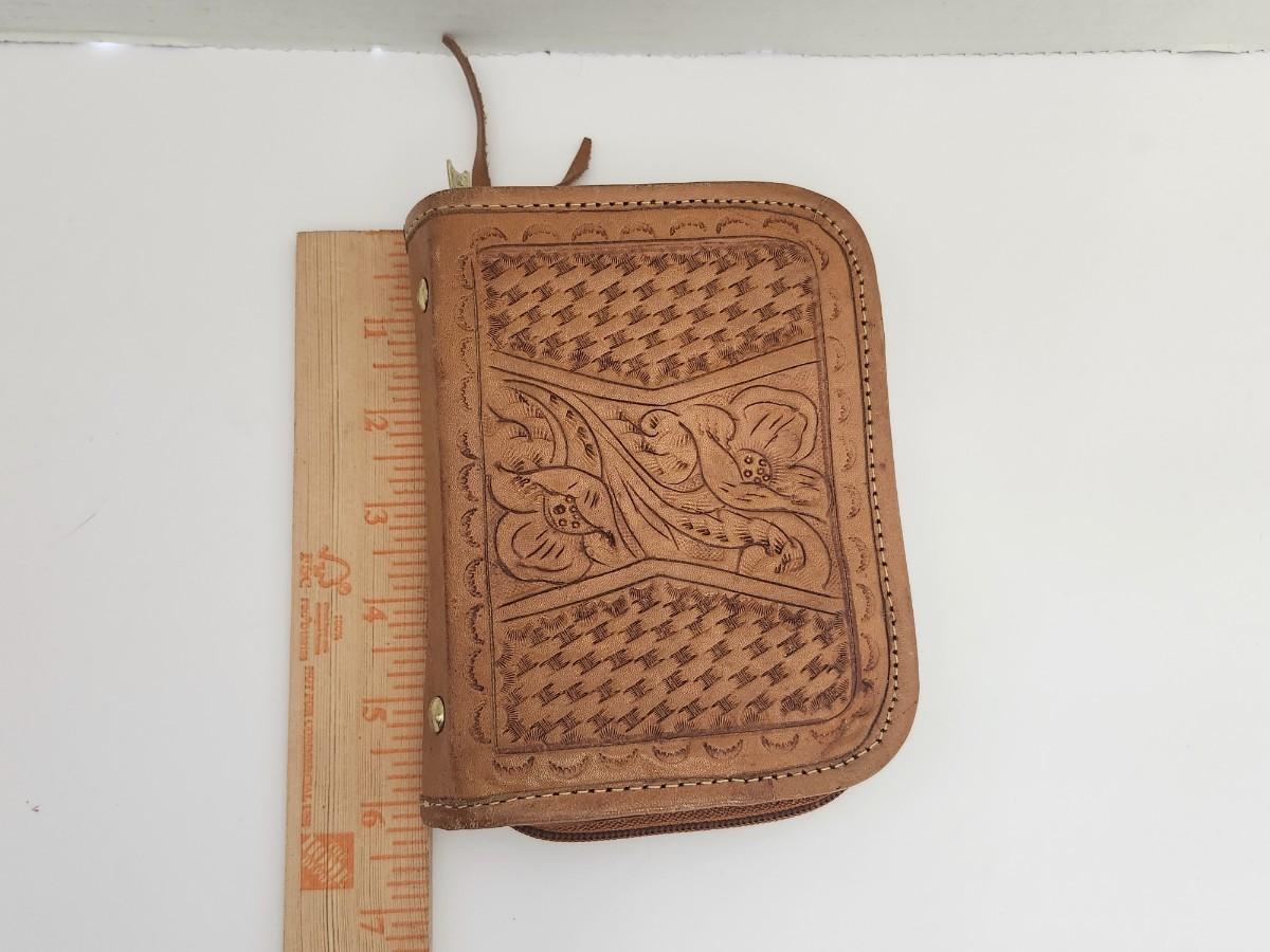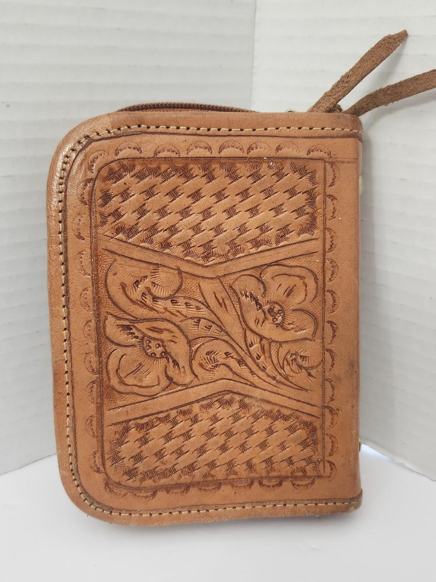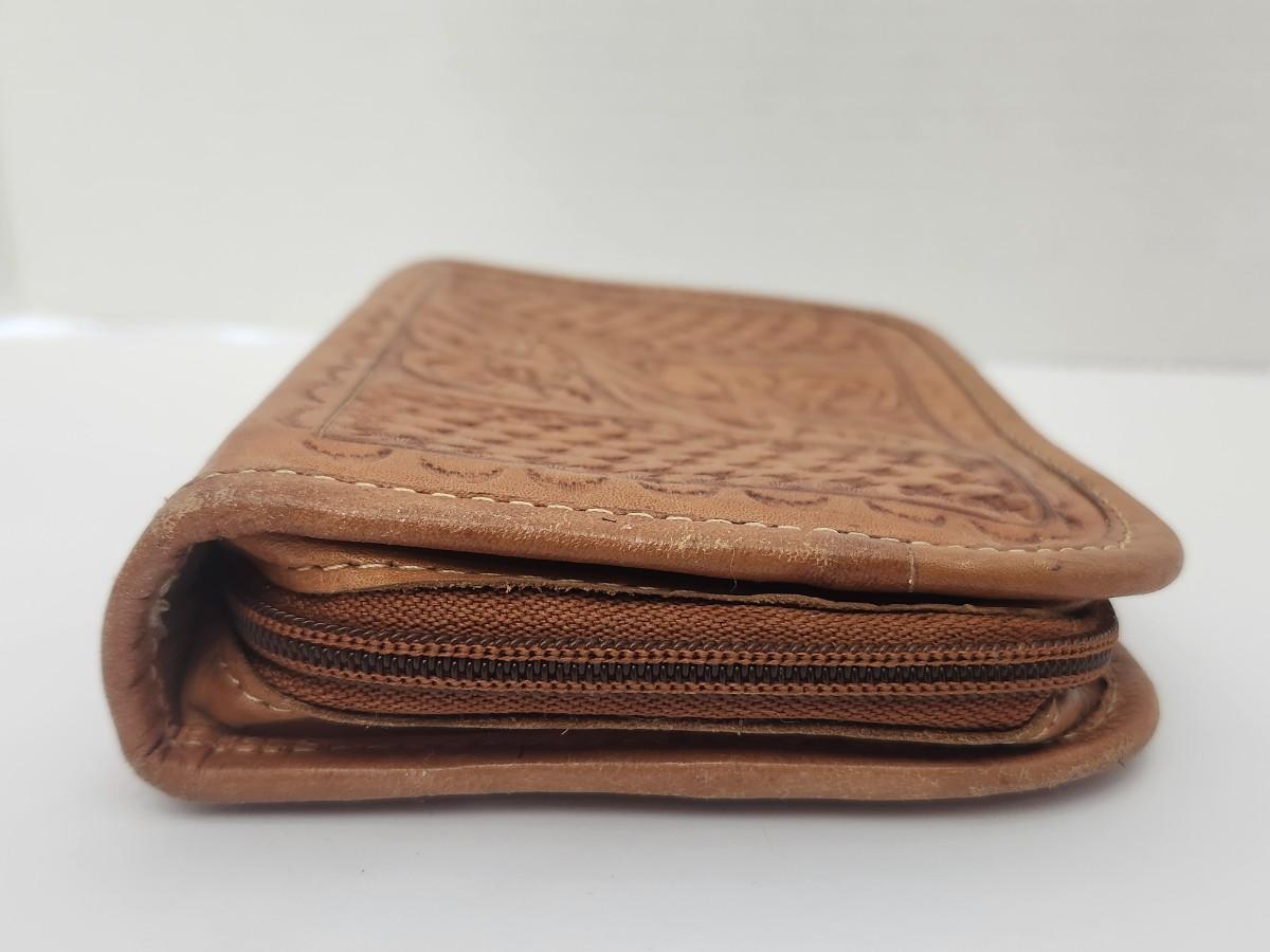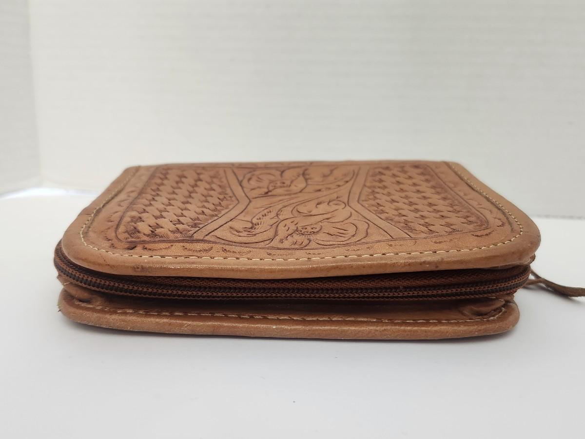 Tooled Leather Zip Around Wallet Floral Basketweave Design Unmarked Brown Leather Accessory