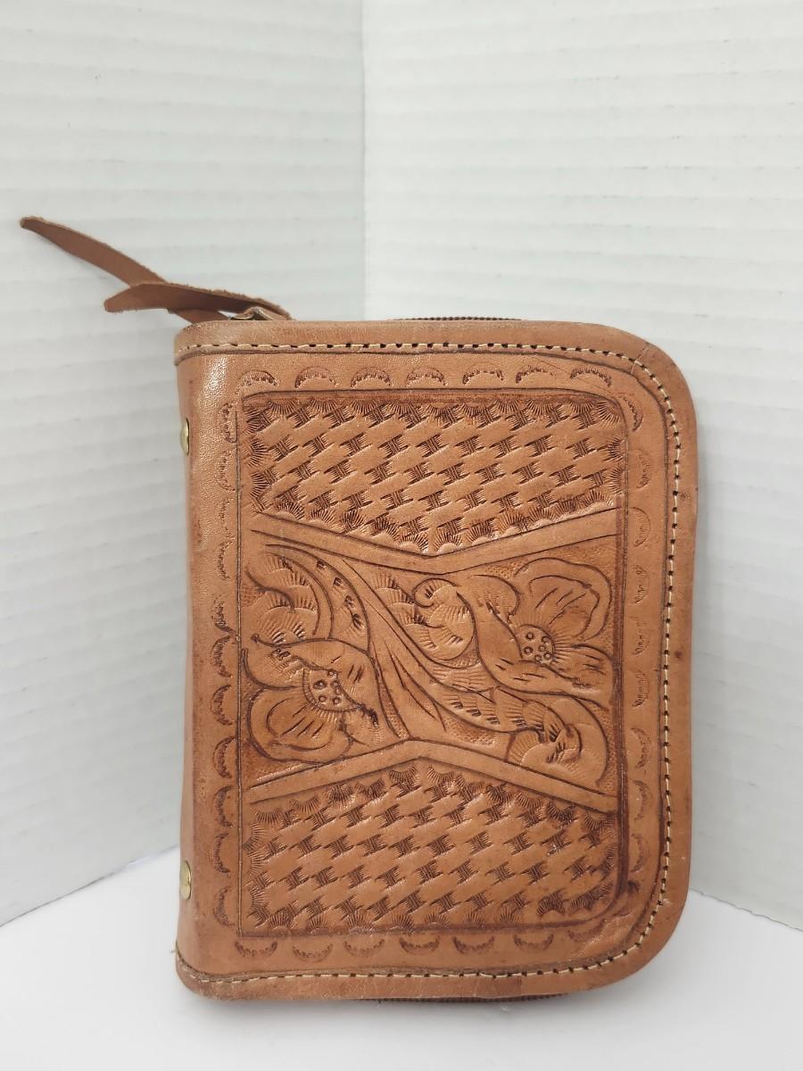 Zip around leather wallet featuring a hand tooled floral and basketweave style design on the exterior. Brown leather construction with stitched edges and wraparound zipper closure. Interior includes structured compartments with snap hardware and leather lining. No maker mark visible. Traditional Western or vintage style leather accessory. Sold exactly as shown.