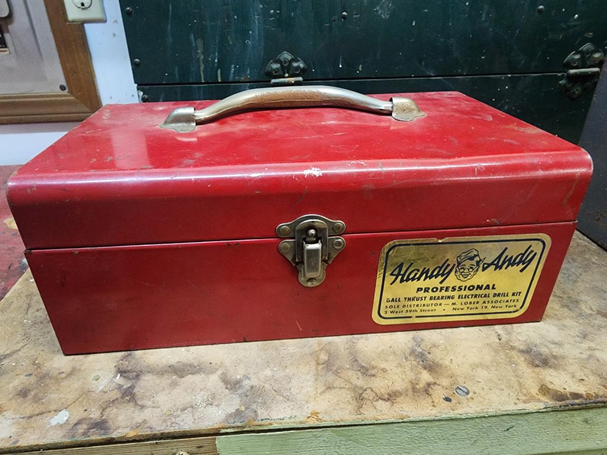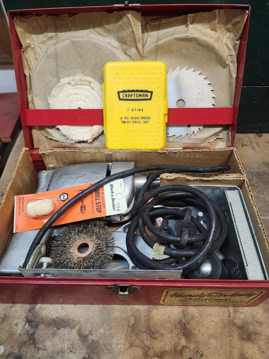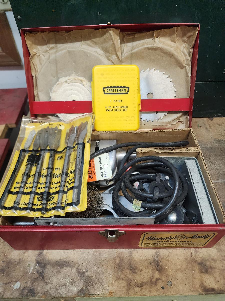 Vintage Handy Andy Professional Ball Thrust Bearing Electric Drill Kit w/1/4" drill, sanding disks, saw blades, drill bits, wood boring bits, etc.