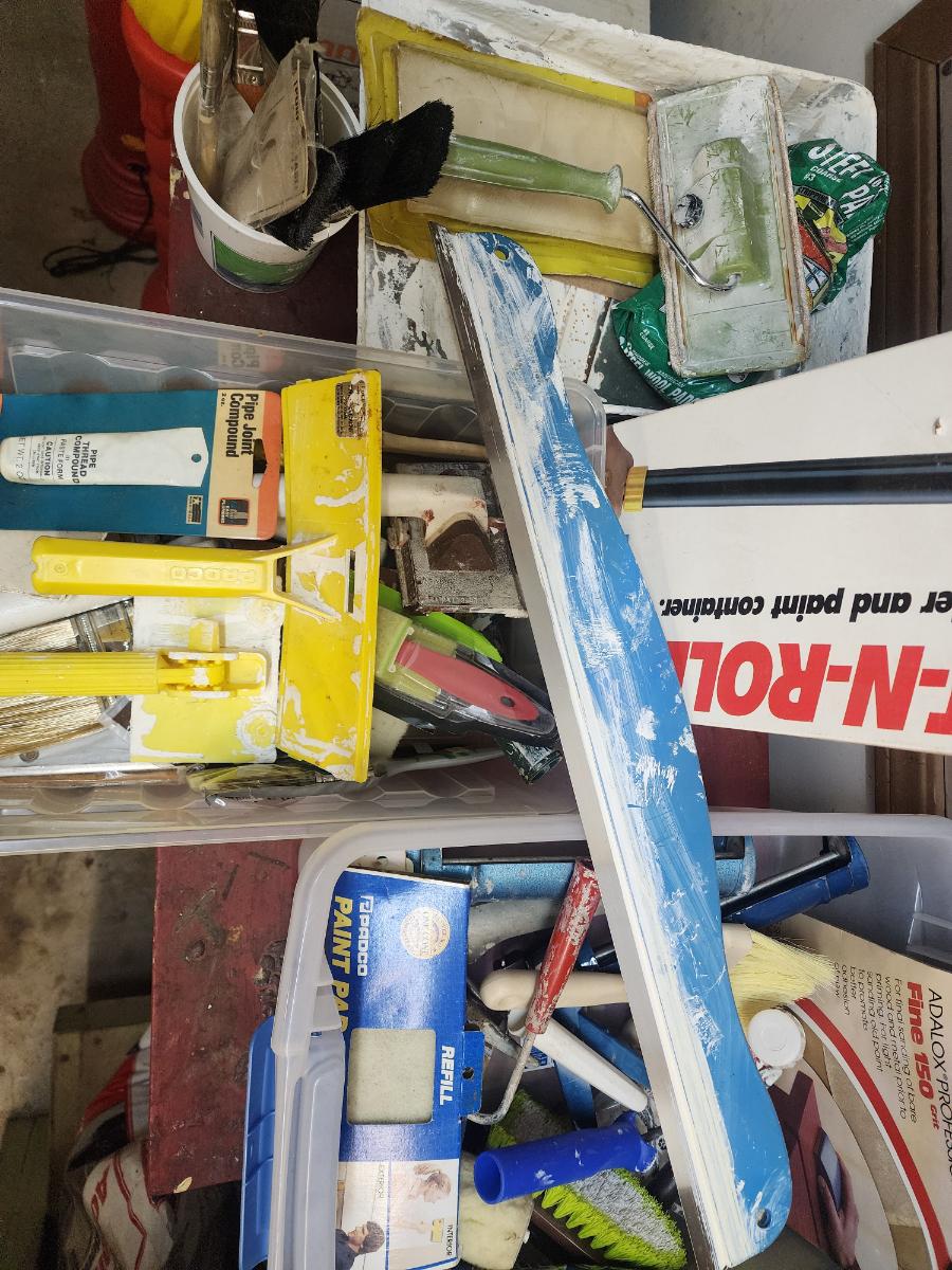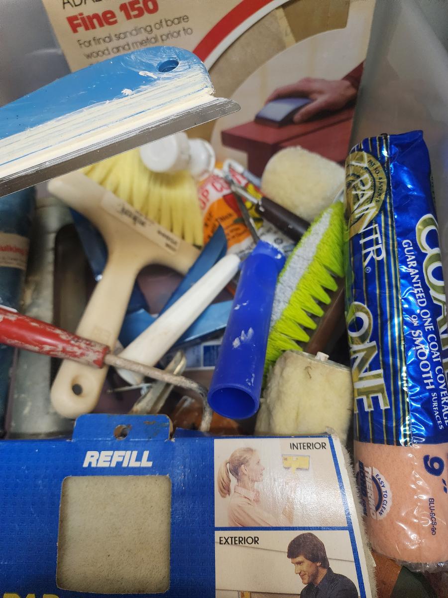 Lot of paint brushes, rollers, roller handles, Wagner Paint-N-Roll, caulk guns, paint scrapers, etc. (container not included)