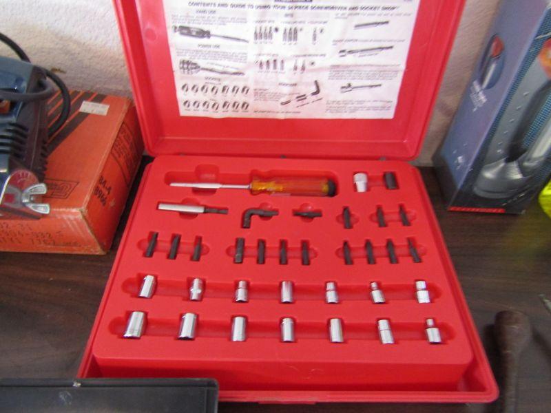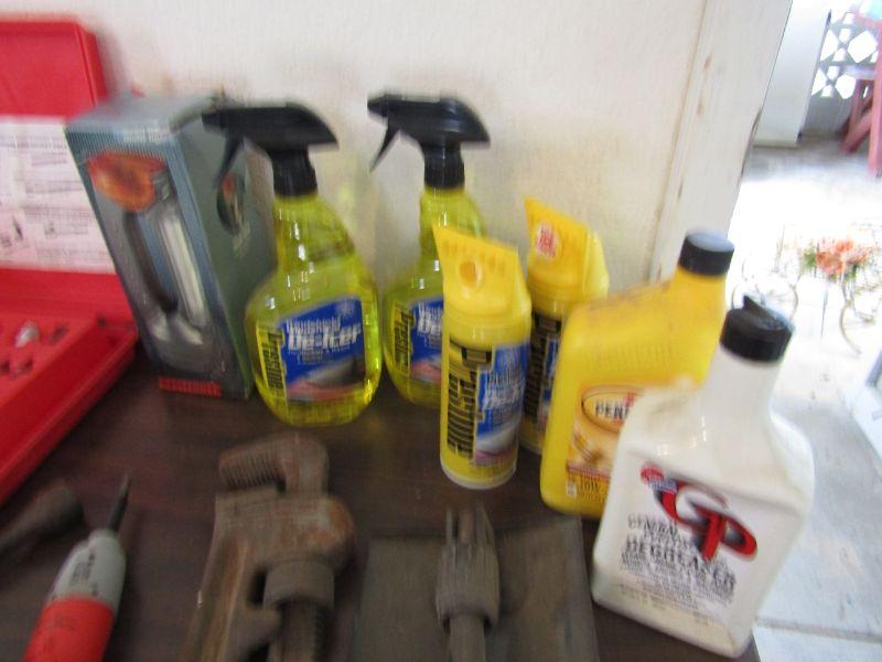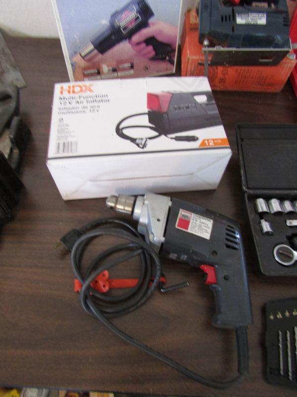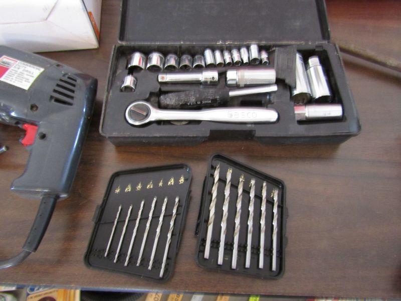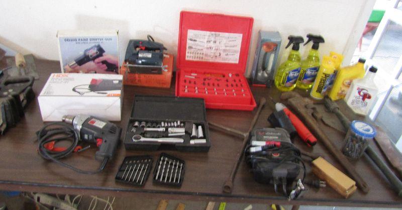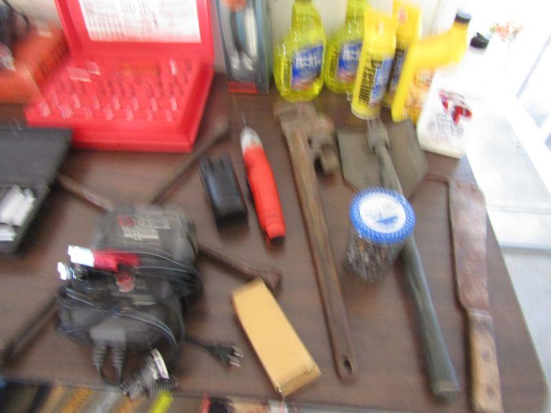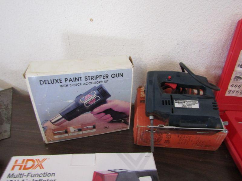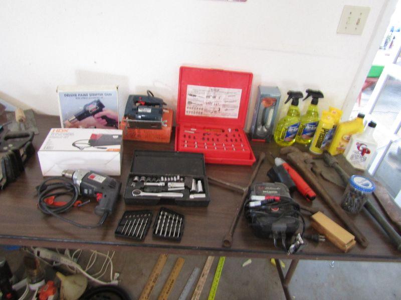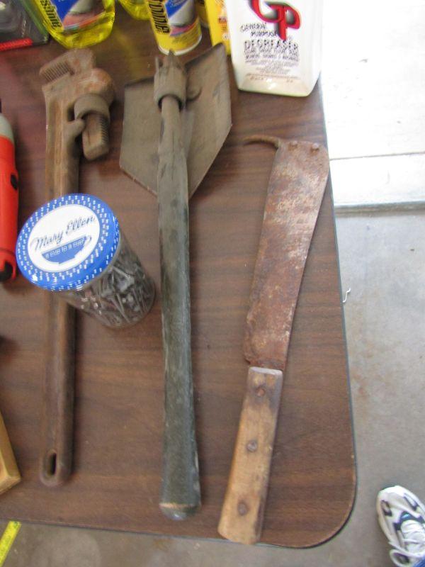SOCKET SET, PAINT STRIPPER GUN, JIGSAW, CORDED DRILL, LARGE PIPE WRENCH, MACHETE, ARMY FOLDING SHOVEL, DRILL BITS AND MORE