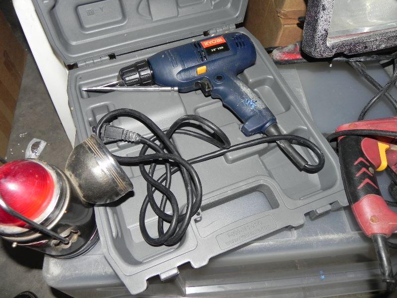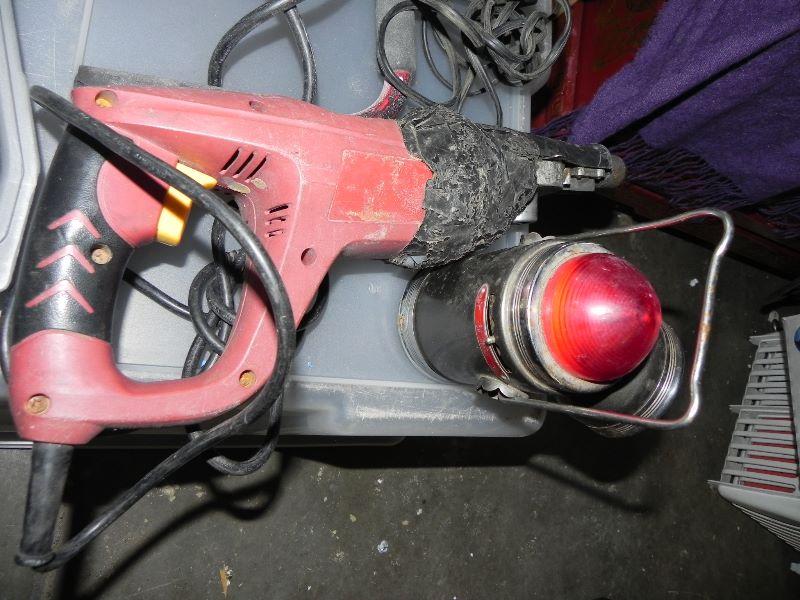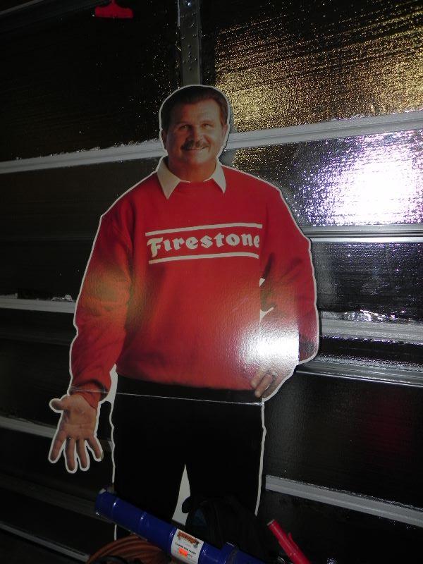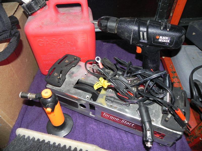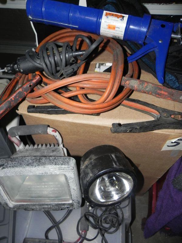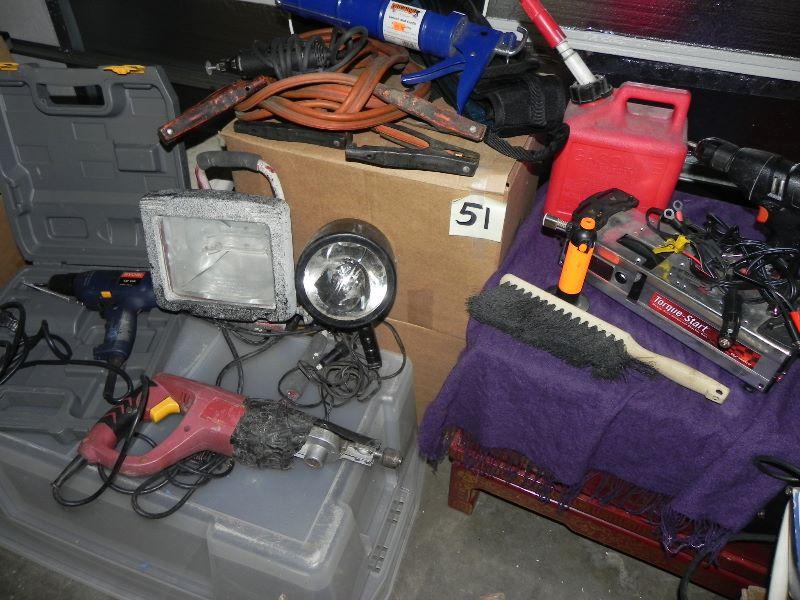 Drills, jumper cables, life size cardboard cutout of Firestone man, lights, Dremel, torque start, and more