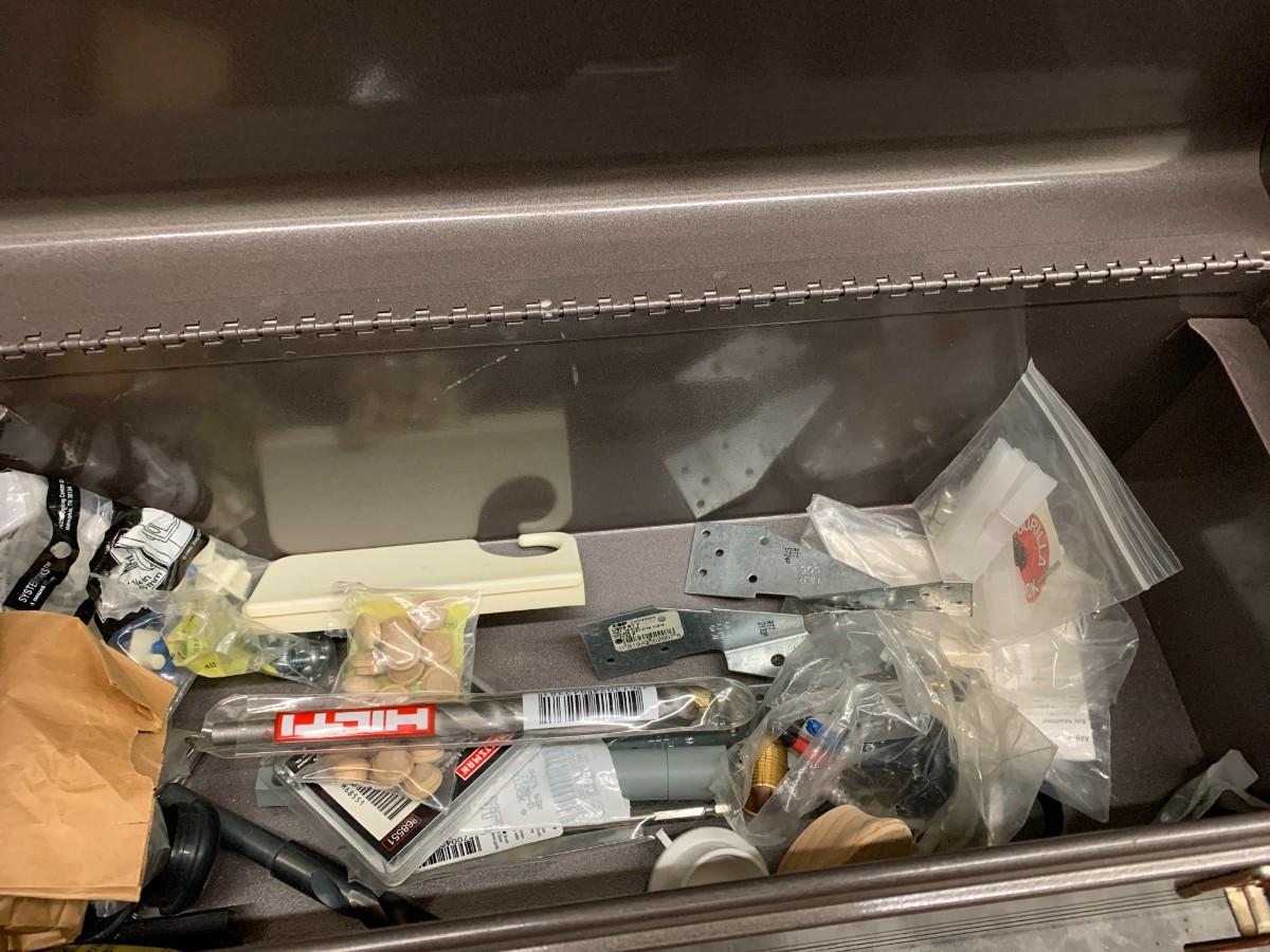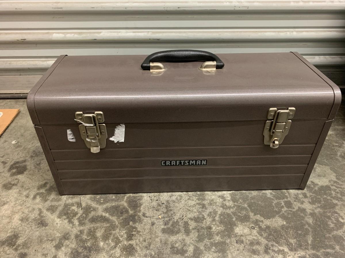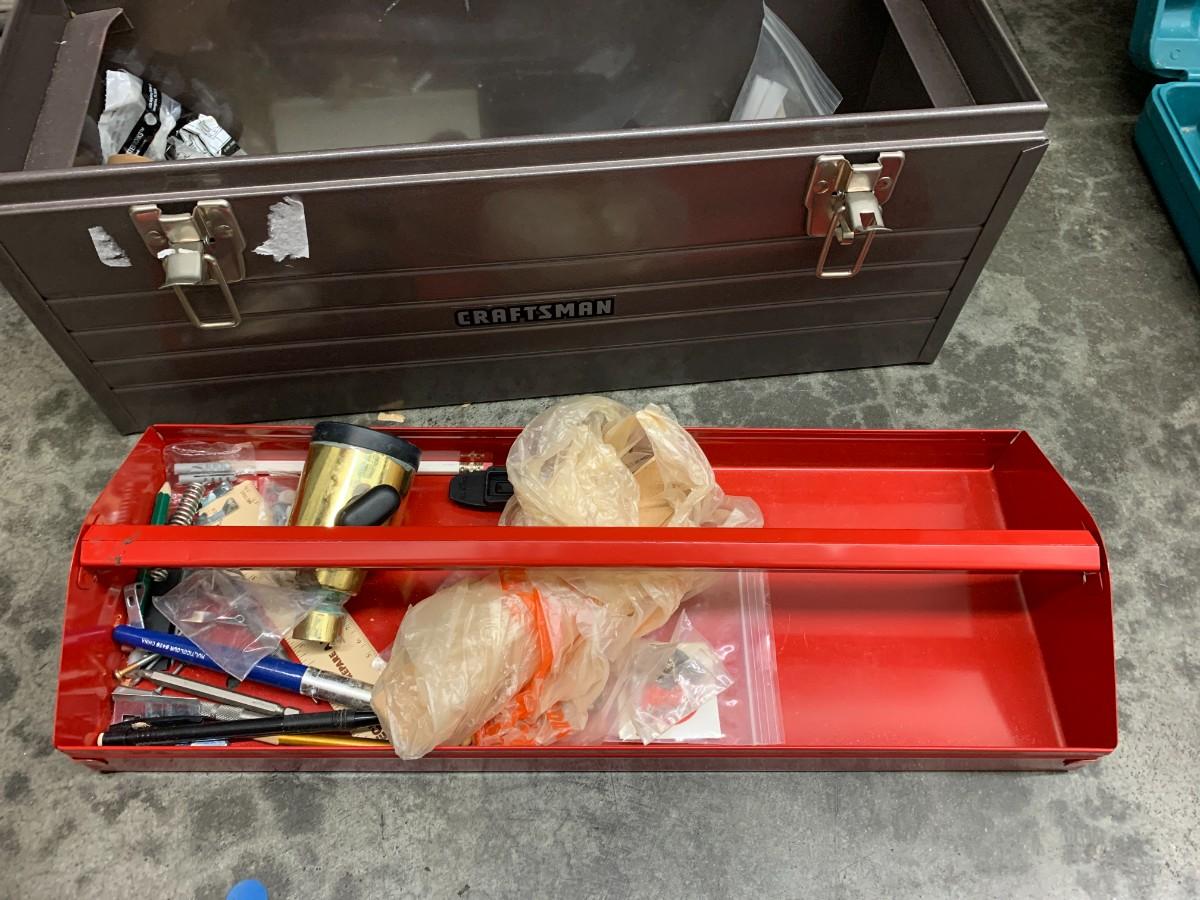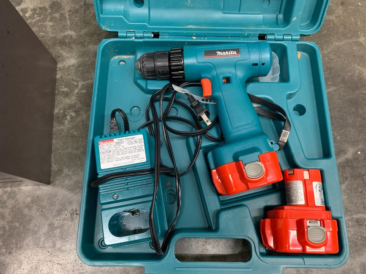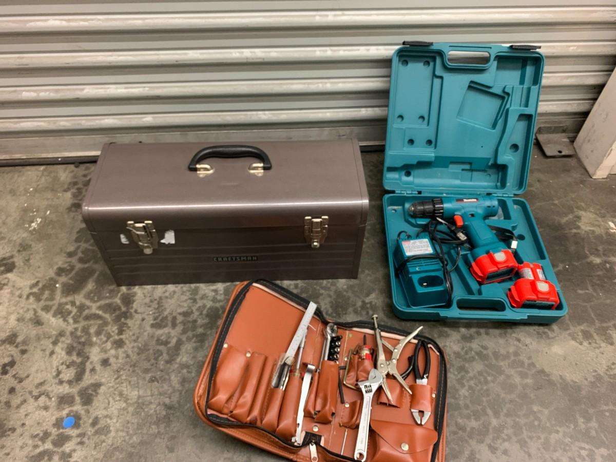 Makita cordless drill with charger and extra battery, hand tools, Craftsman vintage tool box. Not tested, not checked for parts.