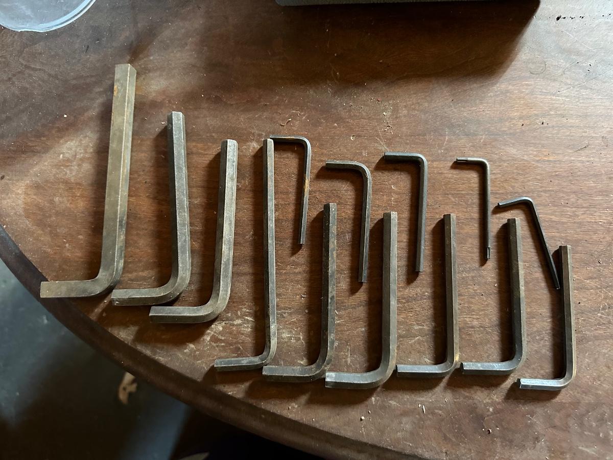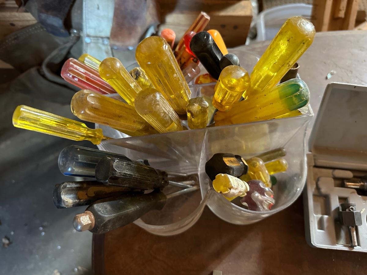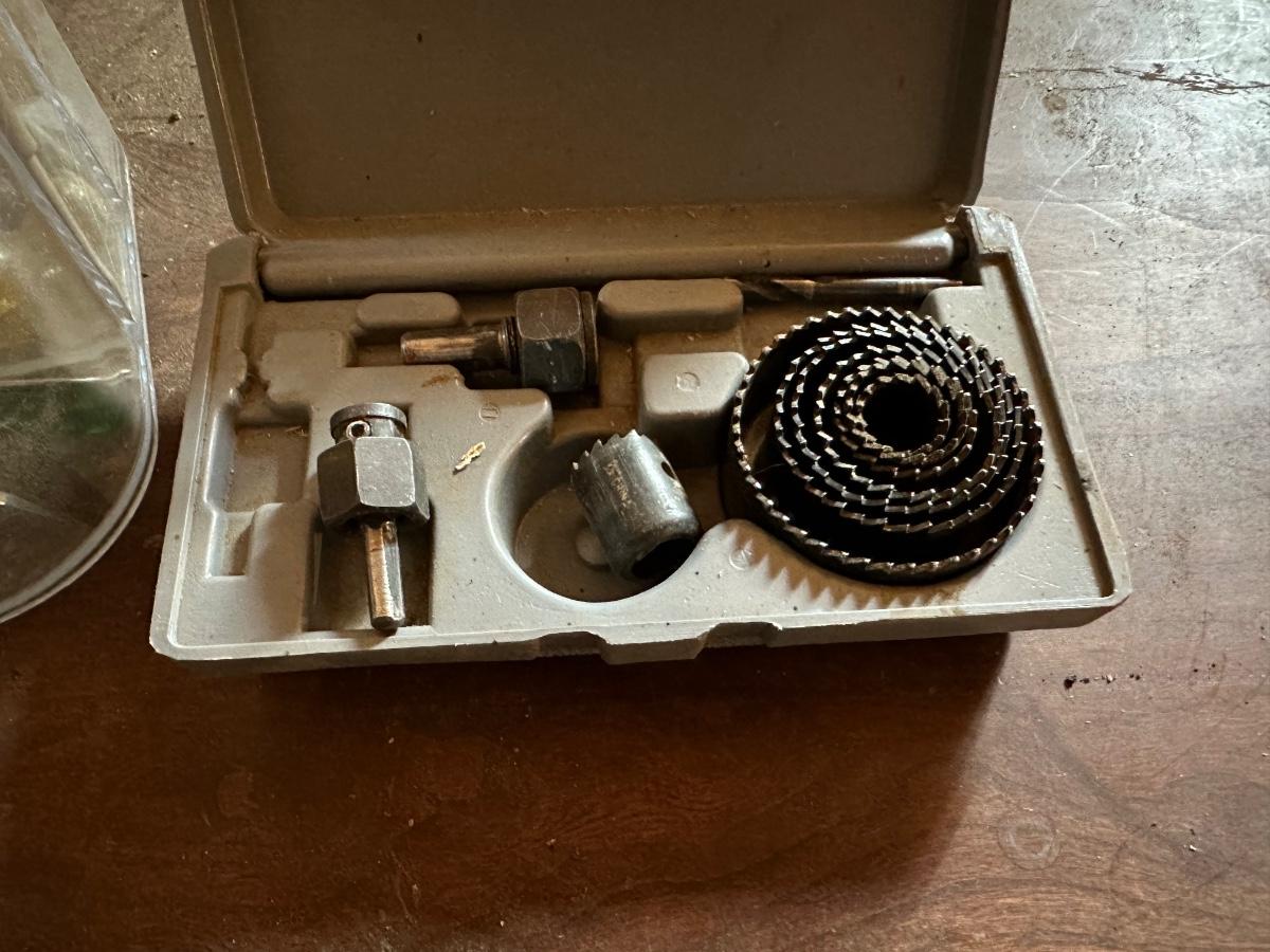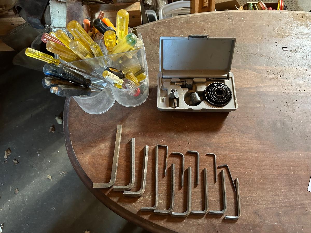 Large assortment of screwdrivers in plastic holder, Allen wrenches and large hole saw set in case.