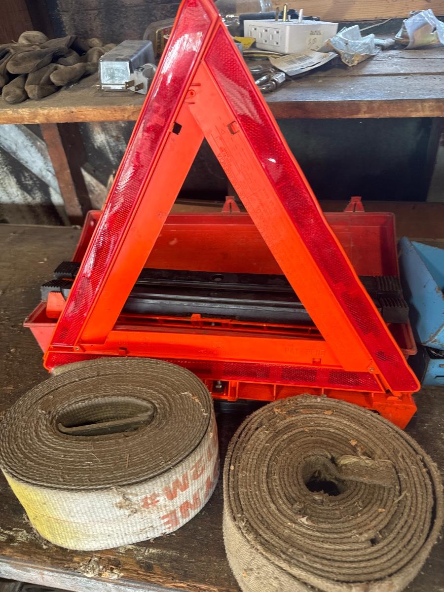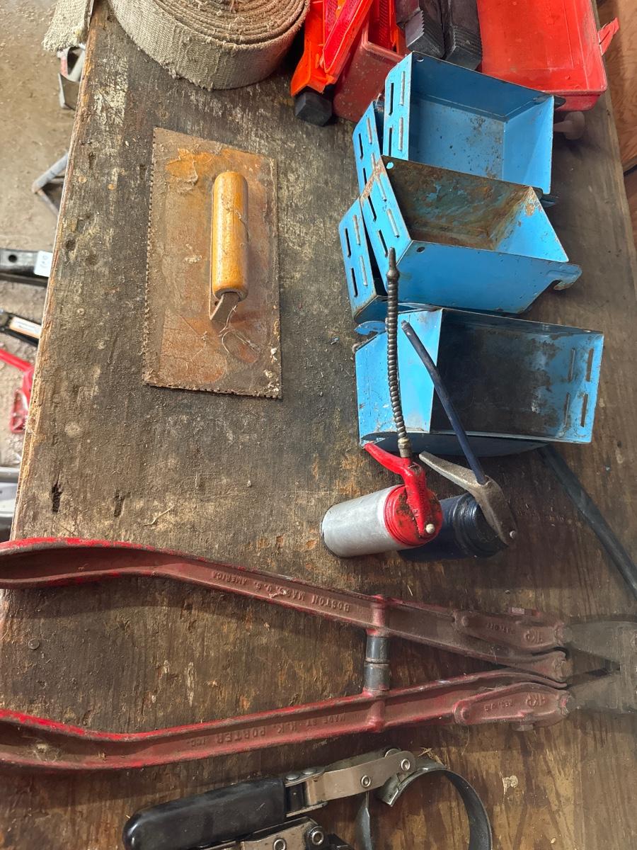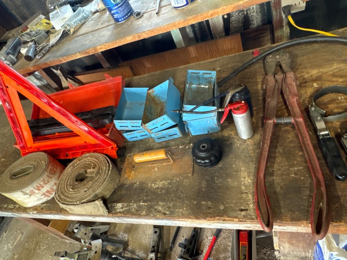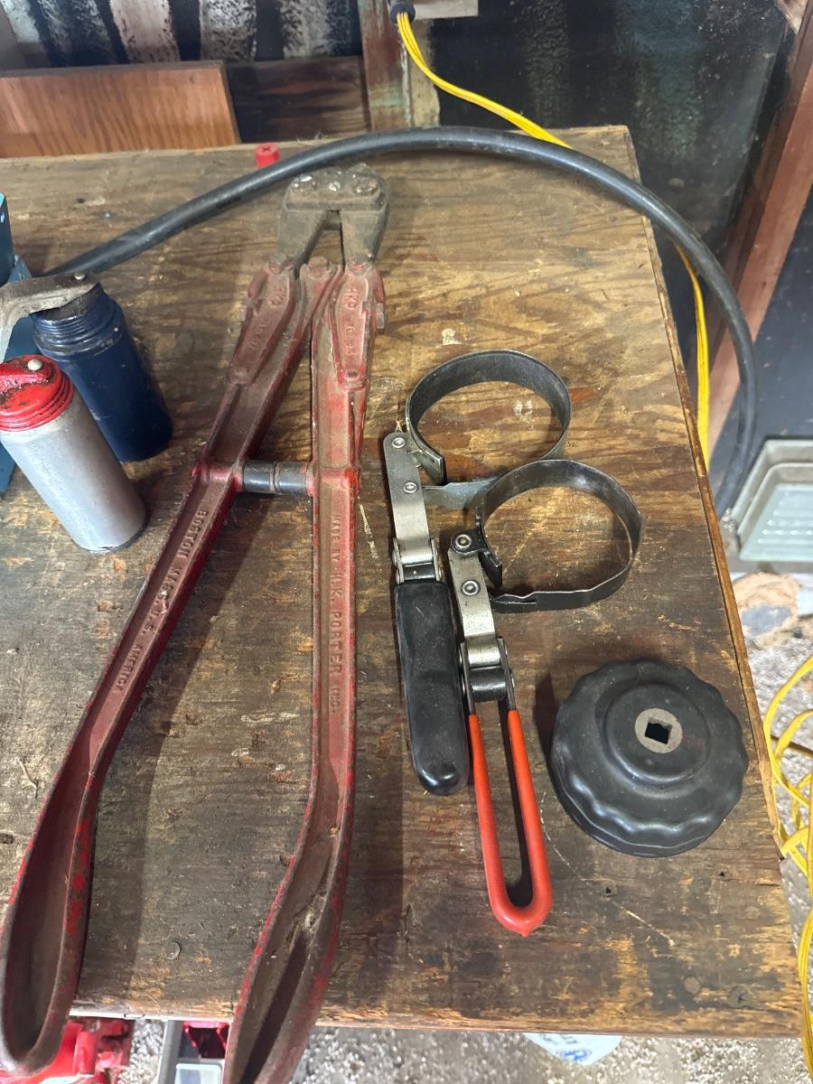 Bolt cutter three oil filter wrenches two oil cans six bolt bins concrete finisher troll two straps and highway triangles.