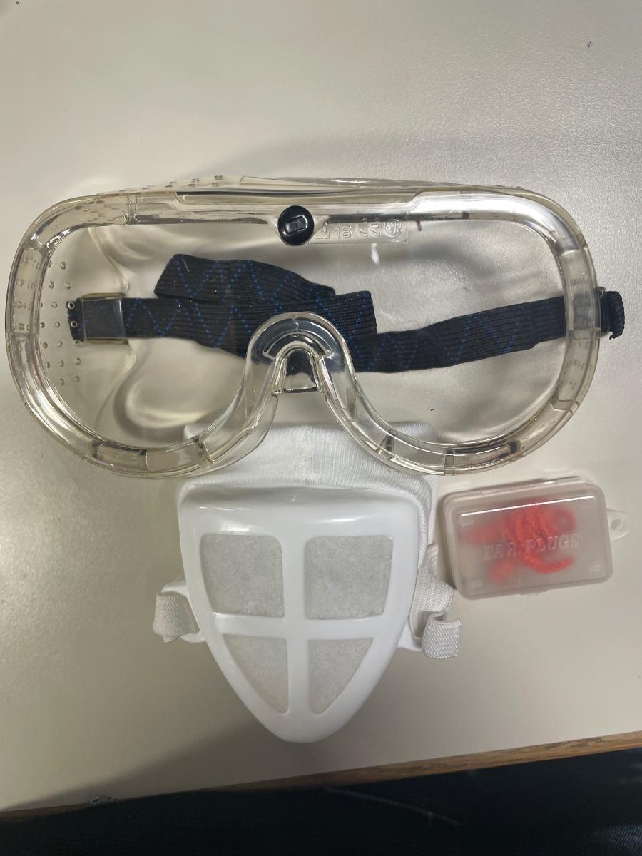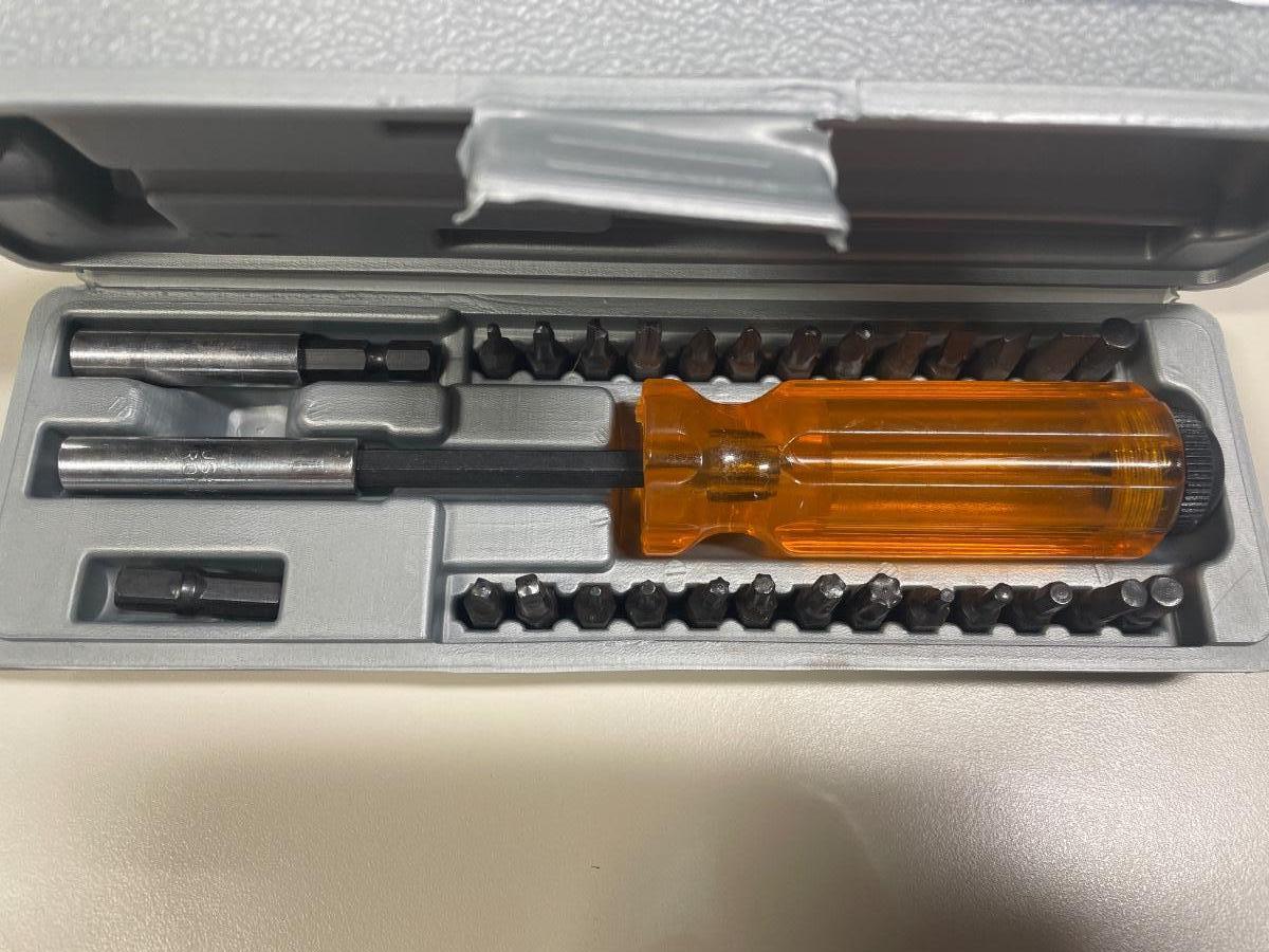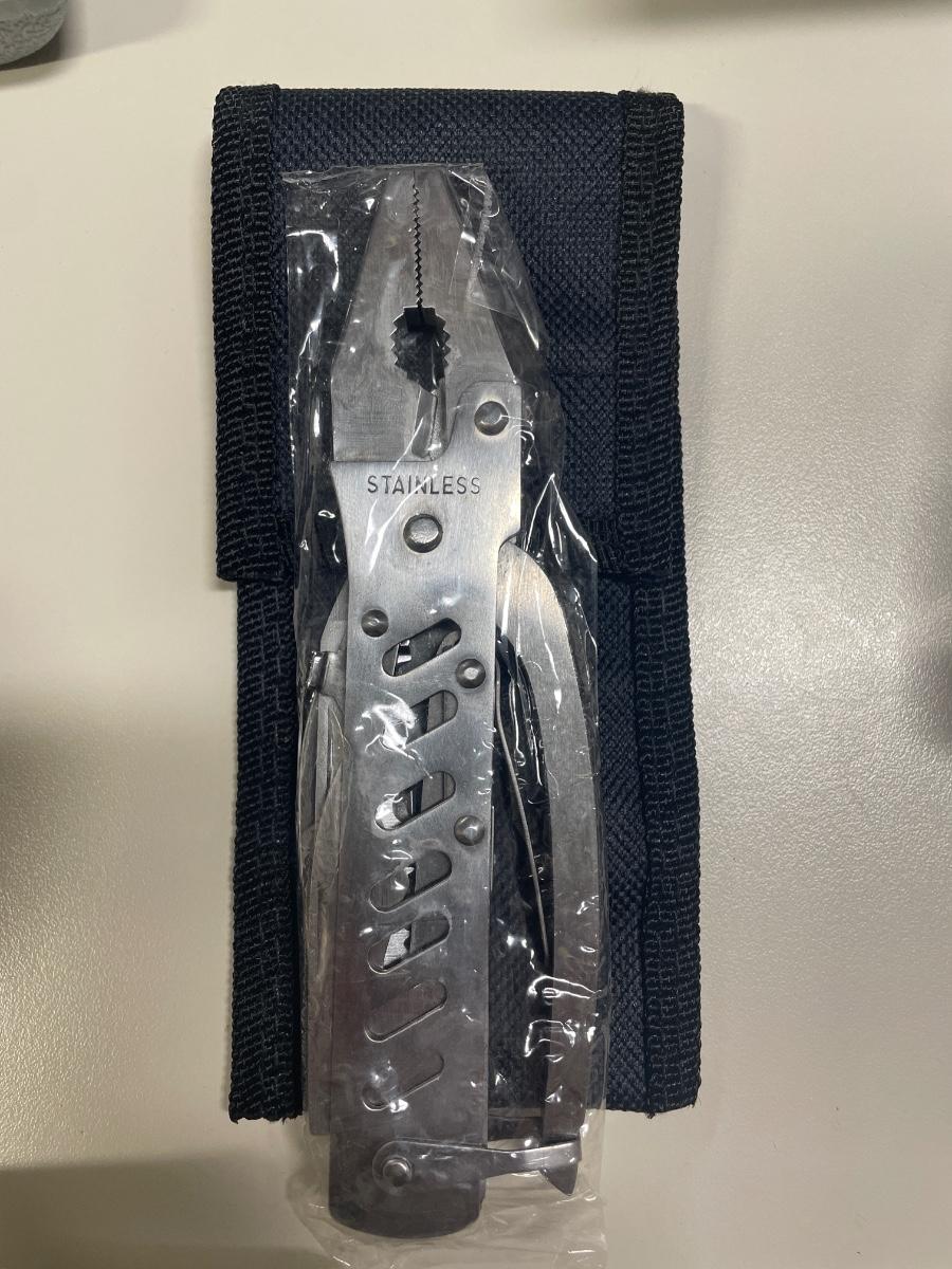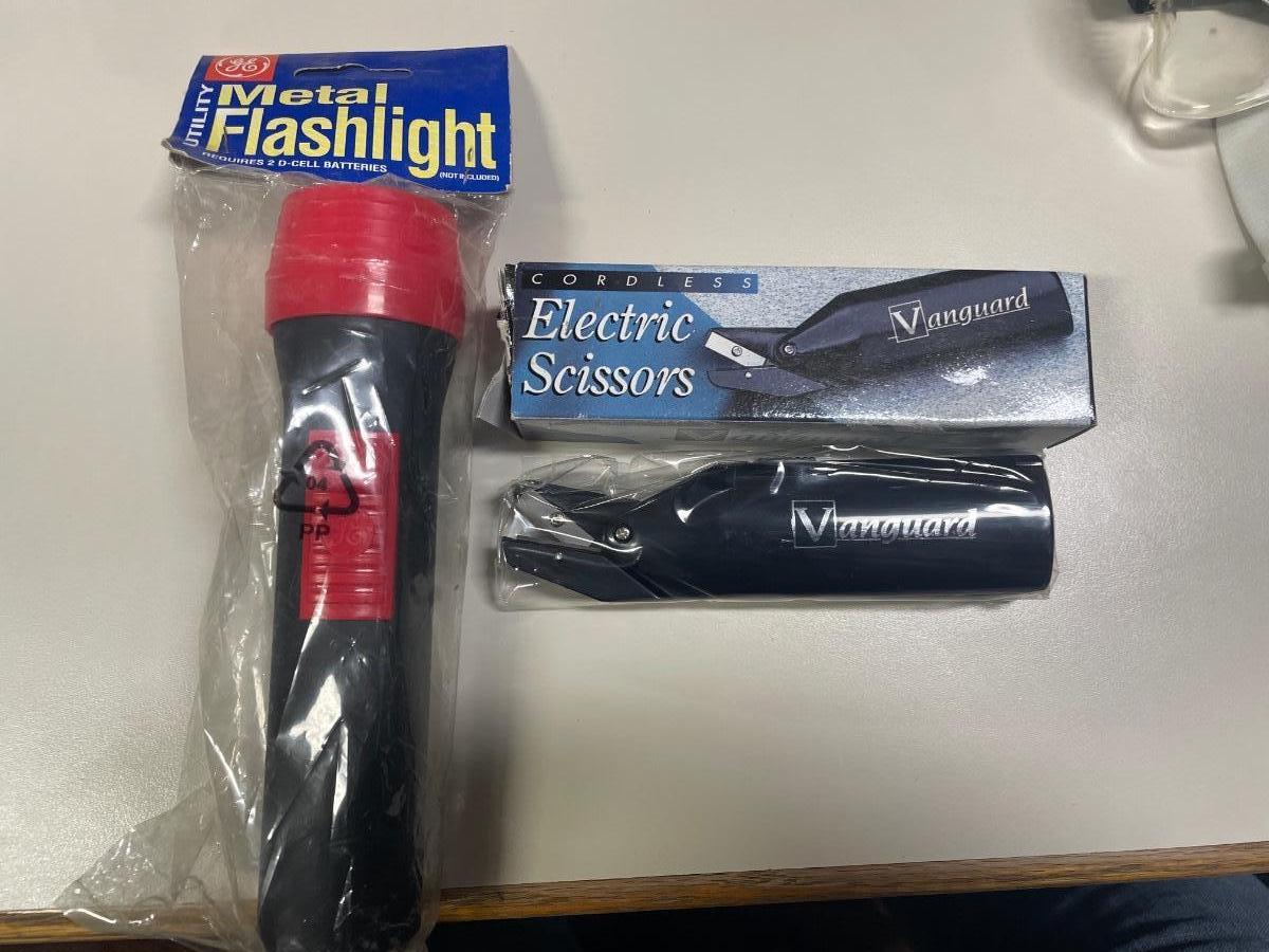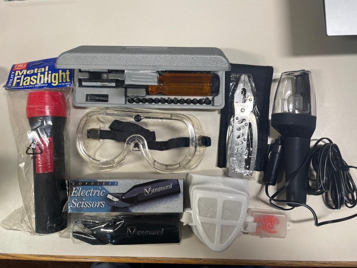 Includes new flashlight, screwdriver set, leather man’s tool, electric scissors, auto spot light that plugs into your cigarette lighter in your vehicle and a new safety mask and new ear plugs.