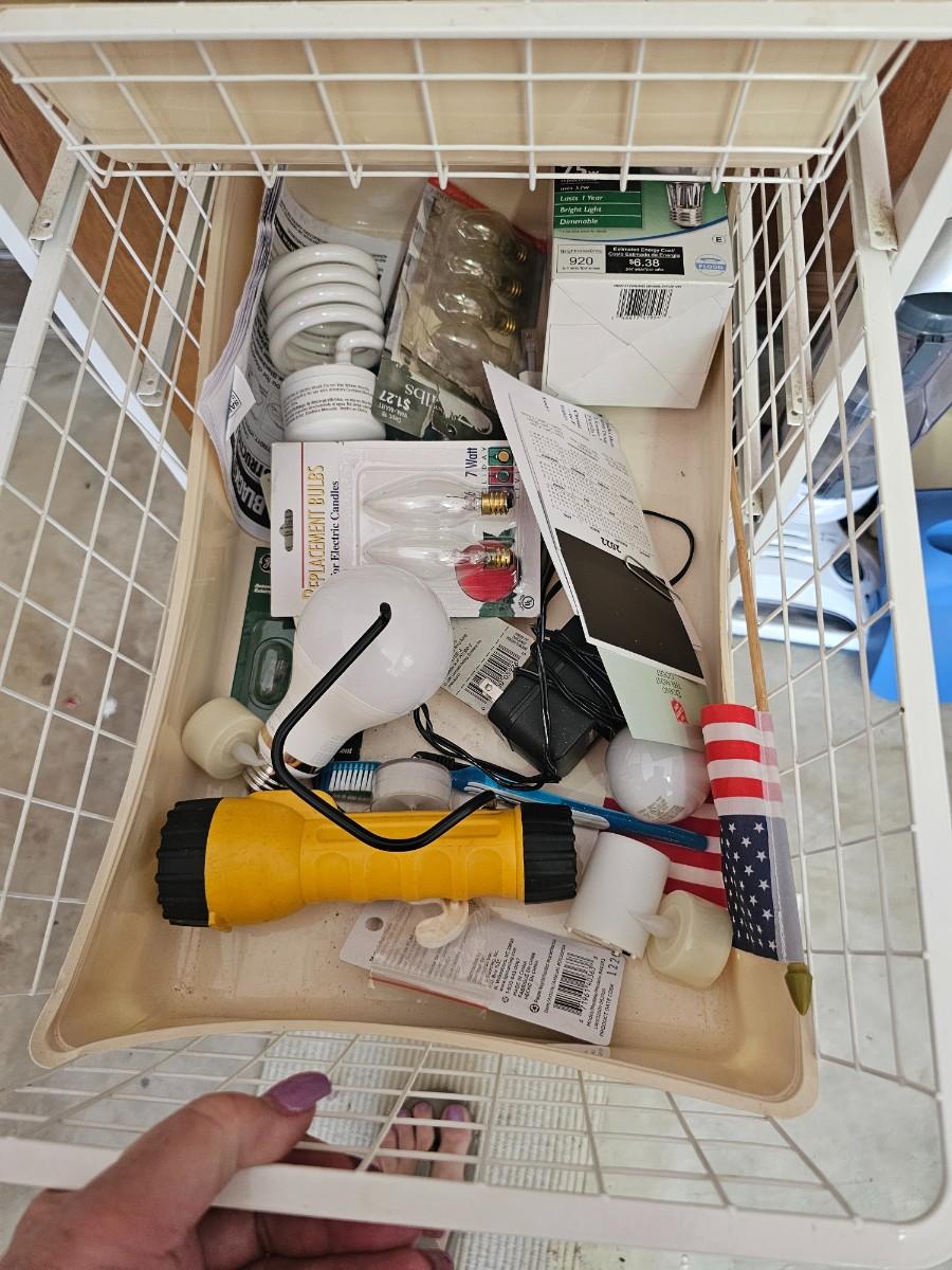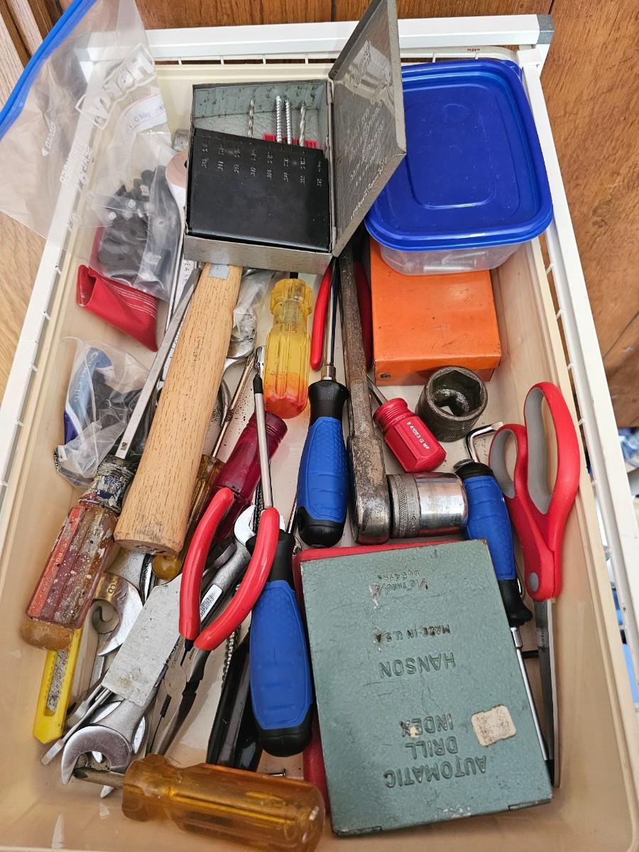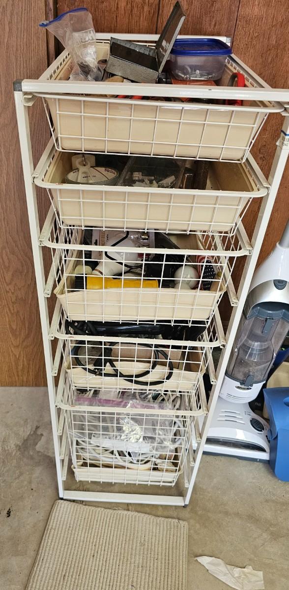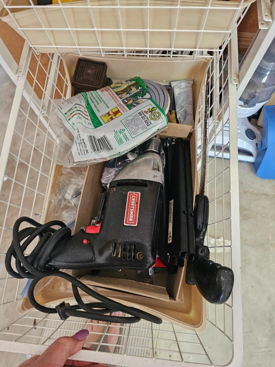 Assorted tools. storage container with baskets, Craftsman drill, extension cords,