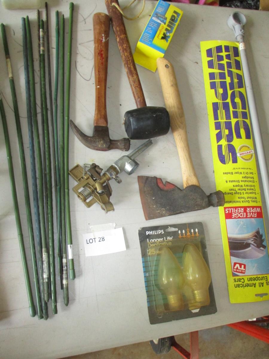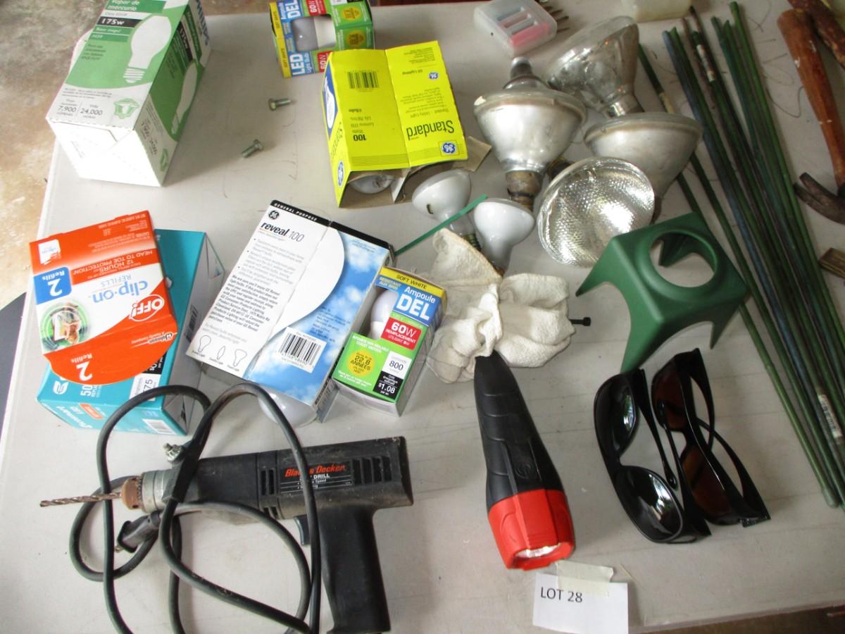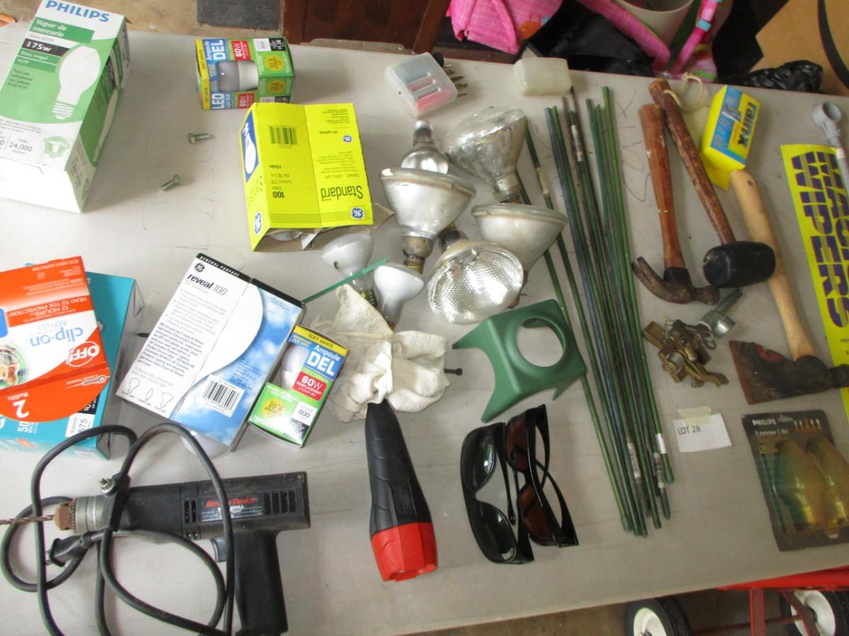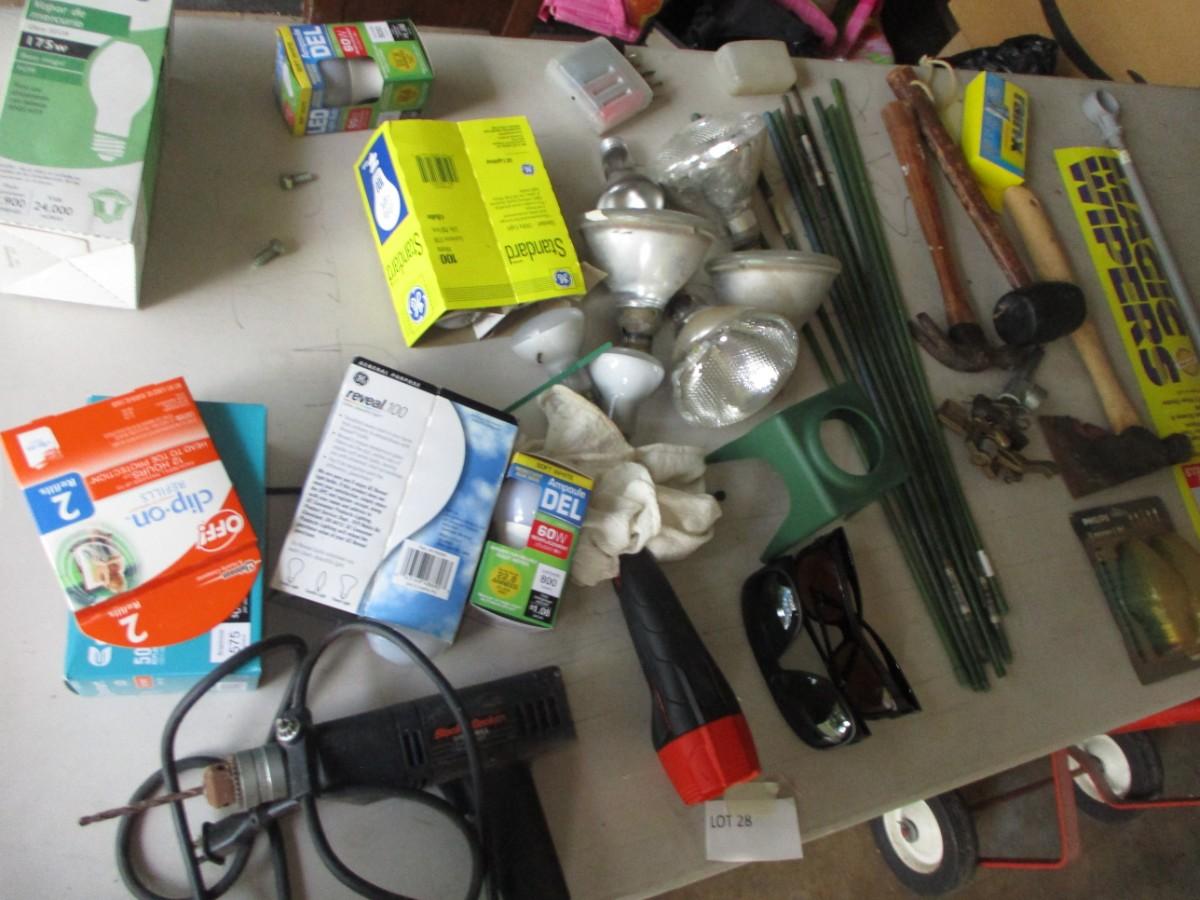 Hammer, Mallet, Axe, B&D Drill (works), Light bulbs, Garden Sticks