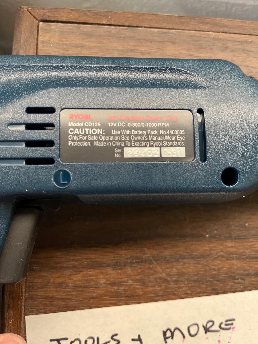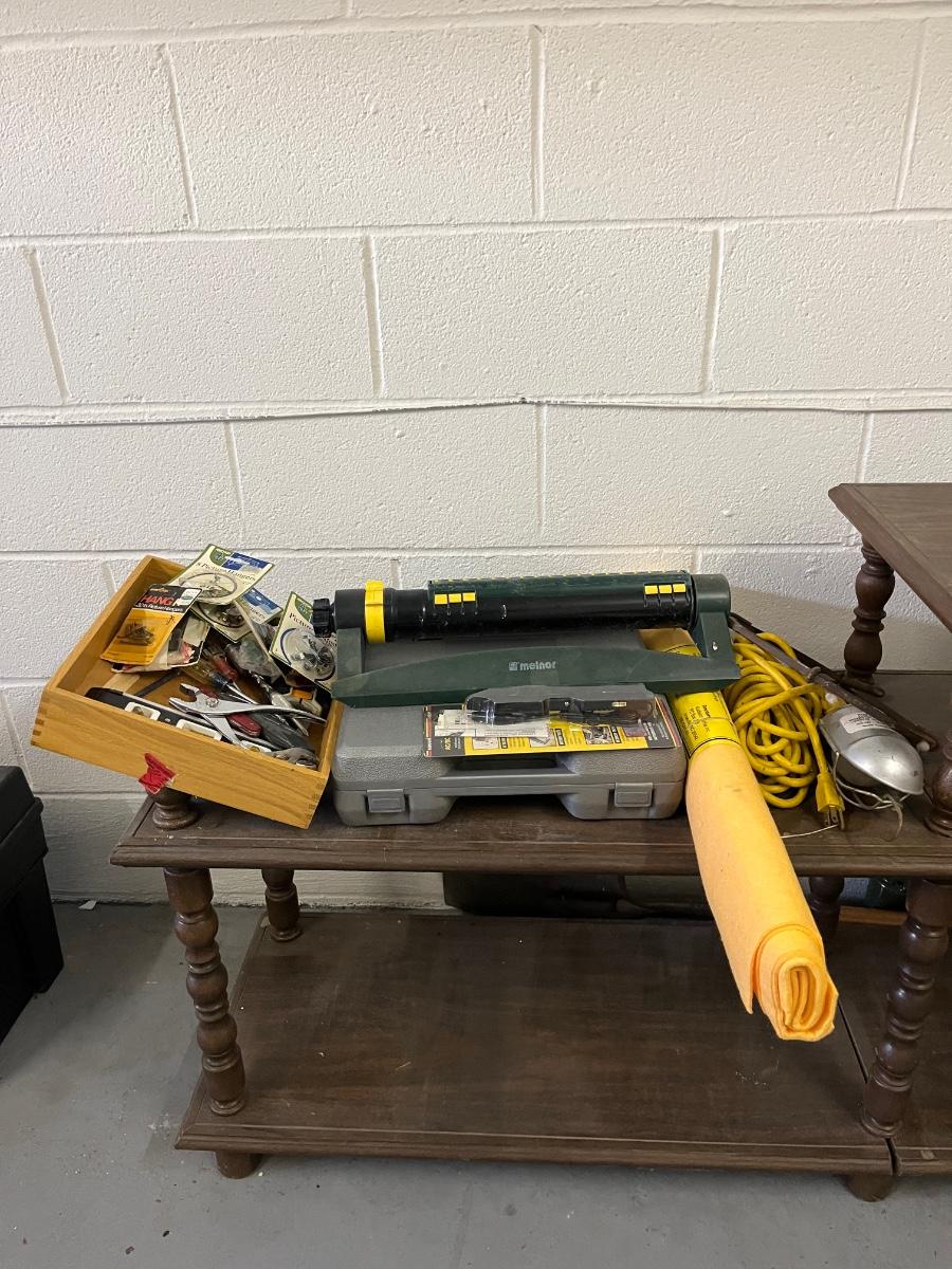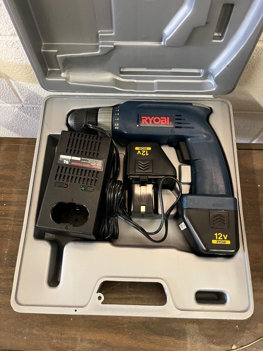 Lot includes a Ryobi 12v drill model # CD-125, Meinor plastic sprinkler, drop light that worked when tested. Also includes an assortment of hand tools and more. Drill powered on when tested.