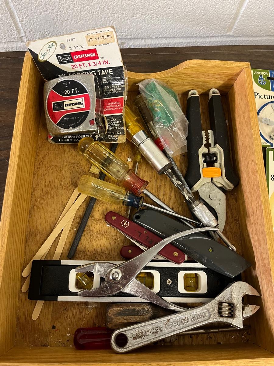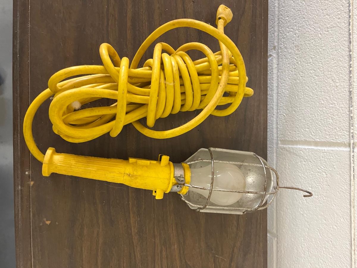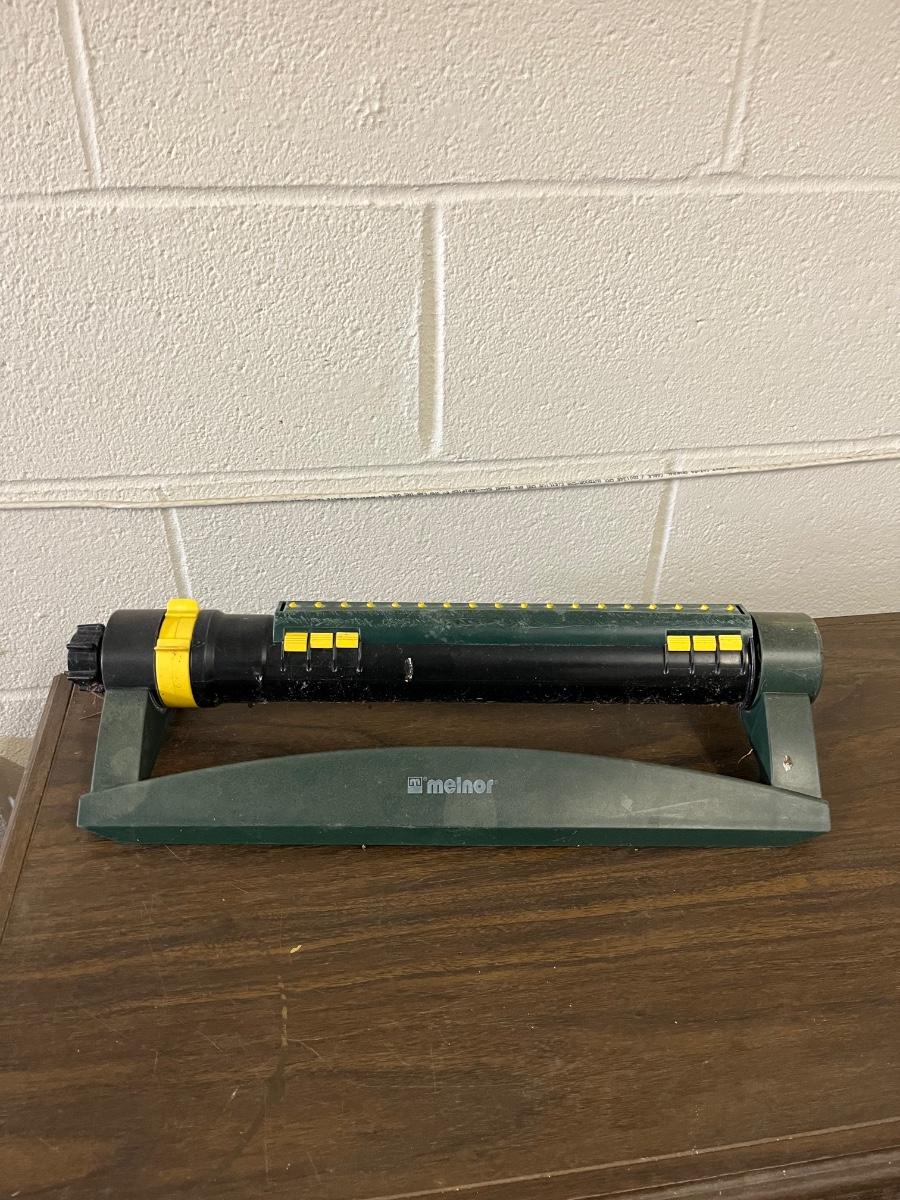 Lot includes a Ryobi 12v drill model # CD-125, Meinor plastic sprinkler, drop light that worked when tested. Also includes an assortment of hand tools and more. Drill powered on when tested.
