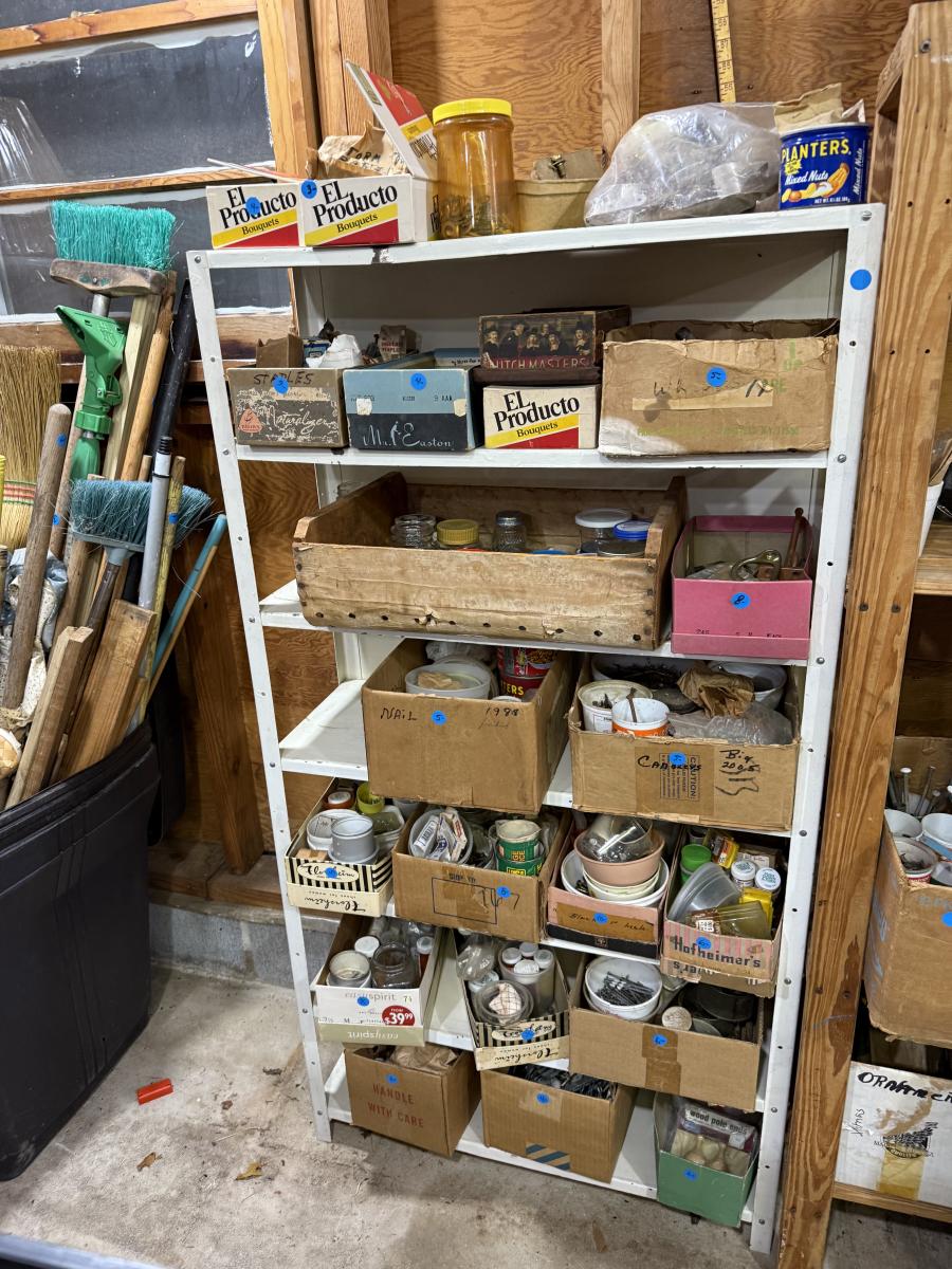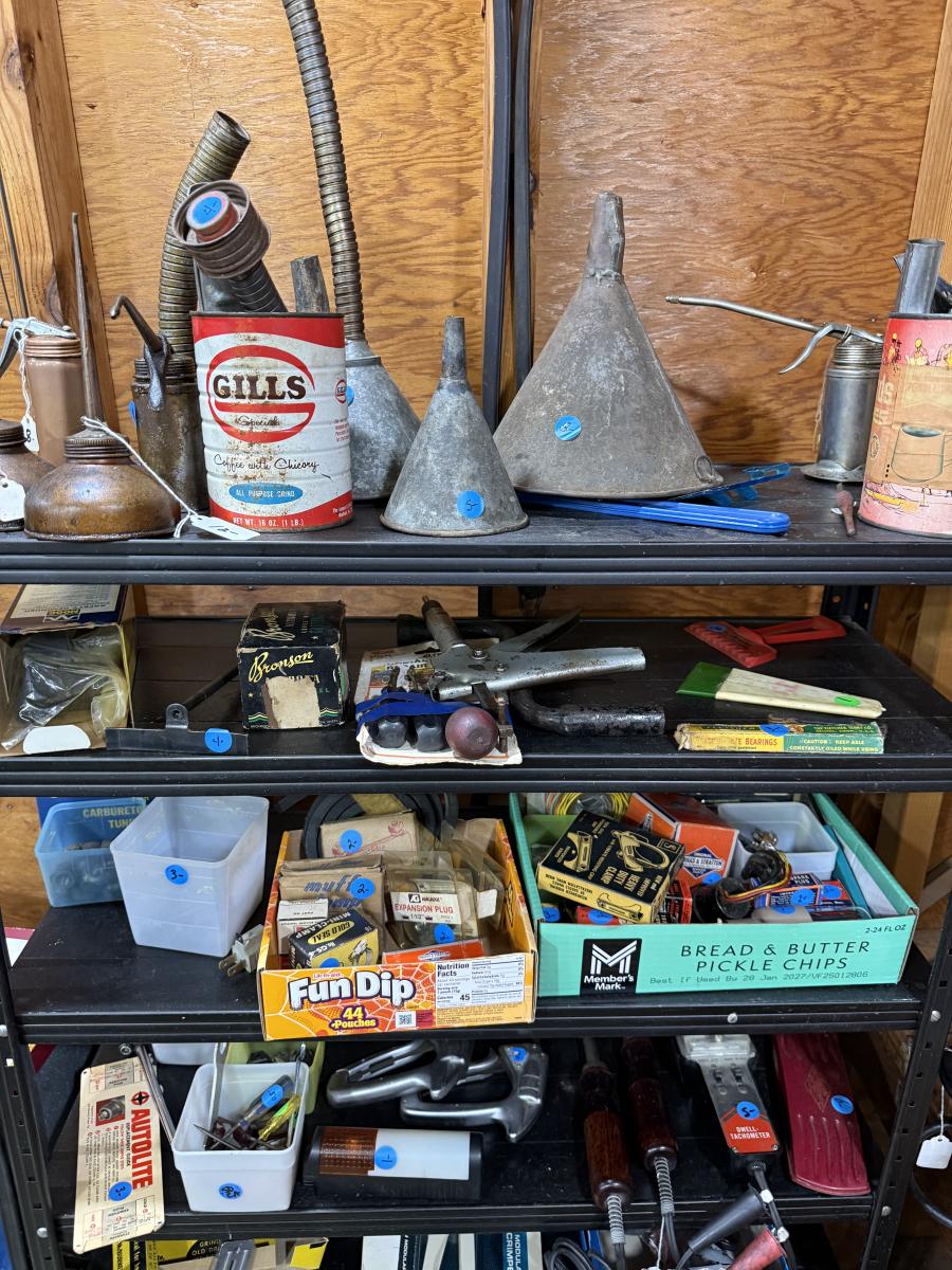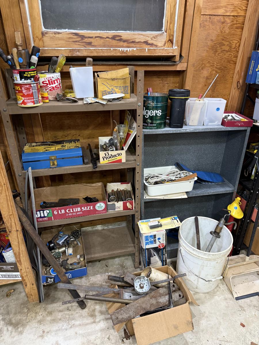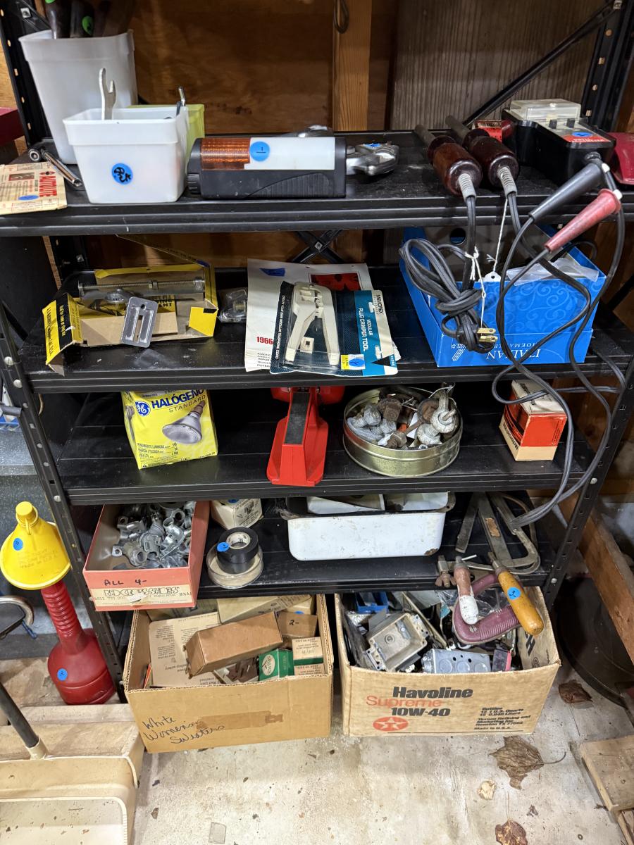 Garage 1: hand tools, hardware supplies, car stuff, electrical, plumbing, cooking, metal shelving, gas ruler, & more