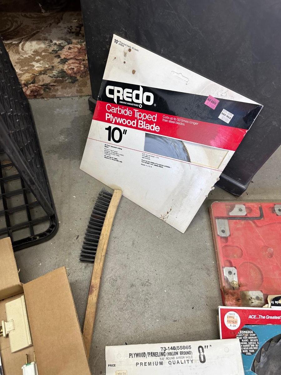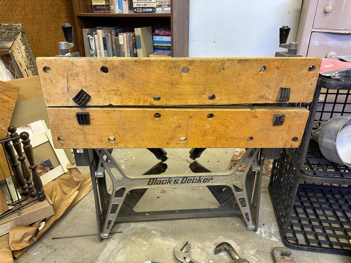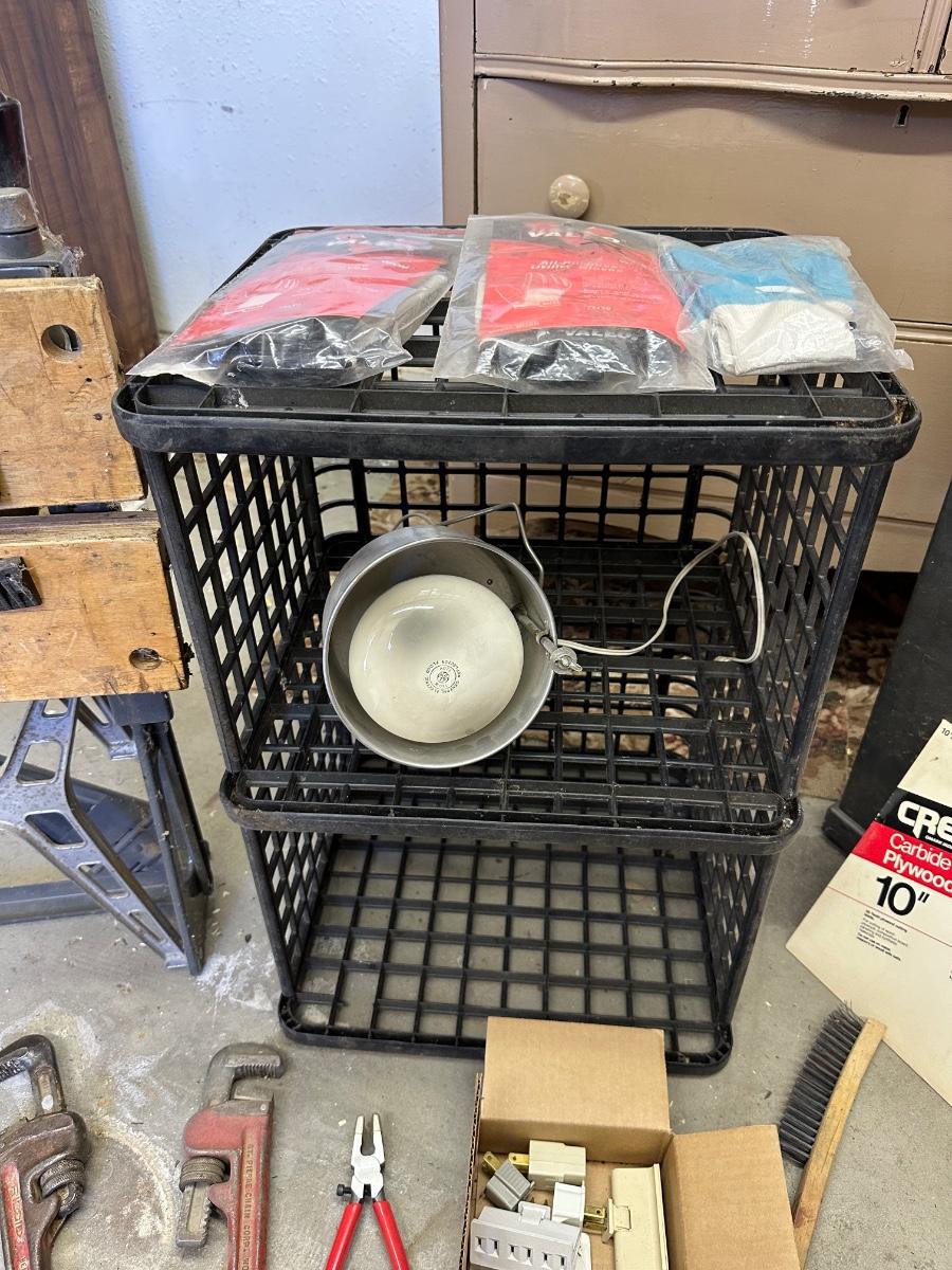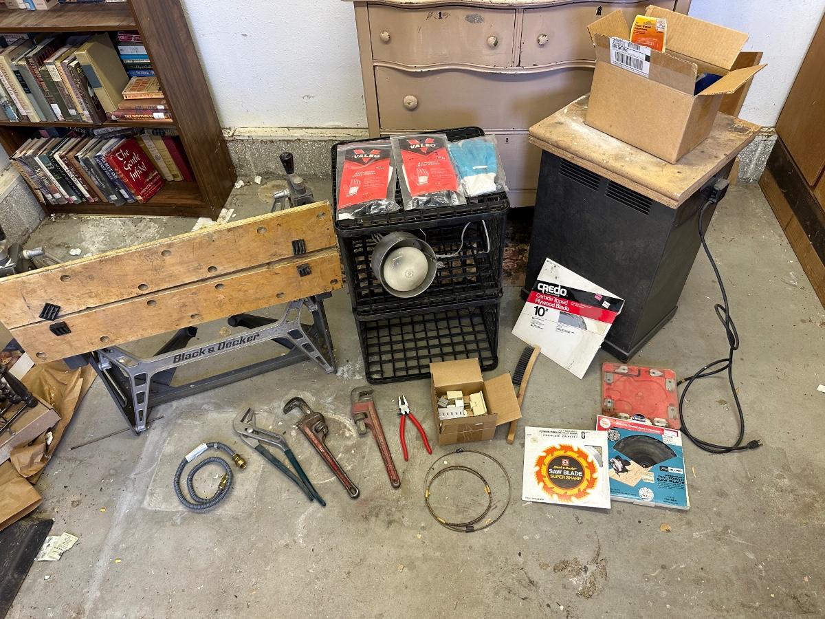 TOOLS, SAW HORSE, PLASTIC CRATES AND PLENTY OF MISC