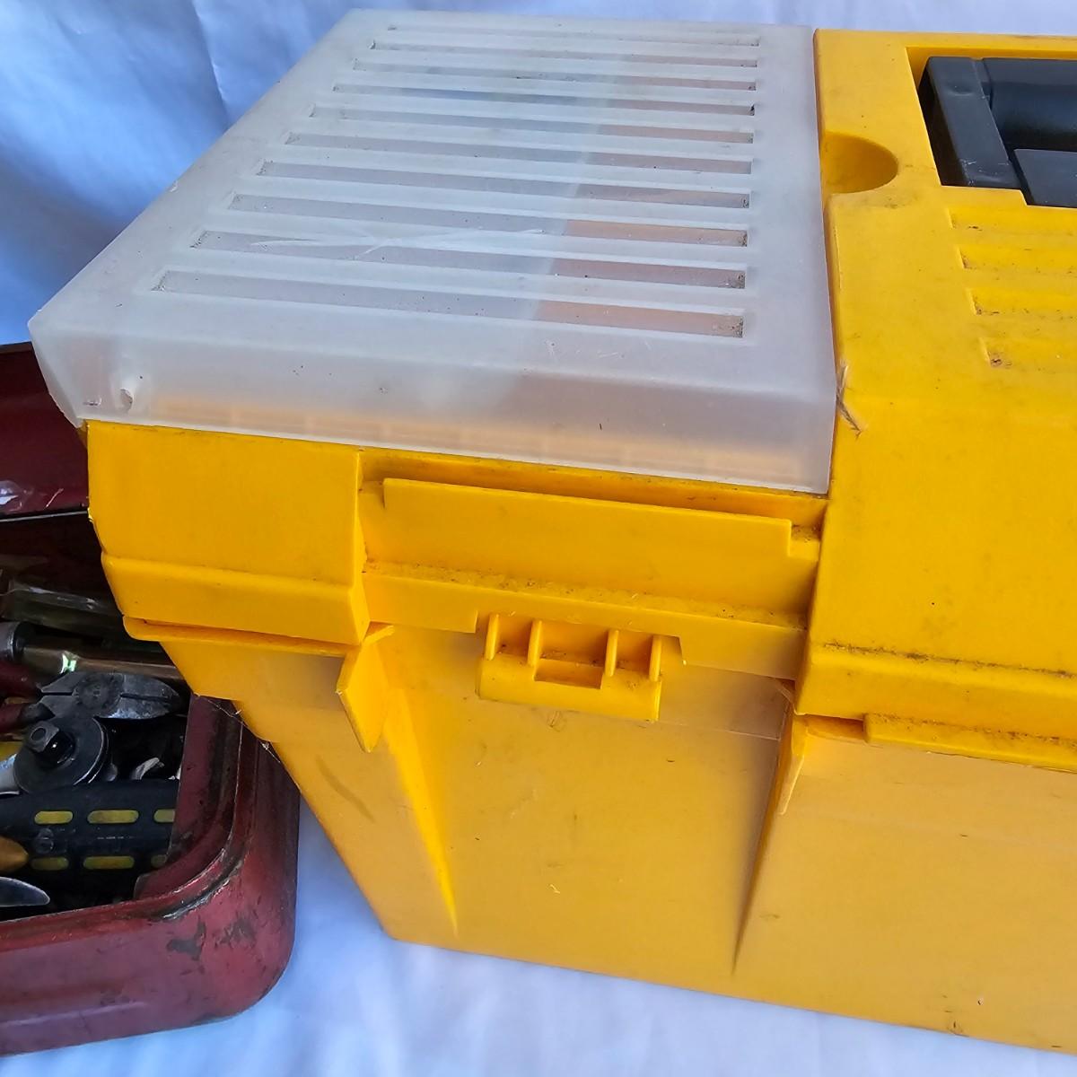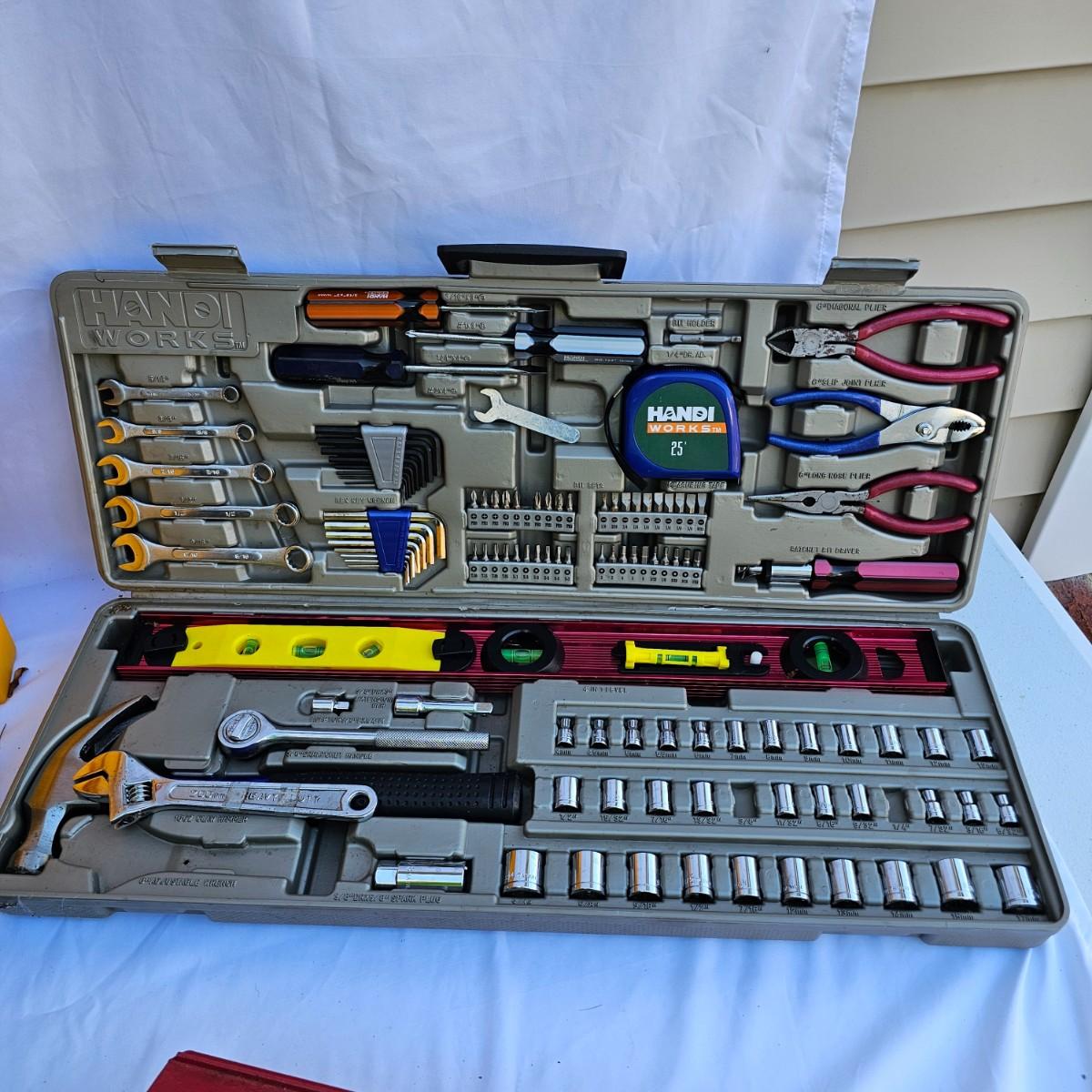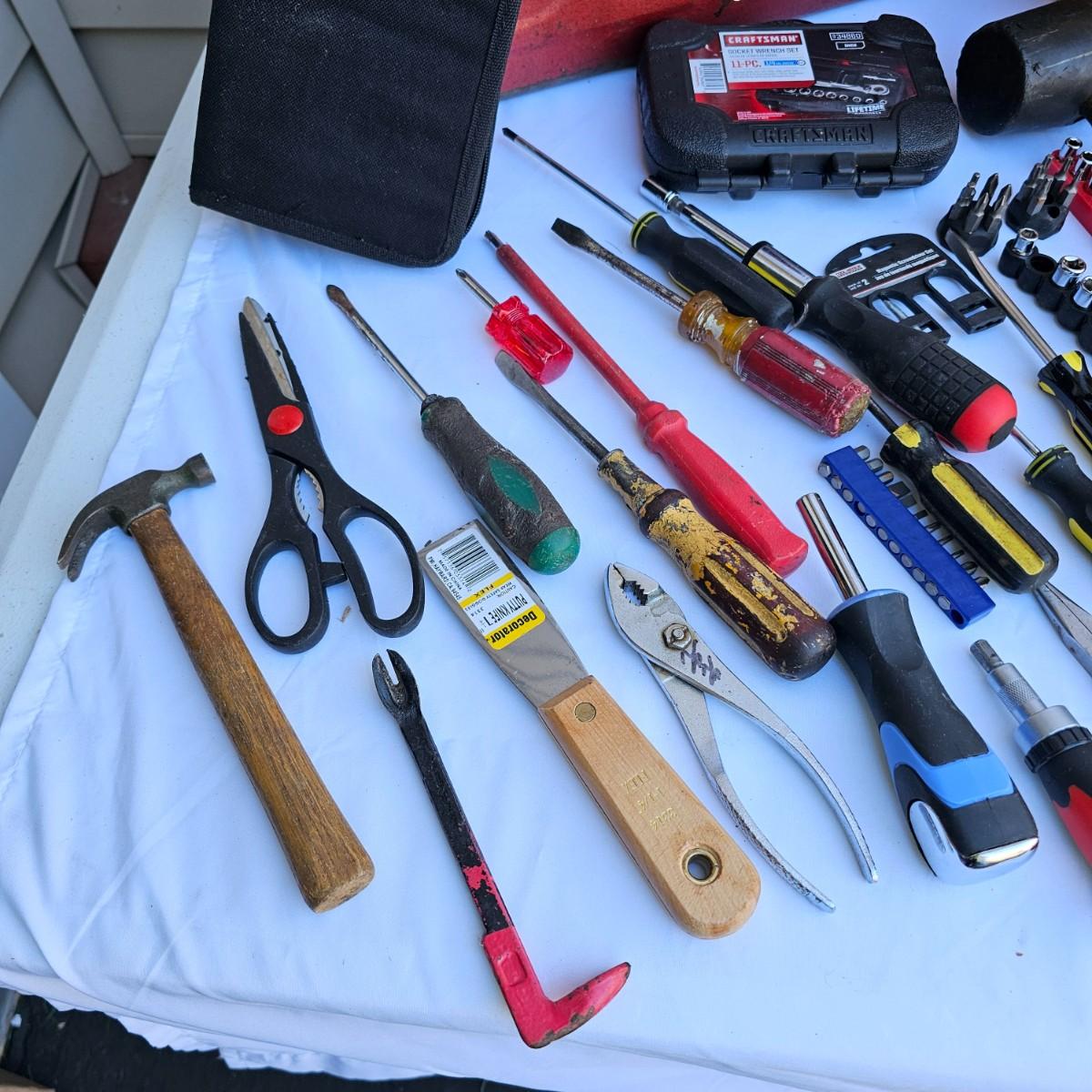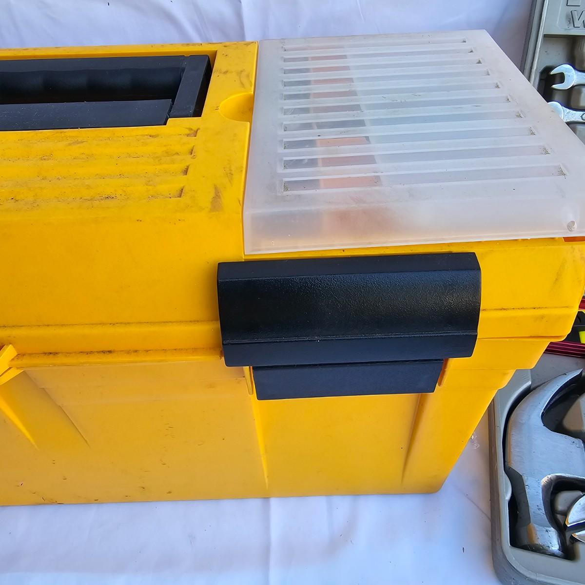 Four tool boxes full of assorted tools and also a large quantity of loose tools and items. One combination home kit with a good selection of everything. Screwdrivers, wrenches, pliers, hammers and more. One DeWalt 12v cordless drill, battery and charger, powered on when plugged in and charged. Sockets, allen wrenches and levels. Please note yellow tool box is missing one latch. See photos for details. Local pickup only.
