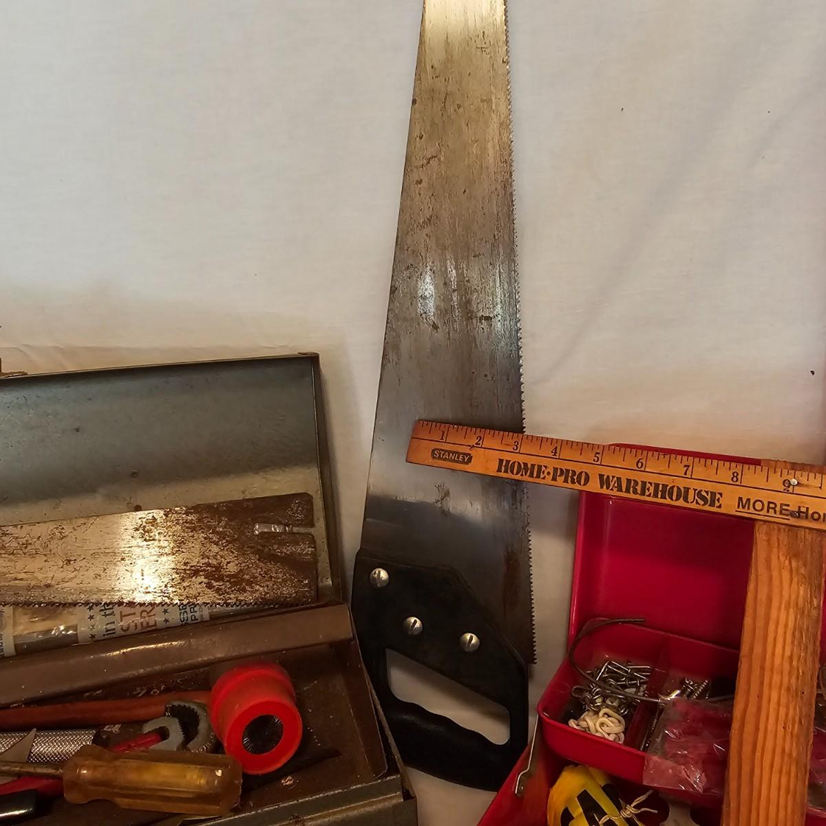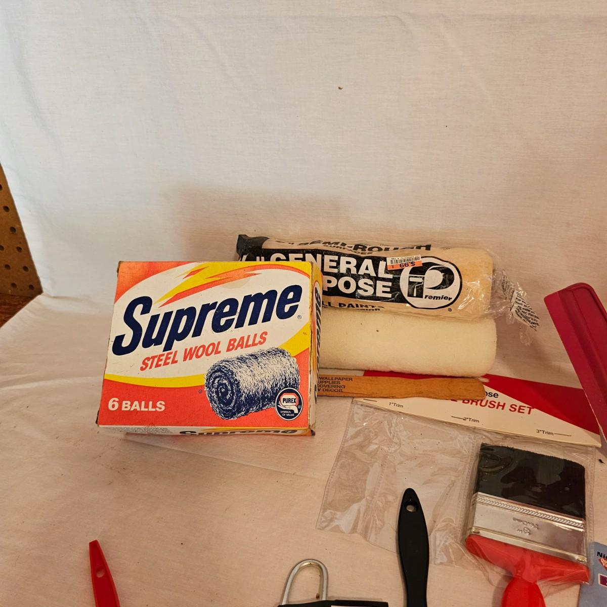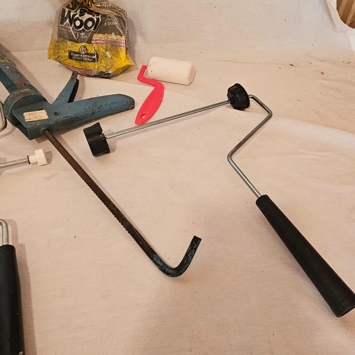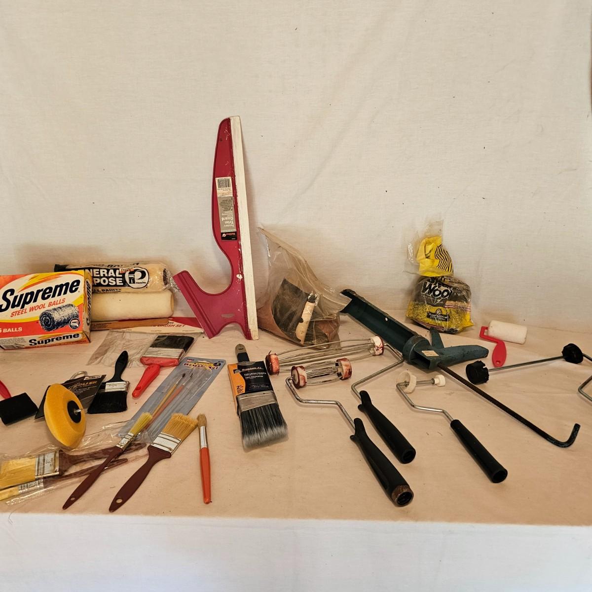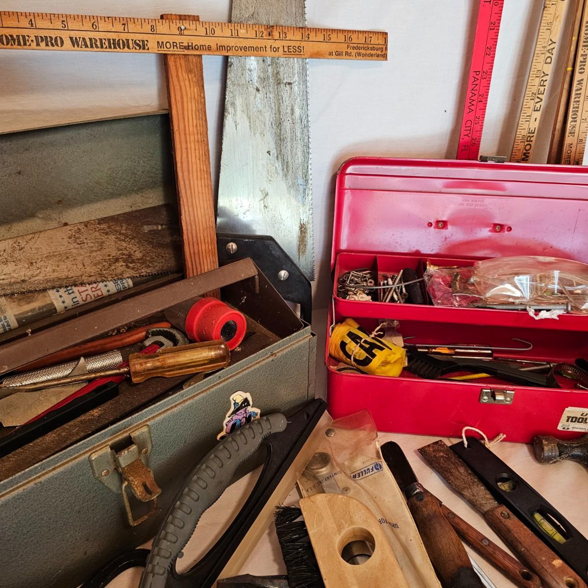 Large selection of tools and other items. Screwdrivers, pliers, wrenches, saws, staplers, more. Paint items include brushes, rollers and covers, sandpaper, steel wool. Two steel toolboxes for storage, large box is 16" x 7" x 8"H, smaller red is 13.5" x 7" x 6"H. See photos for details. Local pickup only.