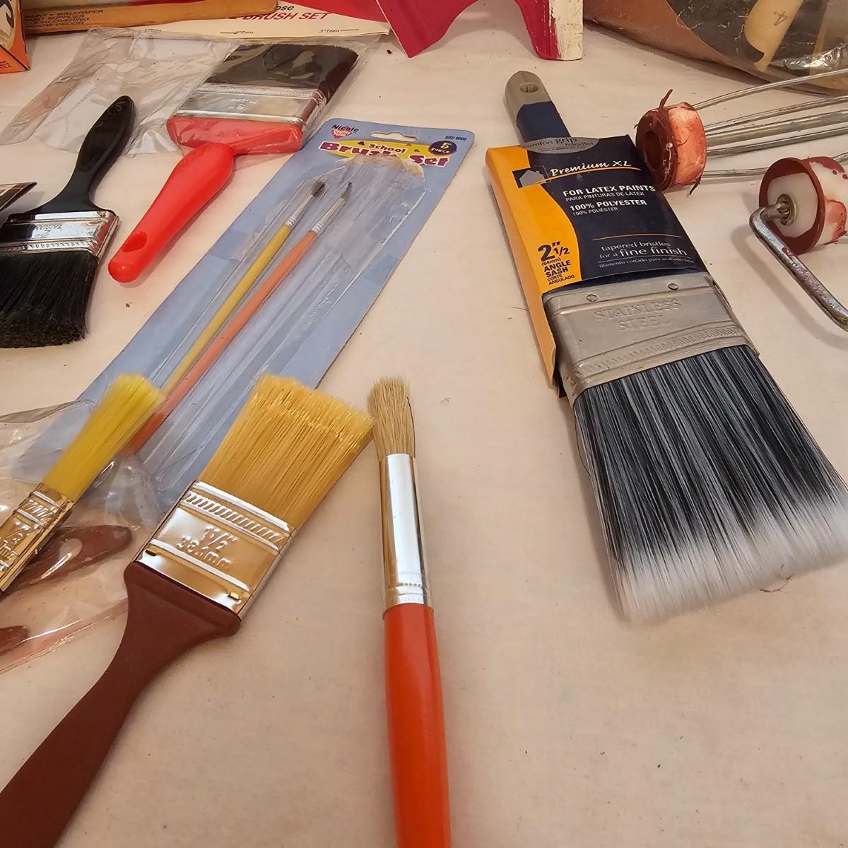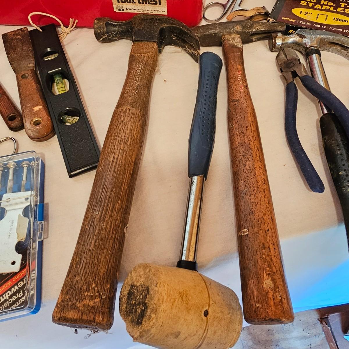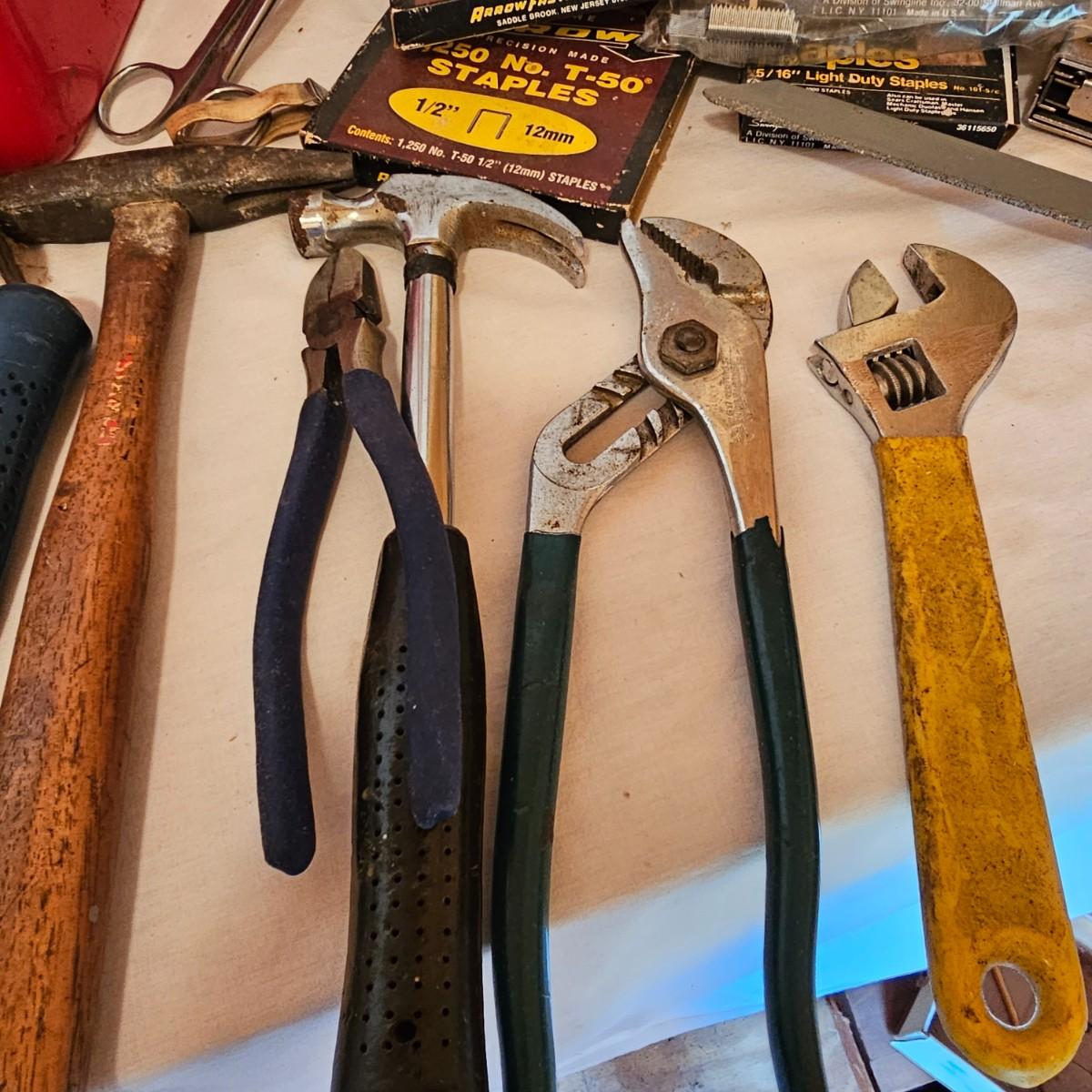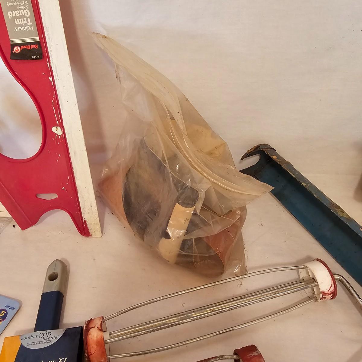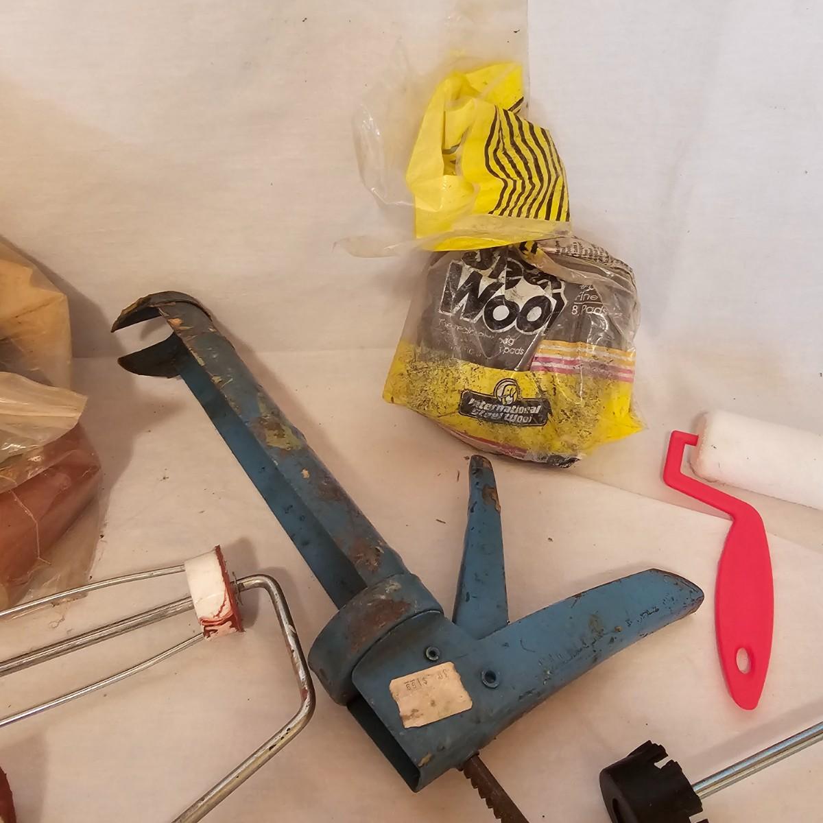 Large selection of tools and other items. Screwdrivers, pliers, wrenches, saws, staplers, more. Paint items include brushes, rollers and covers, sandpaper, steel wool. Two steel toolboxes for storage, large box is 16" x 7" x 8"H, smaller red is 13.5" x 7" x 6"H. See photos for details. Local pickup only.