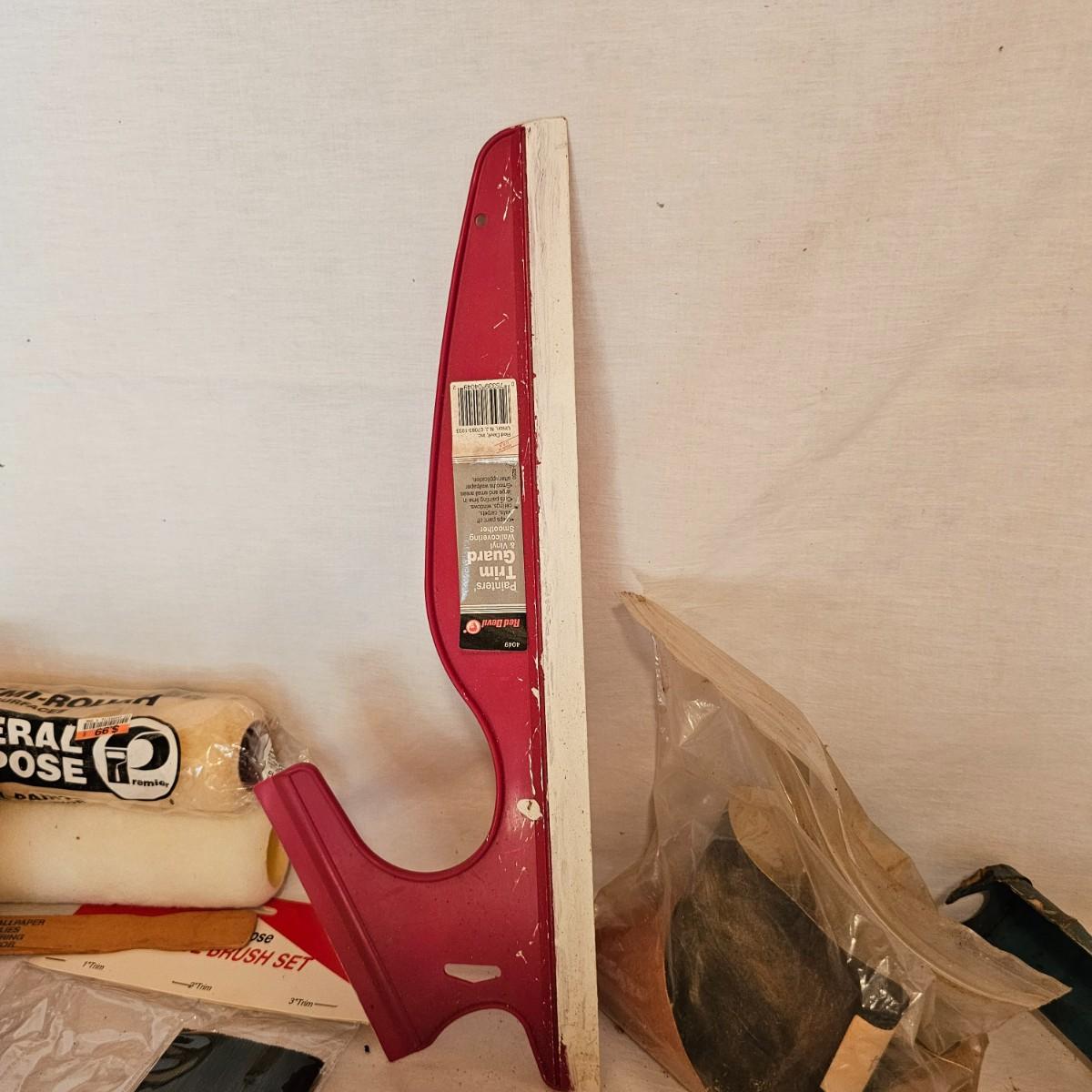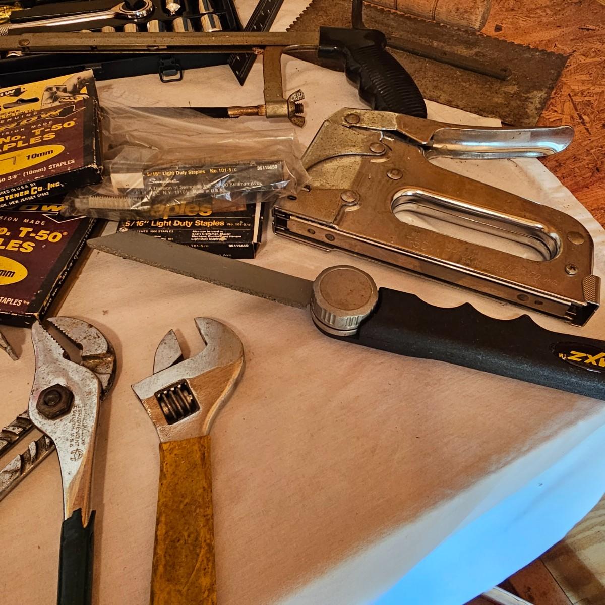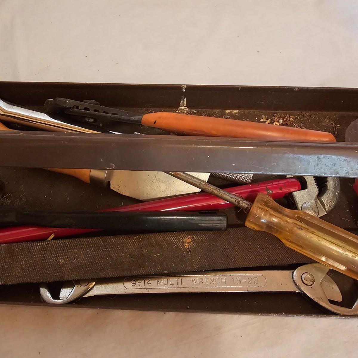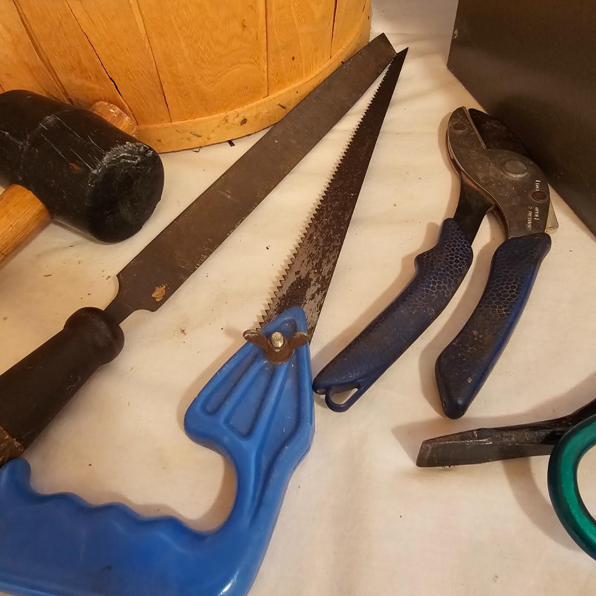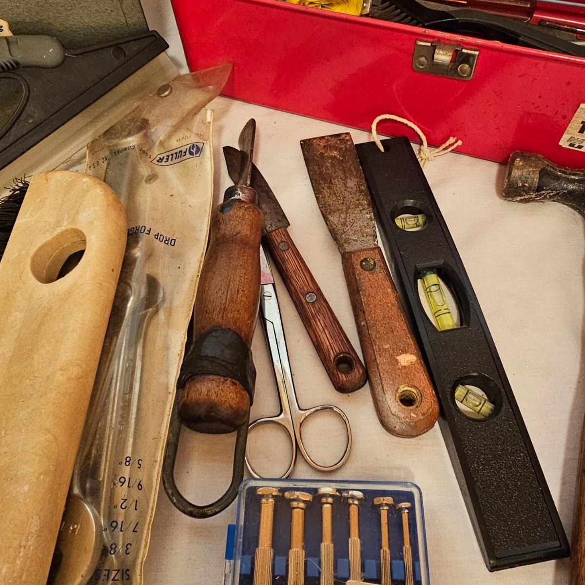 Large selection of tools and other items. Screwdrivers, pliers, wrenches, saws, staplers, more. Paint items include brushes, rollers and covers, sandpaper, steel wool. Two steel toolboxes for storage, large box is 16" x 7" x 8"H, smaller red is 13.5" x 7" x 6"H. See photos for details. Local pickup only.