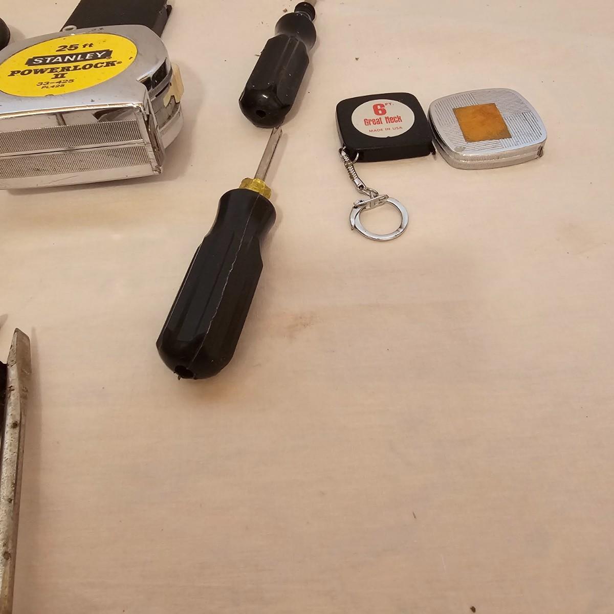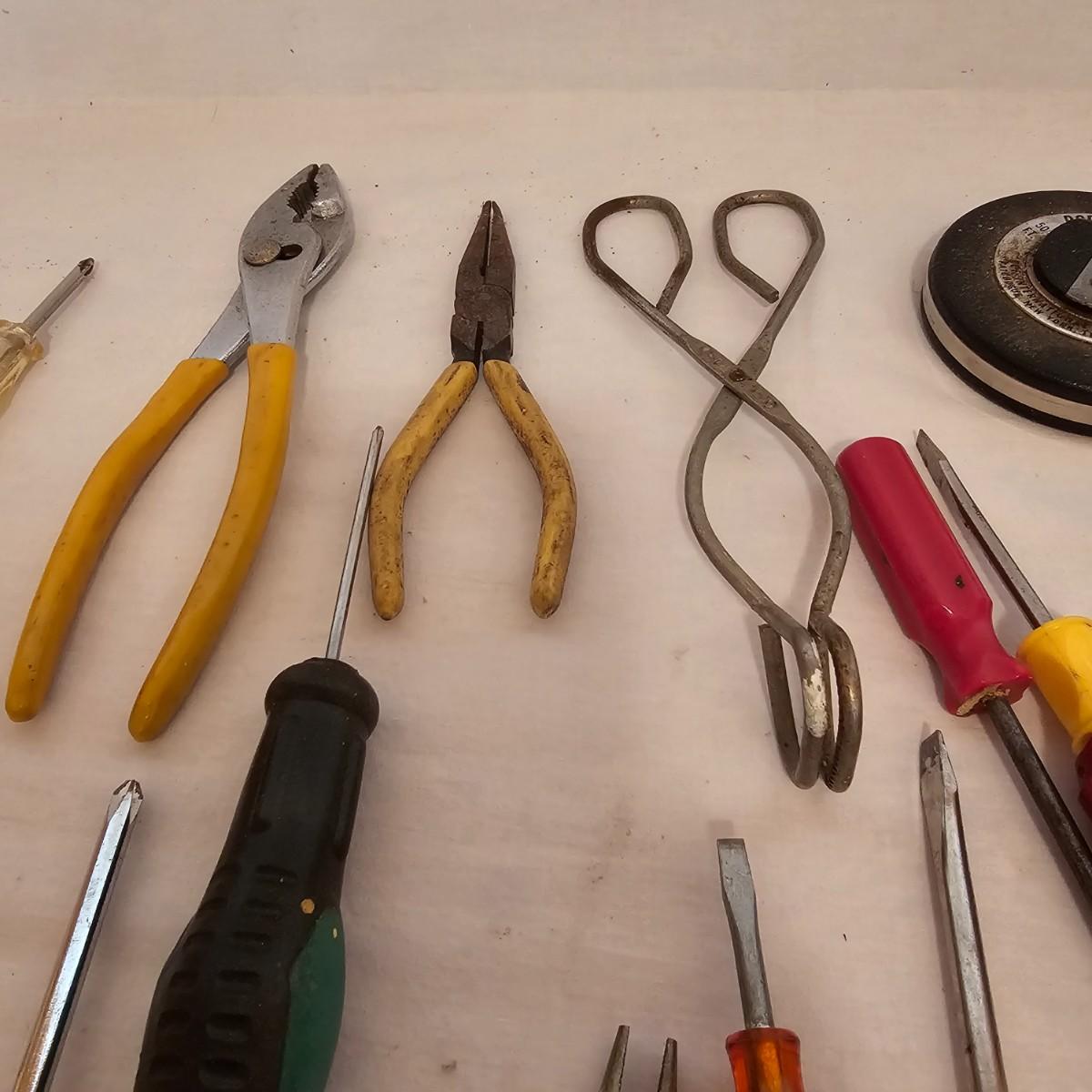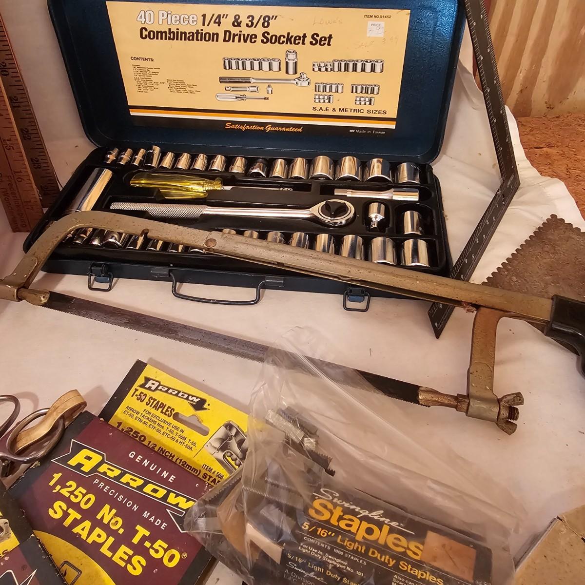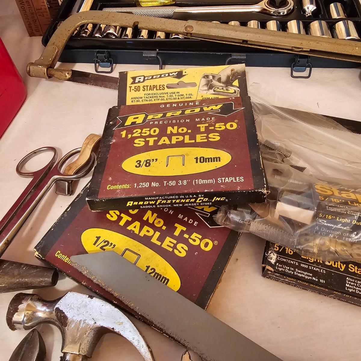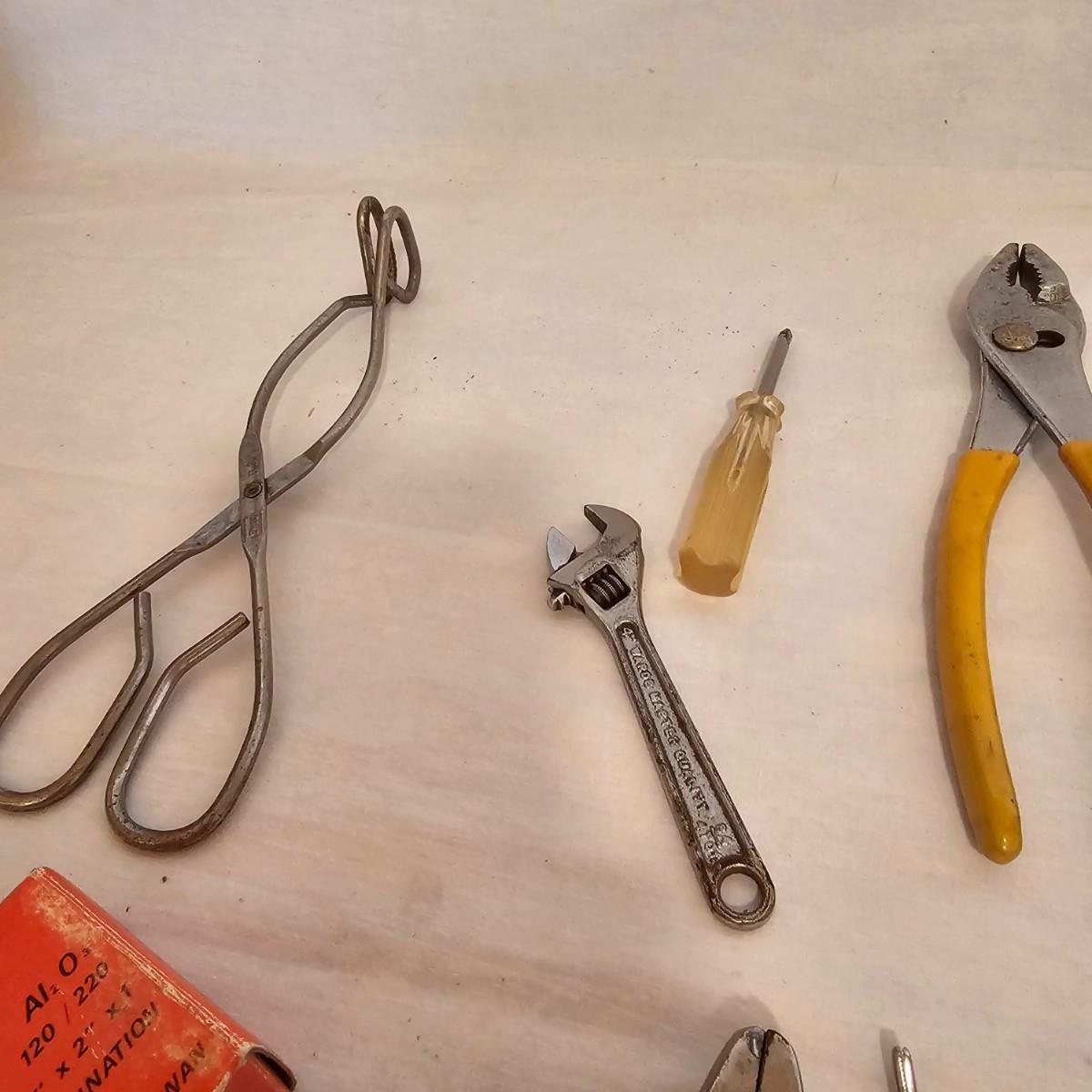 Large selection of tools and other items. Screwdrivers, pliers, wrenches, saws, staplers, more. Paint items include brushes, rollers and covers, sandpaper, steel wool. Two steel toolboxes for storage, large box is 16" x 7" x 8"H, smaller red is 13.5" x 7" x 6"H. See photos for details. Local pickup only.