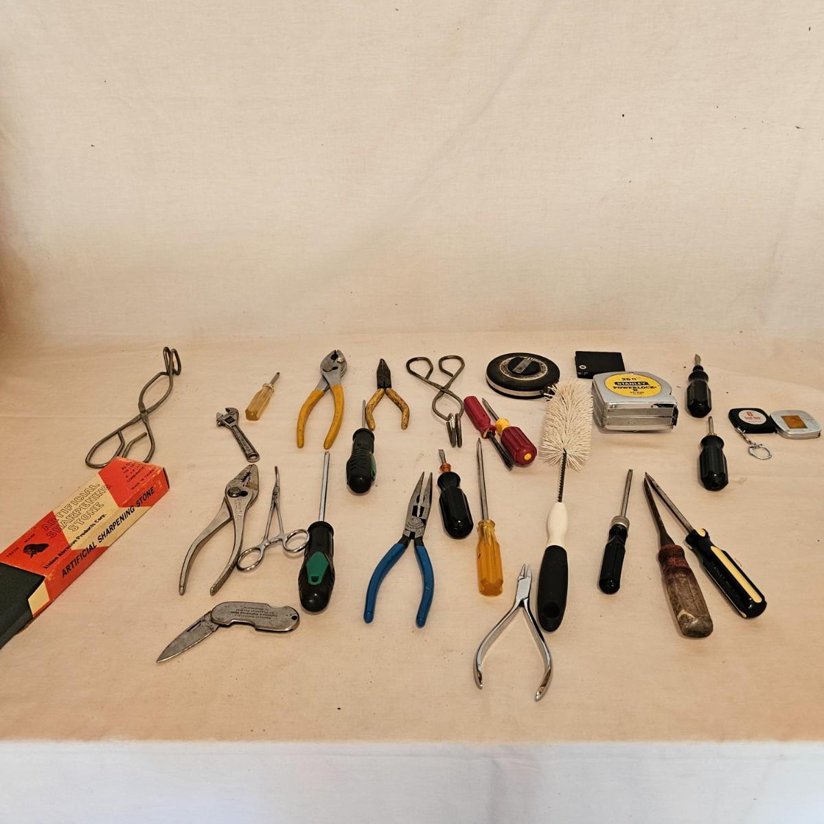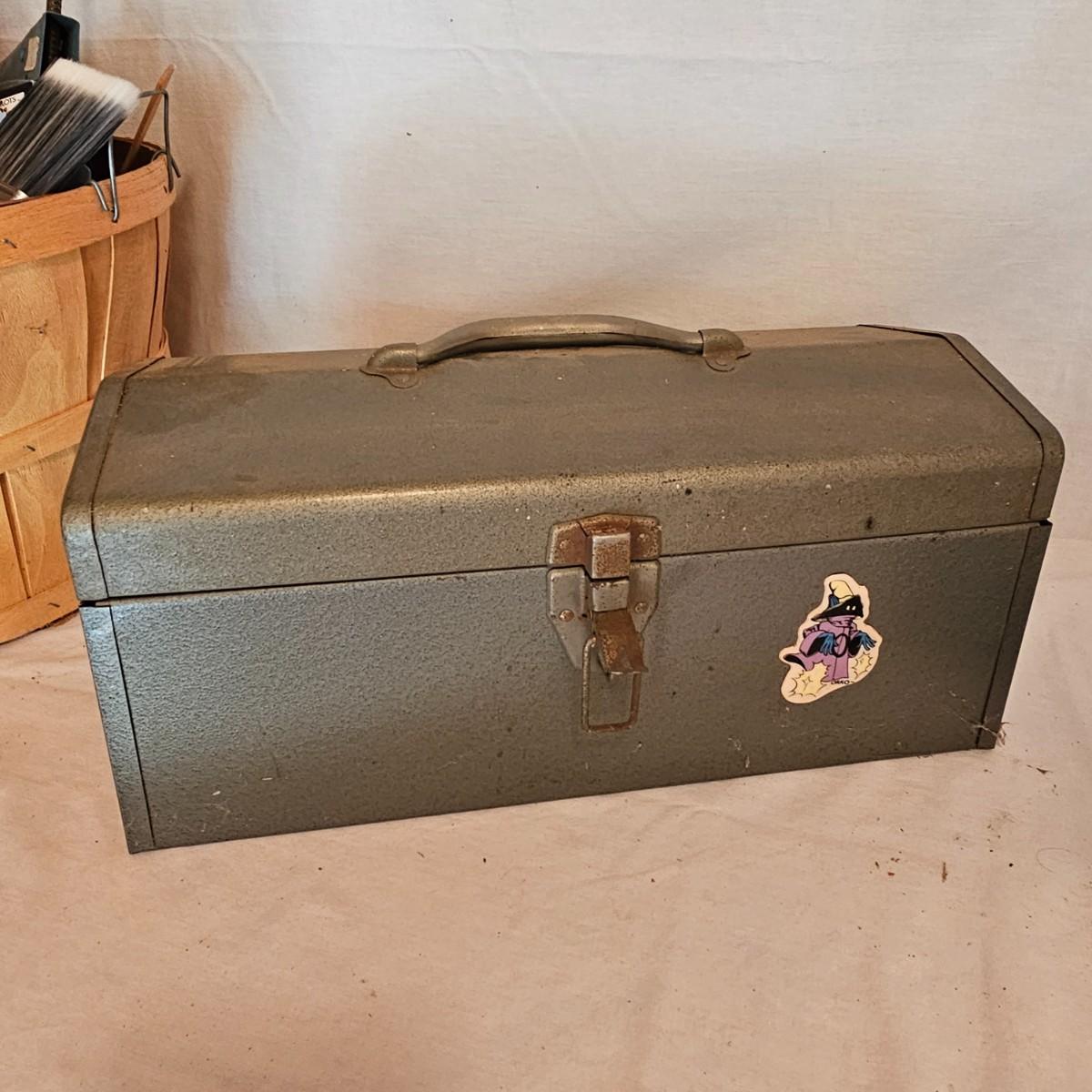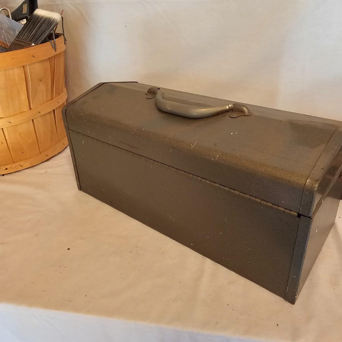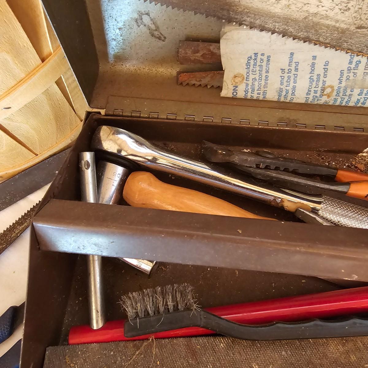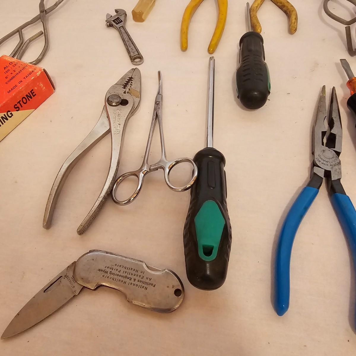Large selection of tools and other items. Screwdrivers, pliers, wrenches, saws, staplers, more. Paint items include brushes, rollers and covers, sandpaper, steel wool. Two steel toolboxes for storage, large box is 16" x 7" x 8"H, smaller red is 13.5" x 7" x 6"H. See photos for details. Local pickup only.