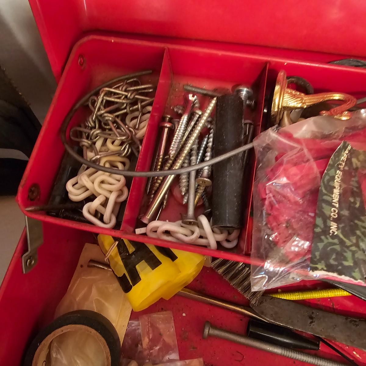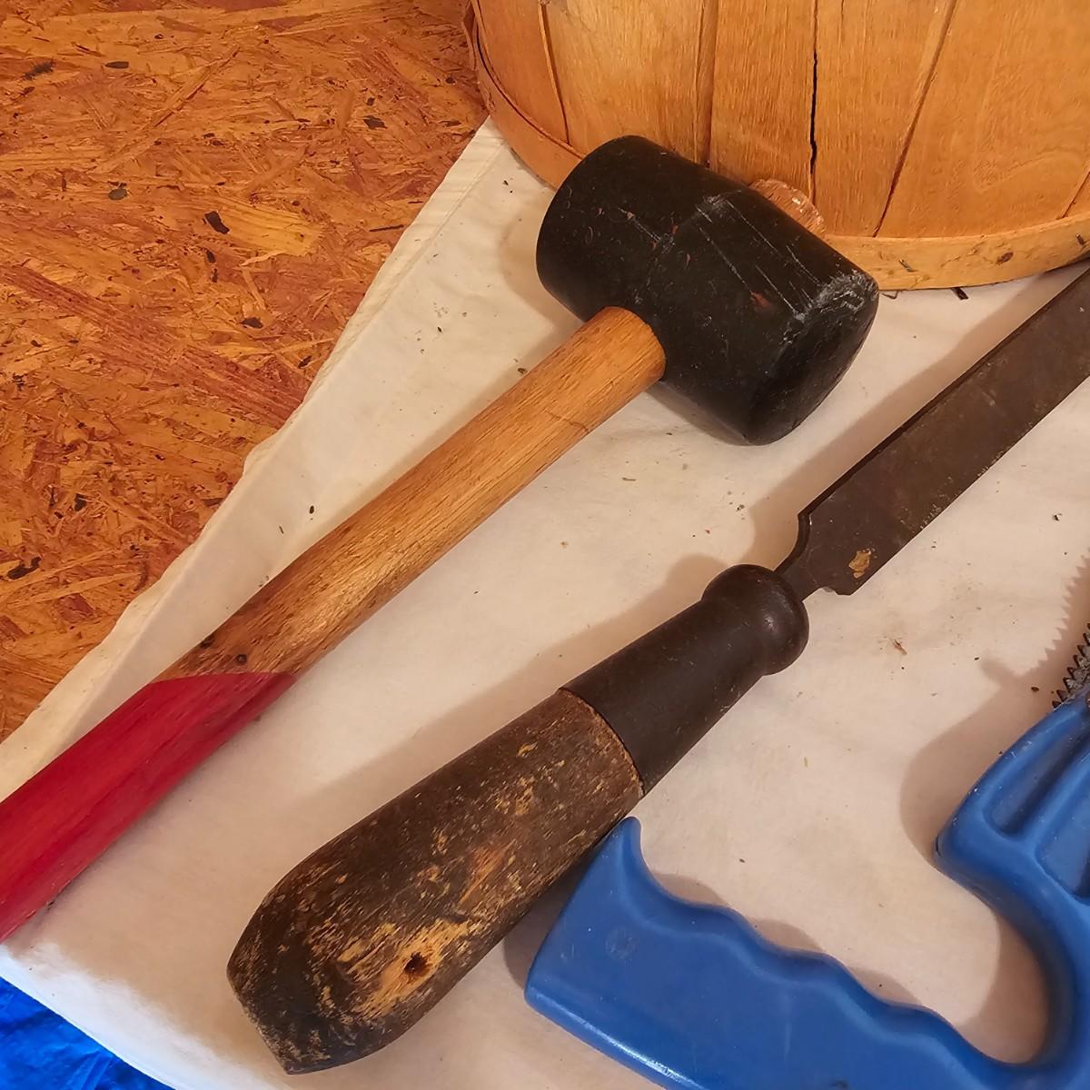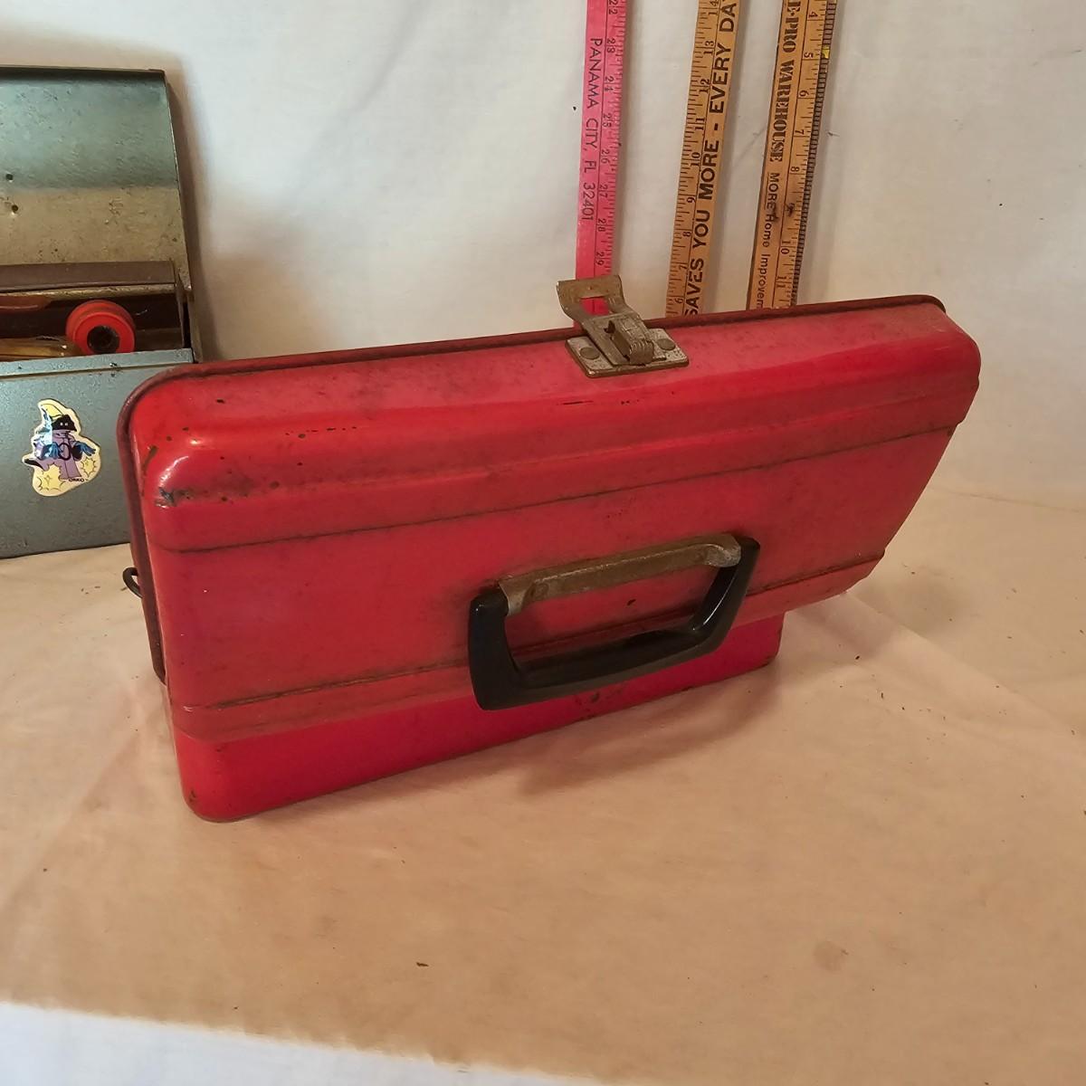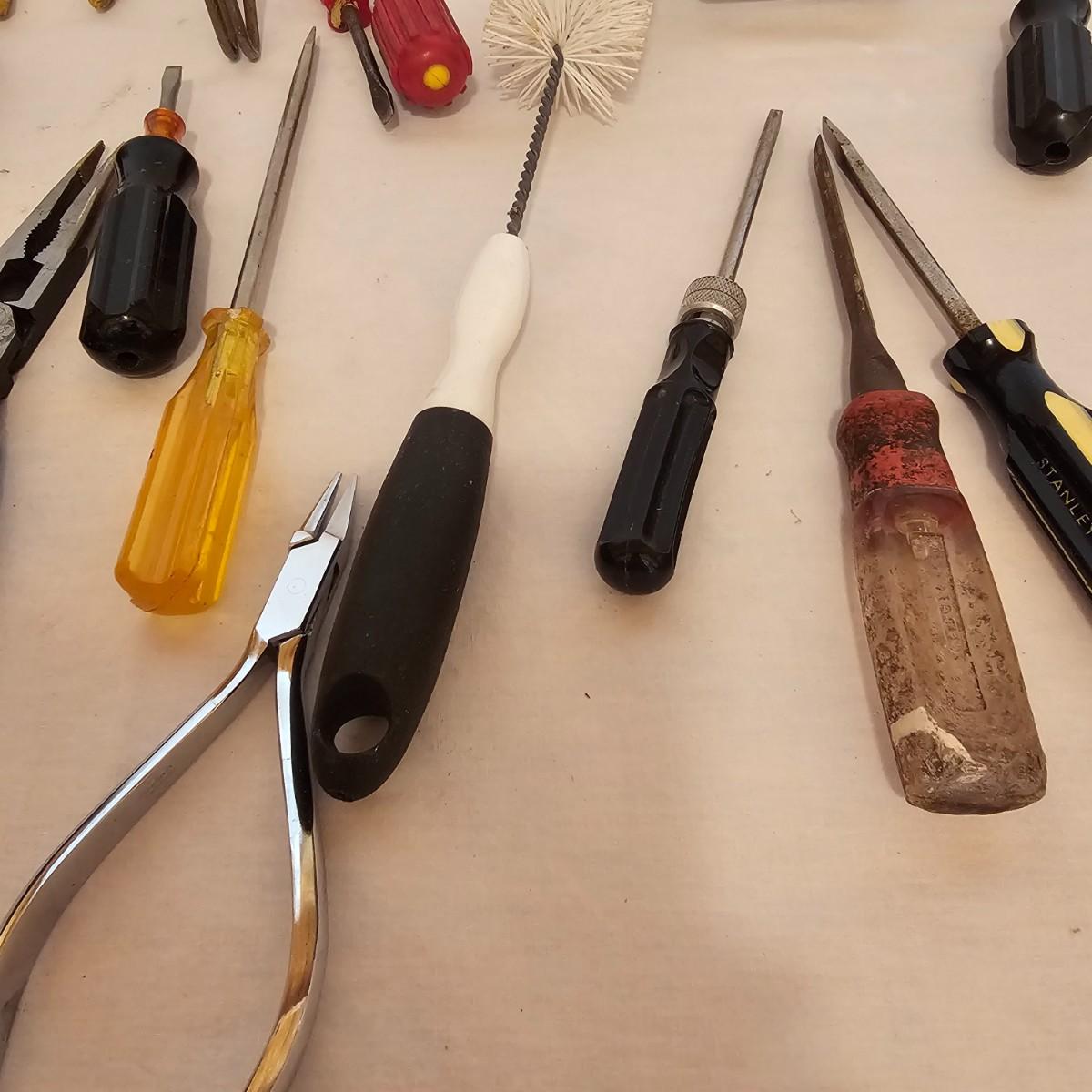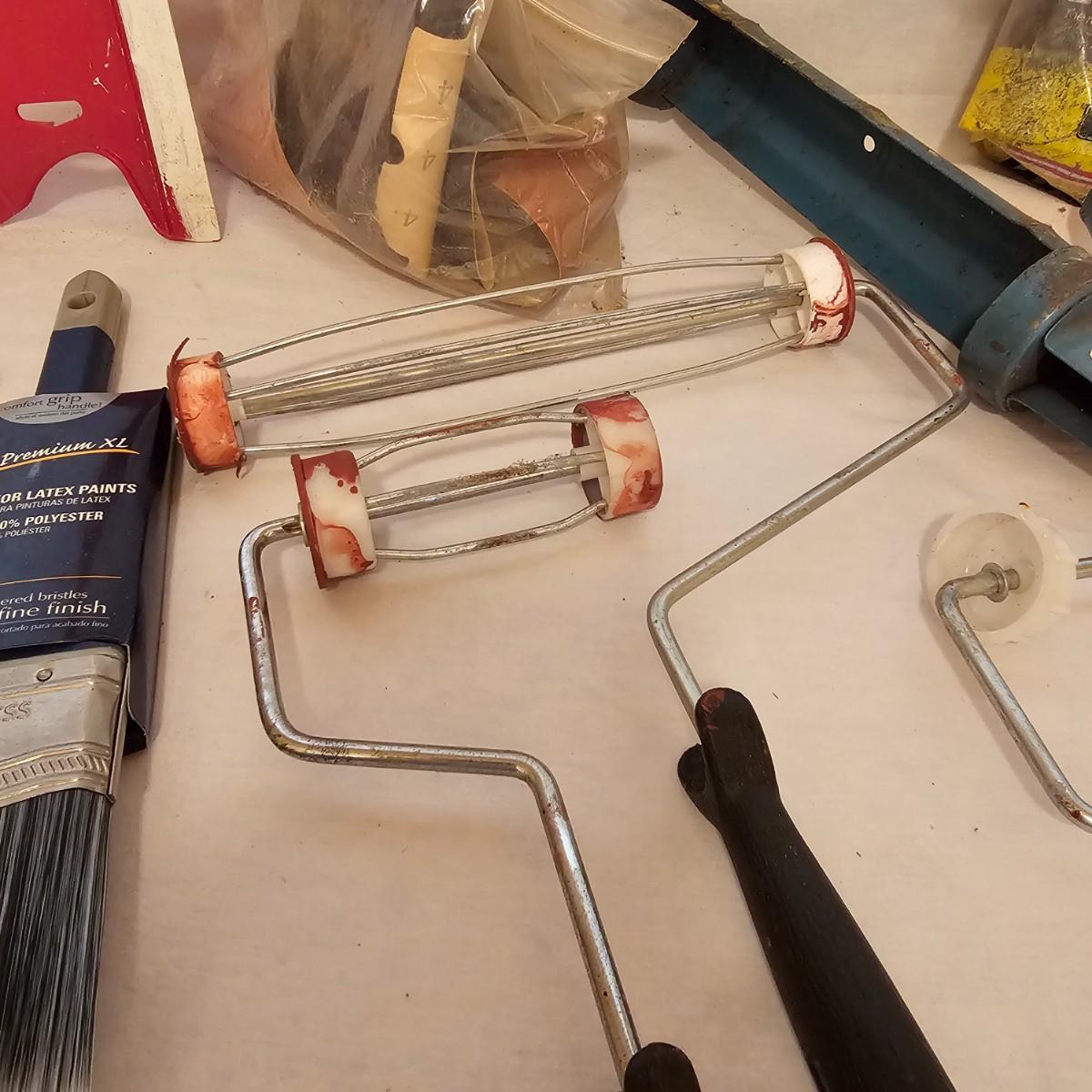 Large selection of tools and other items. Screwdrivers, pliers, wrenches, saws, staplers, more. Paint items include brushes, rollers and covers, sandpaper, steel wool. Two steel toolboxes for storage, large box is 16" x 7" x 8"H, smaller red is 13.5" x 7" x 6"H. See photos for details. Local pickup only.
