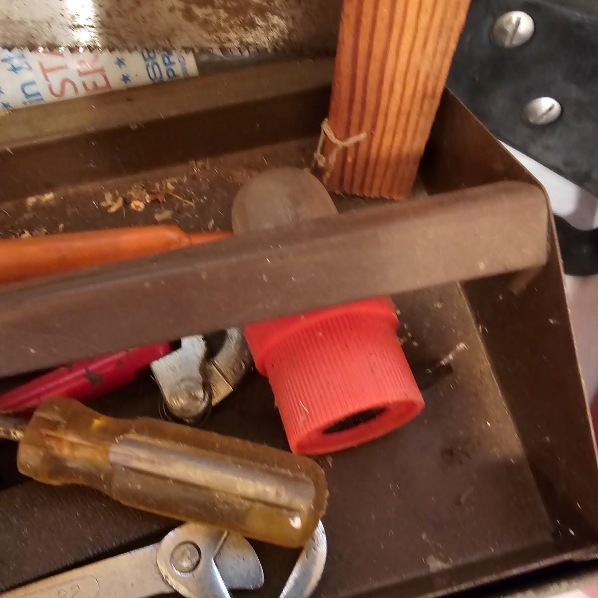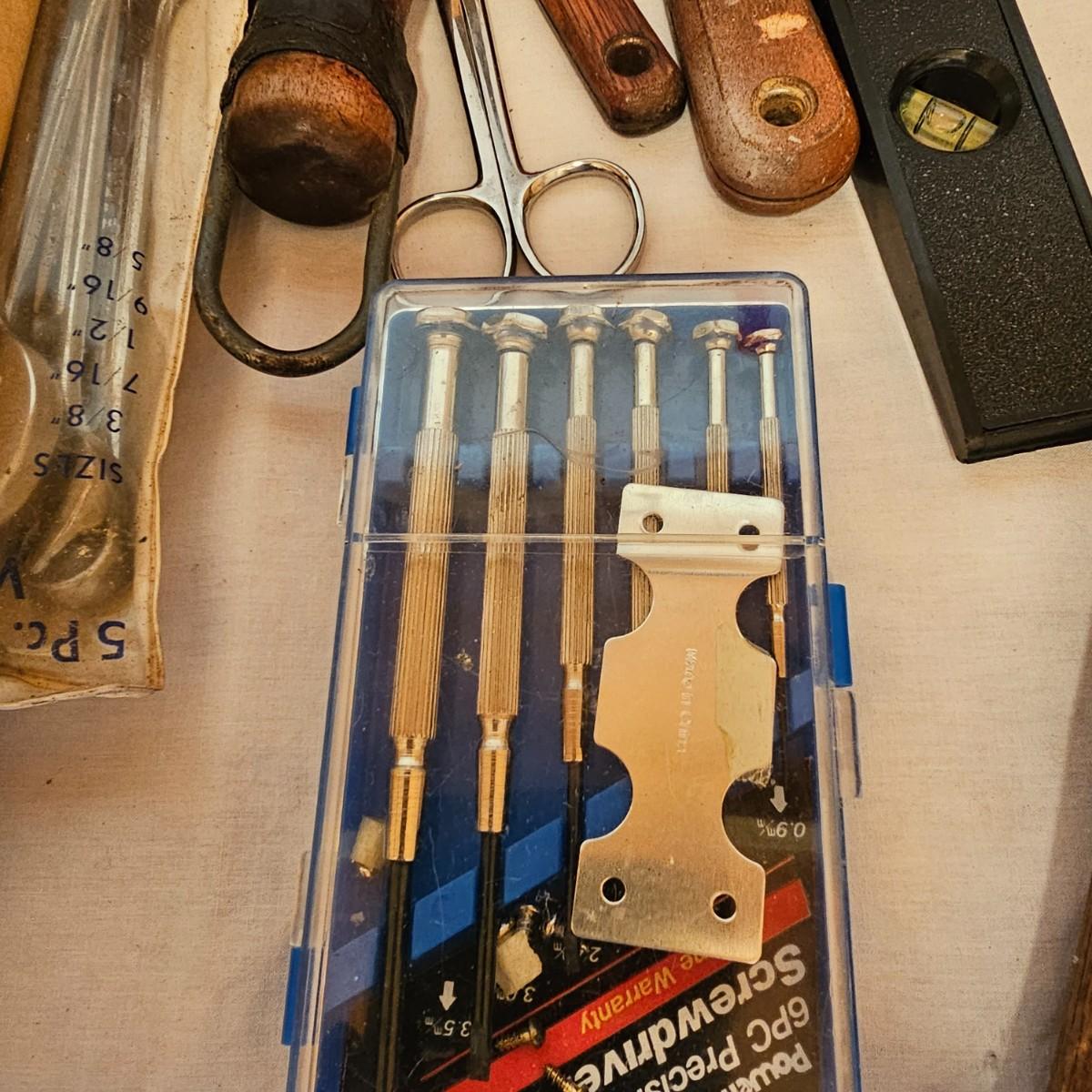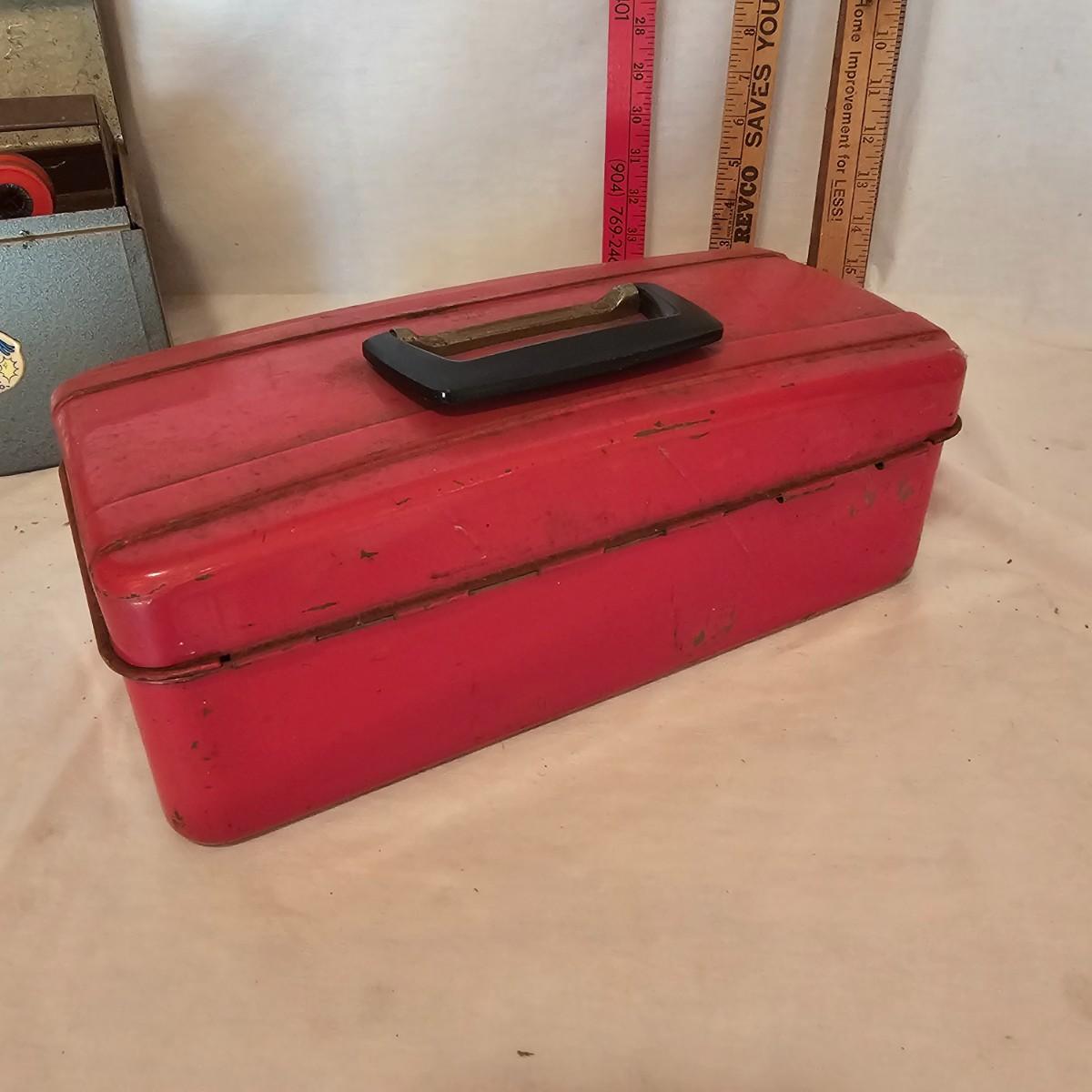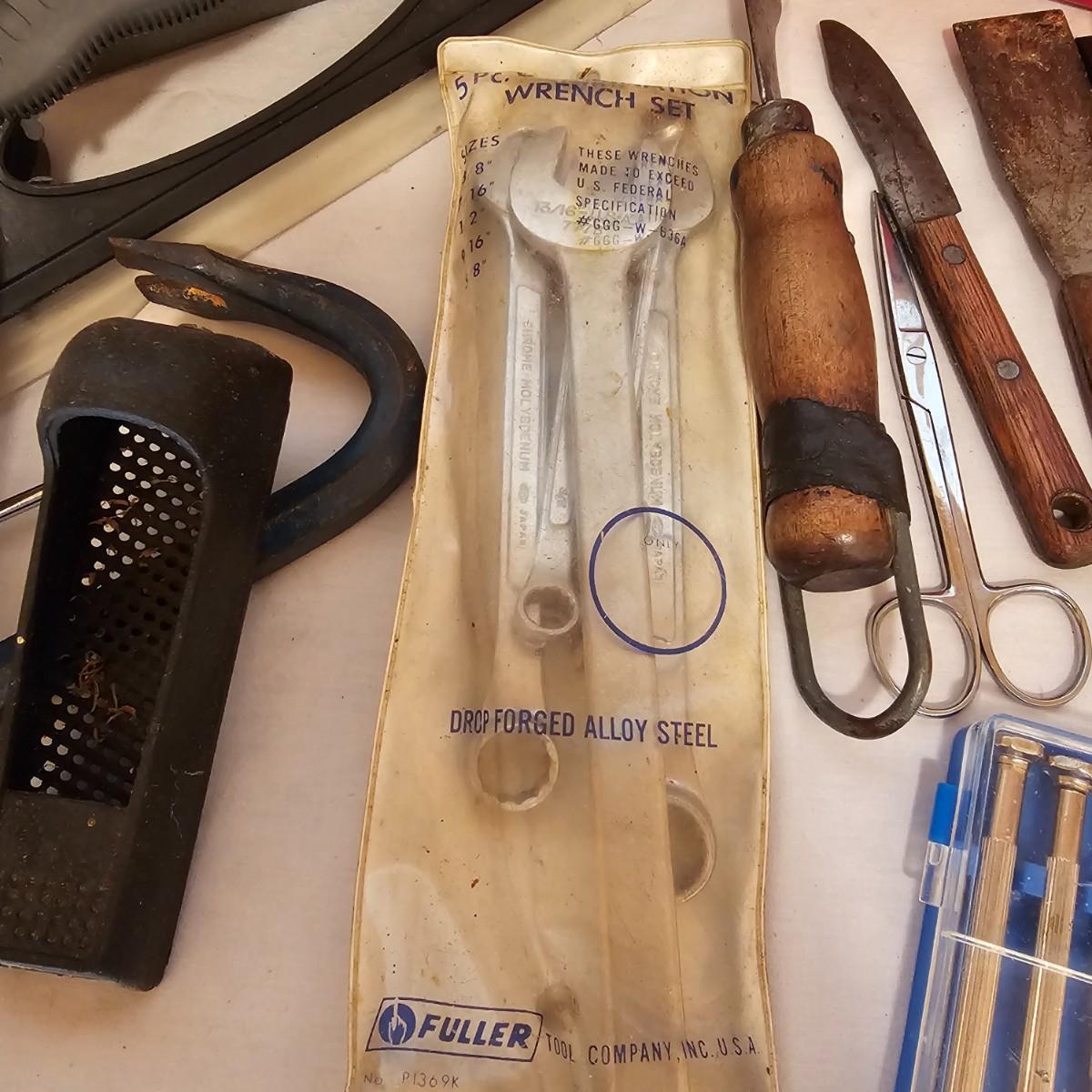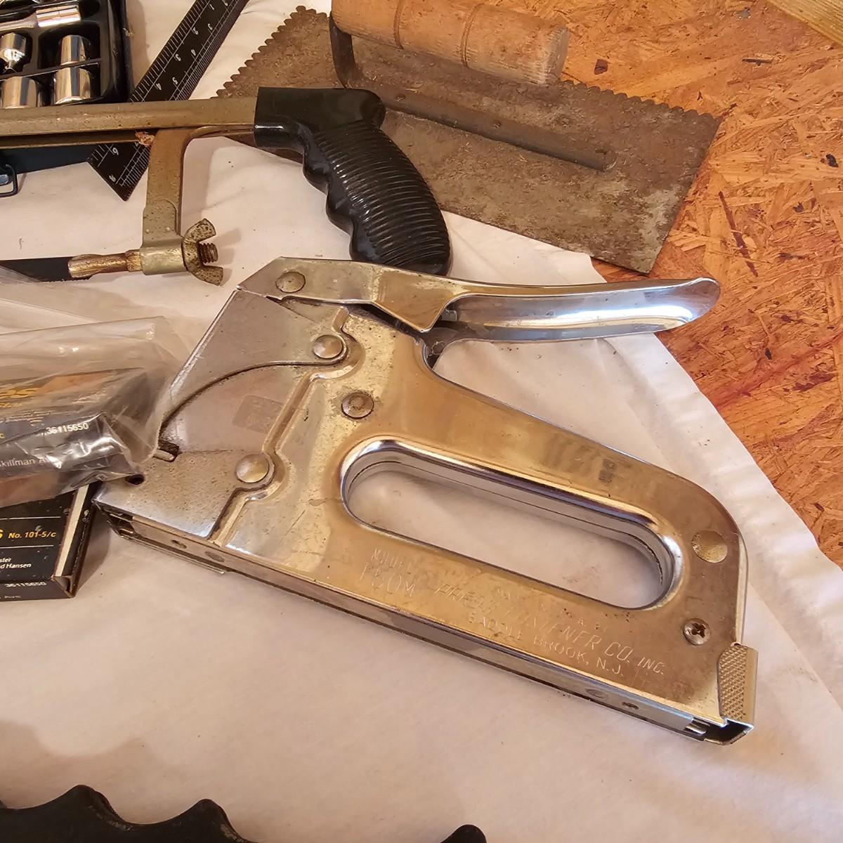 Large selection of tools and other items. Screwdrivers, pliers, wrenches, saws, staplers, more. Paint items include brushes, rollers and covers, sandpaper, steel wool. Two steel toolboxes for storage, large box is 16" x 7" x 8"H, smaller red is 13.5" x 7" x 6"H. See photos for details. Local pickup only.