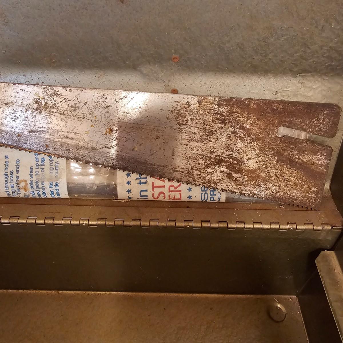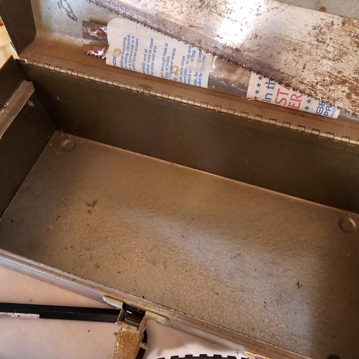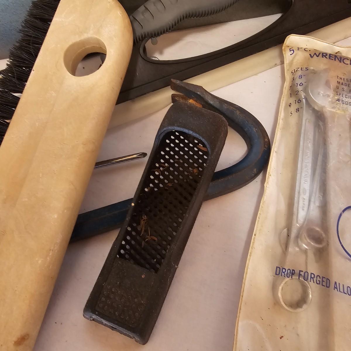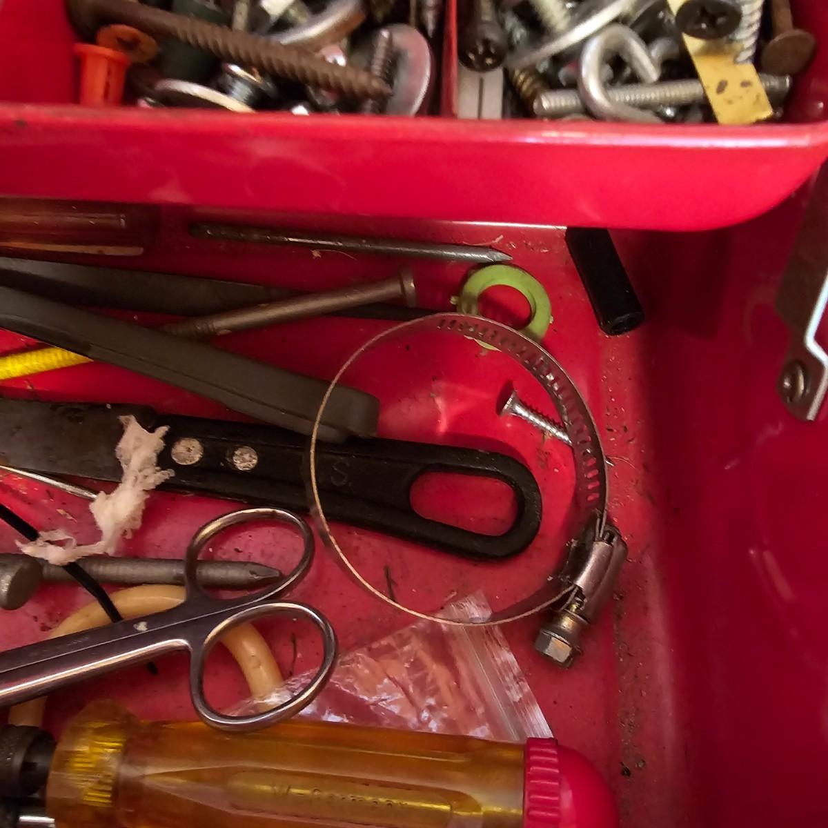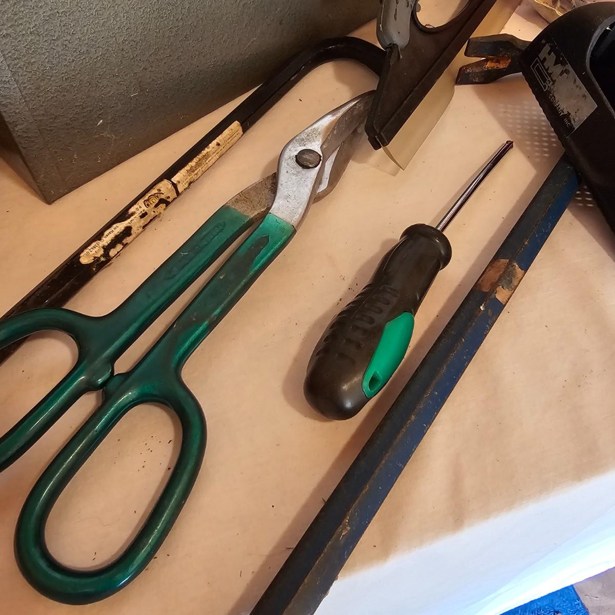 Large selection of tools and other items. Screwdrivers, pliers, wrenches, saws, staplers, more. Paint items include brushes, rollers and covers, sandpaper, steel wool. Two steel toolboxes for storage, large box is 16" x 7" x 8"H, smaller red is 13.5" x 7" x 6"H. See photos for details. Local pickup only.