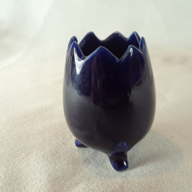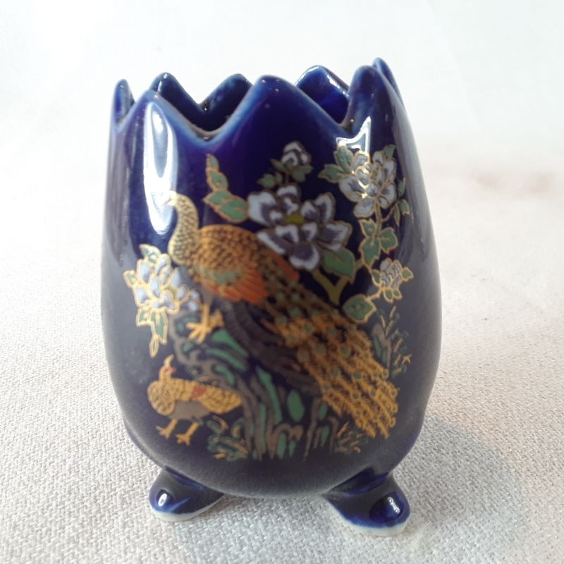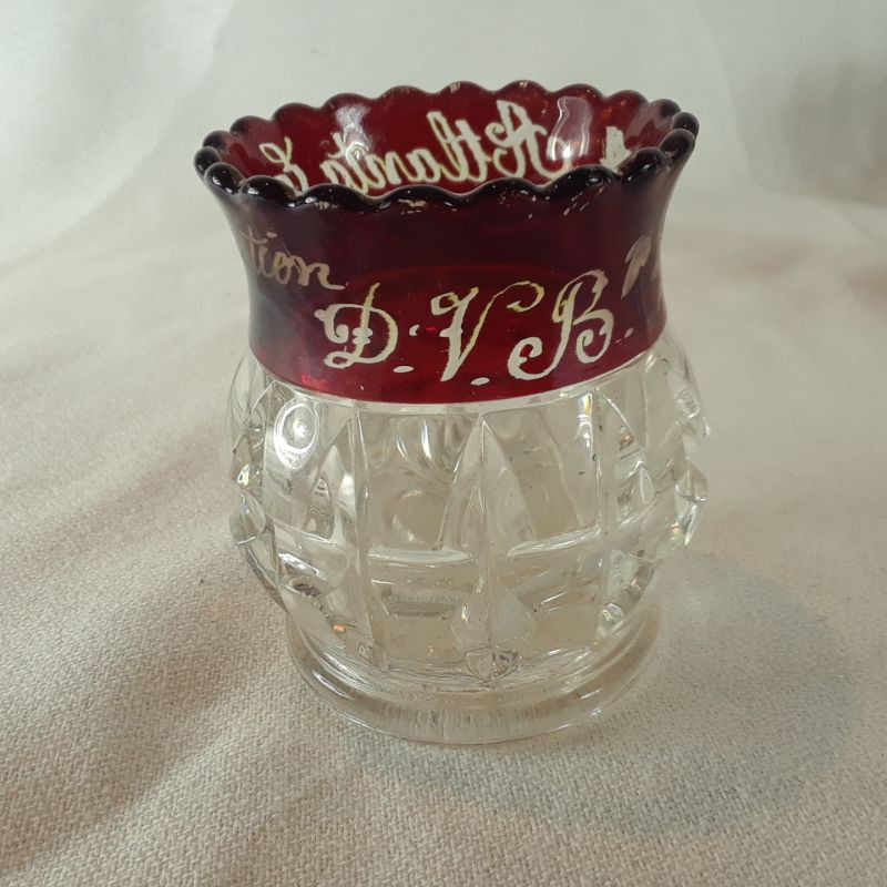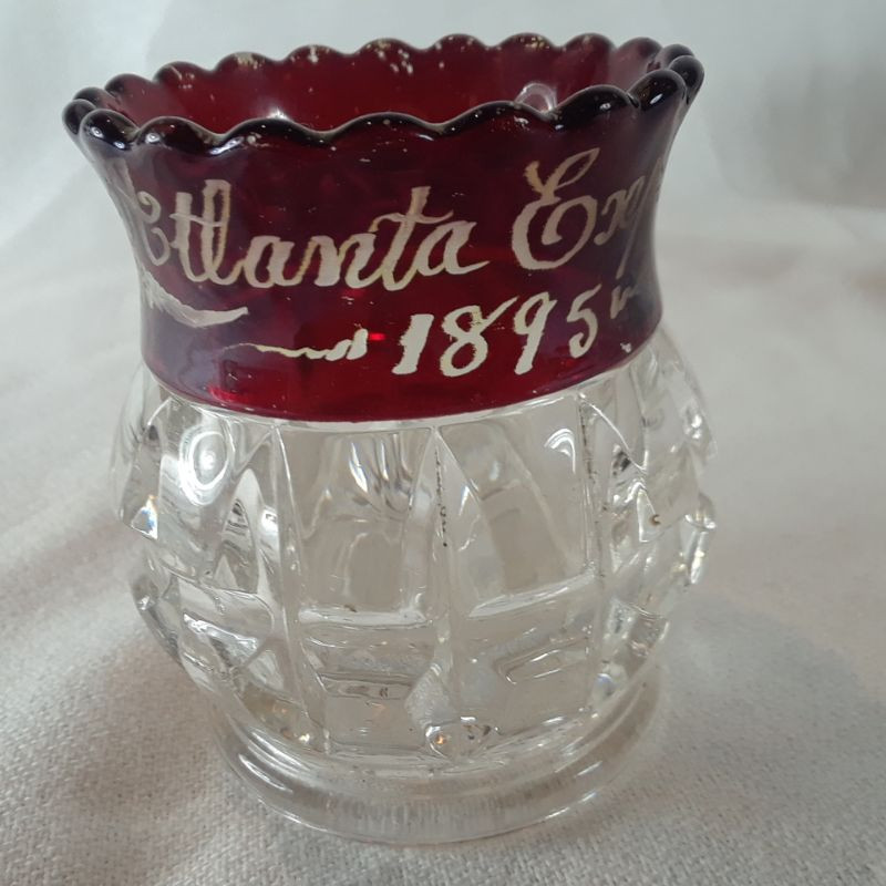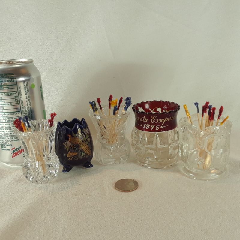 A grouping of 5 toothpick holders - vintage and antique. Small crystal clear, Blue ceramic with a Peacock motif, a clear pressed glass, a flashed Ruby-etched with Antlanta Exposition 1895 and DVB monogram (has some scratches in the flashing) and lastly a "Moon and Stars" toothpick holder. All are in good condition (unless noted) with no chips or cracks.