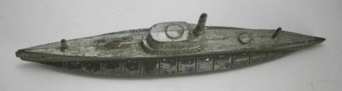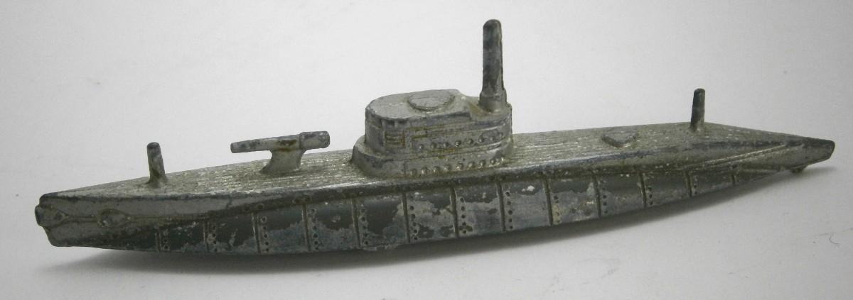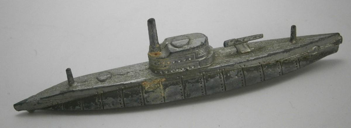 TOOTSIETOY Submarine from the early 1900's, 4 in. long, painted diecast metal.