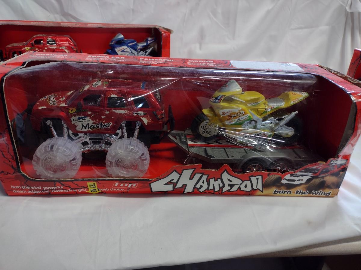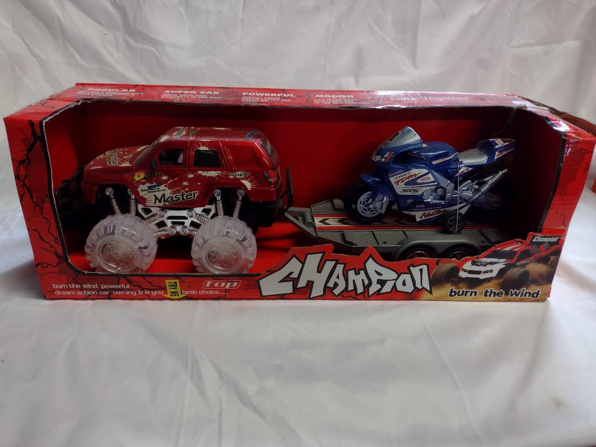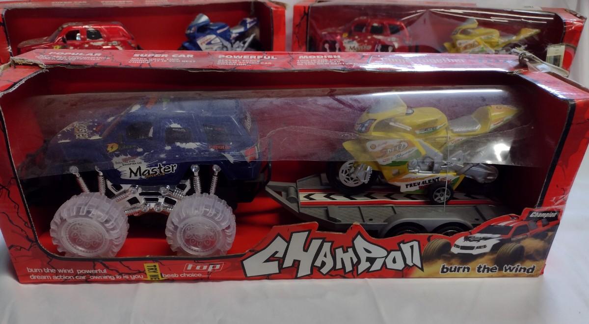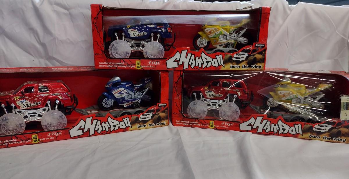 Top Champion Monster Truck w/Trailer and Motorcycle Sets, NIB- QTY 3