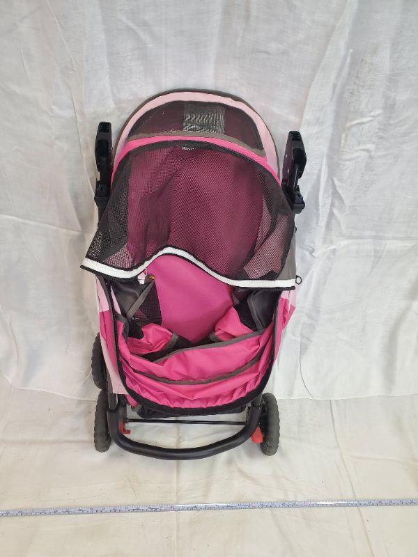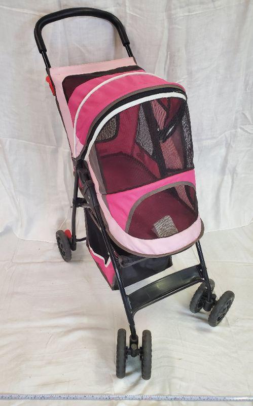 Adorable pink and black pet stroller, has been used but it's still in good condition!! Ready to roll!...