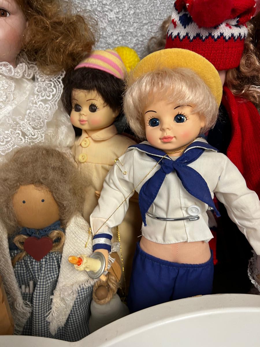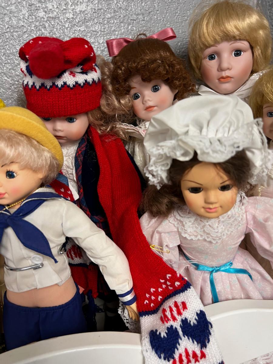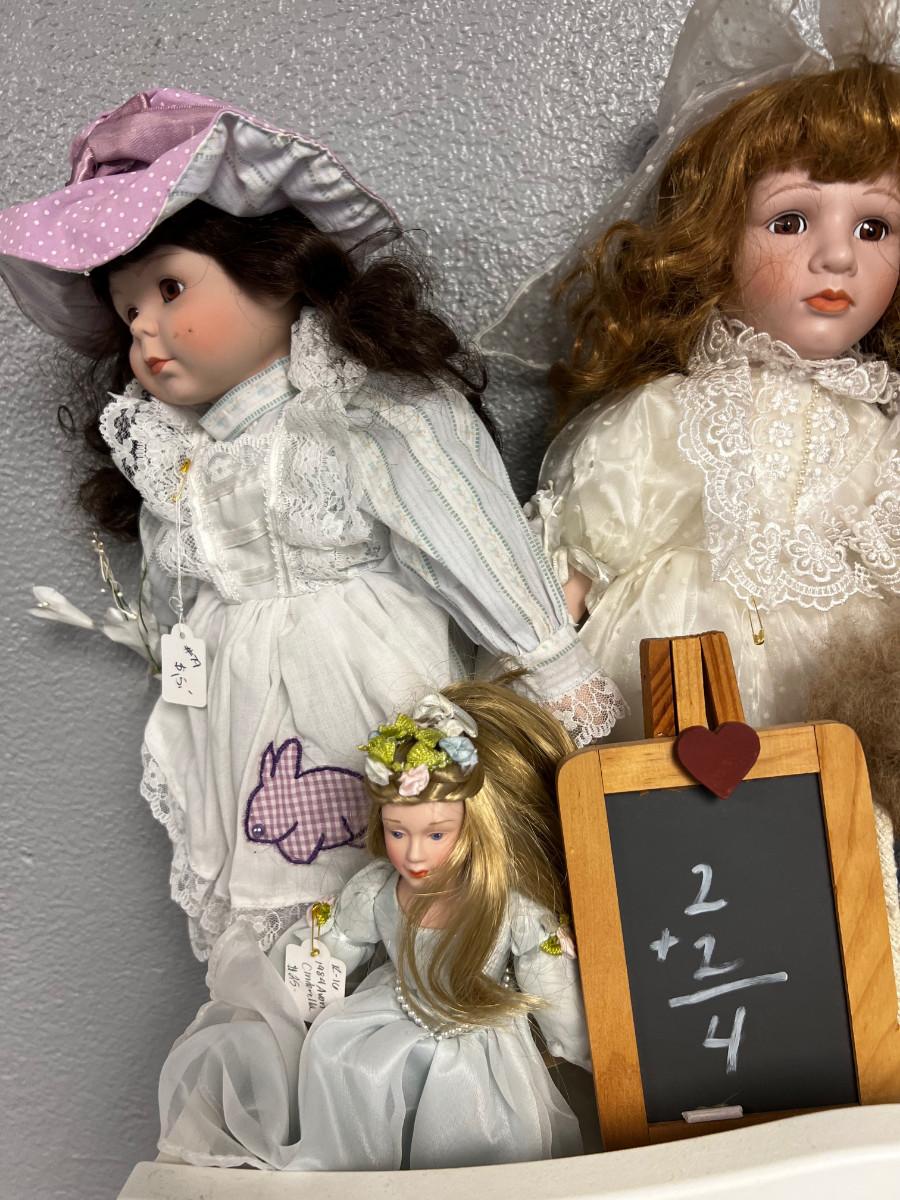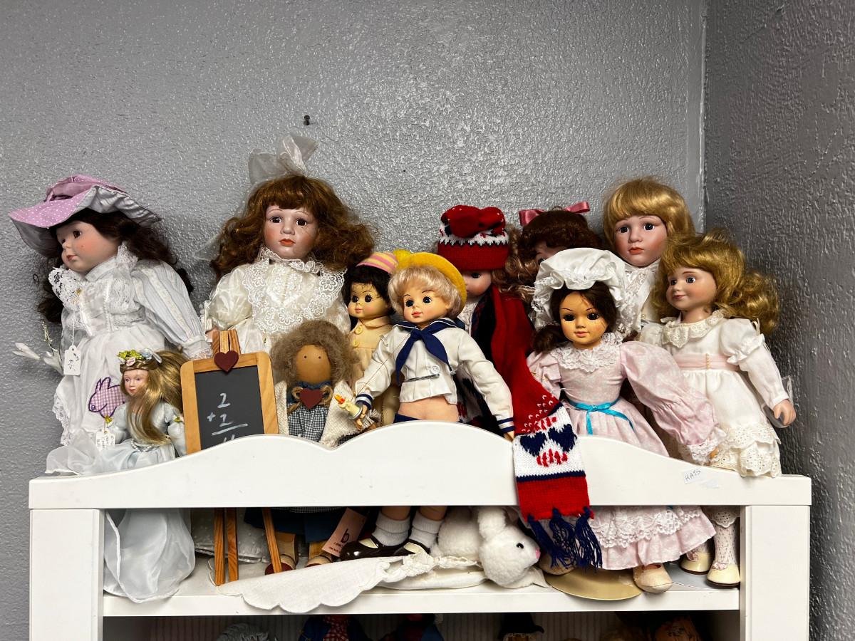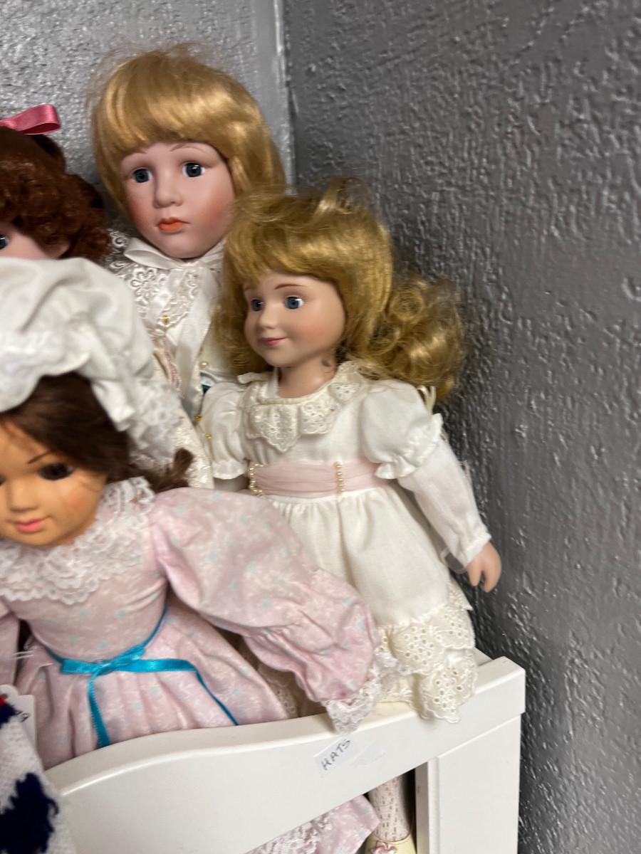 Top Shelf Of Dolls Mostly Porcelain Collector Dolls