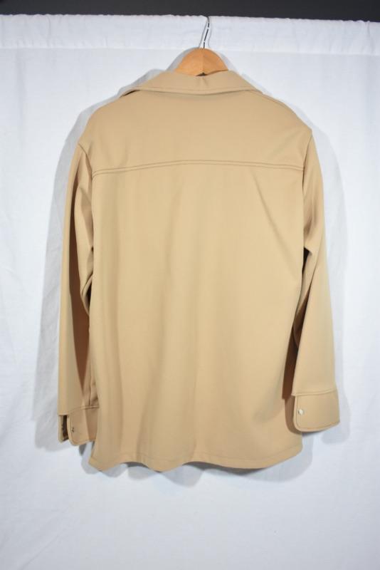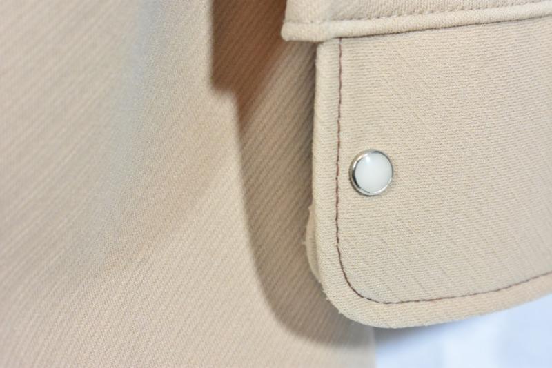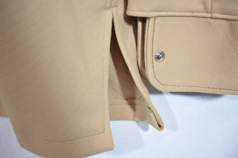 Camel color with double pockets on front, and side slits at hem.