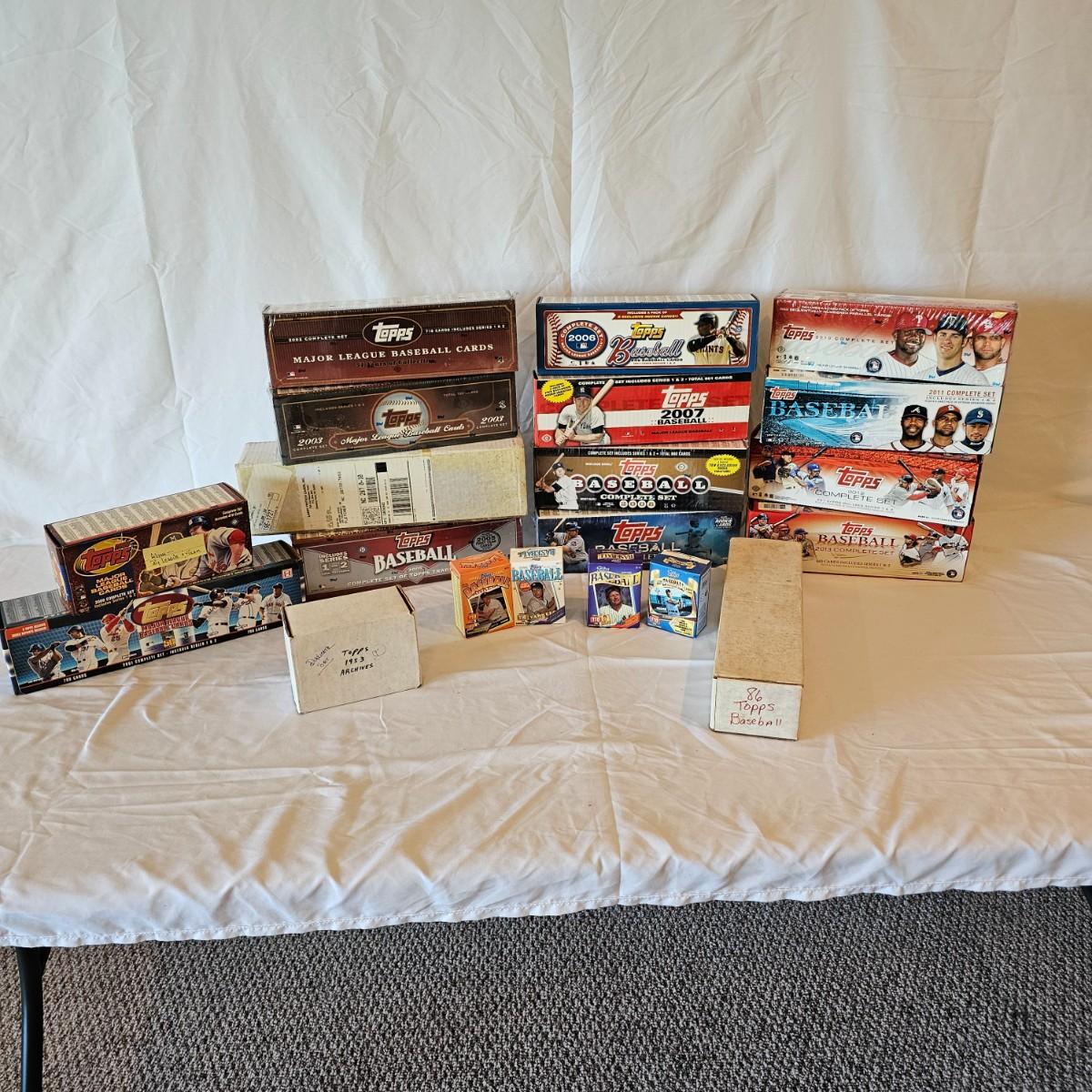 Seventeen boxes of Topps brand baseball cards, most all in original boxes. Lot contains the following: 1953 Archives duplicate set, 1986 and 1996 sets in original boxes, opened. Also includes sets 2000 thru 2013 inclusive. 2002, 2003, 2005, 2008, 2009, and 2010 are all sealed in original wrap. All other years have been opened. There is no guarantee that open sets contain all cards. See photos for details. Shipping available. Shipping can be costly. We suggest contacting our preferred local shipping provider, Postage Express, with dimensions and getting an estimate before bidding: (828) 225-9250 or shipping@postageexpressnc.com