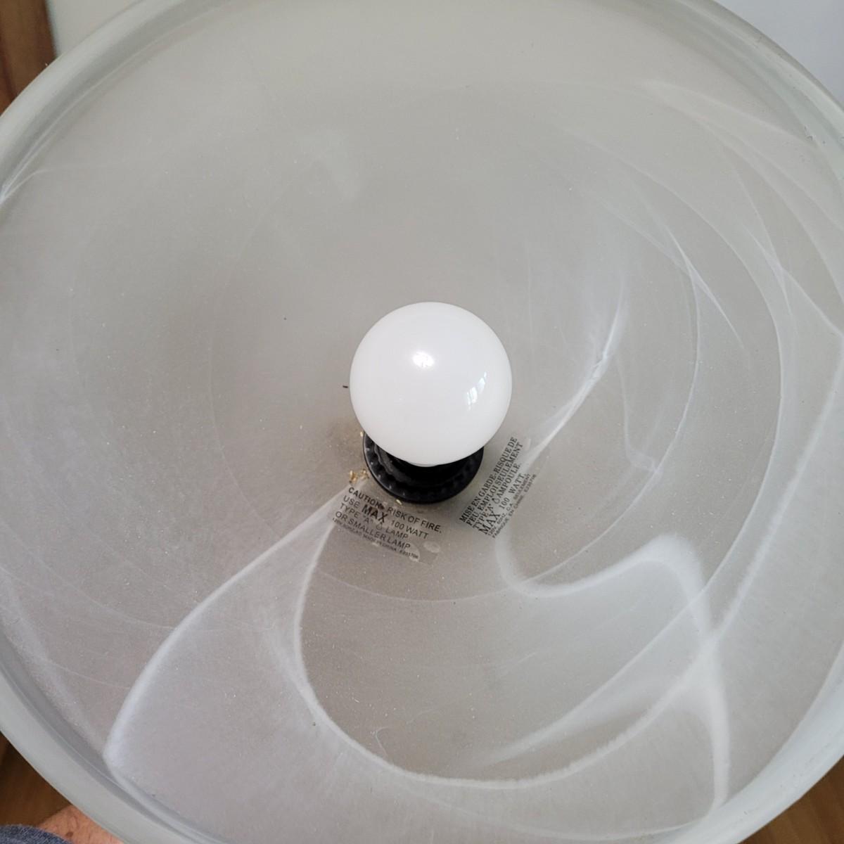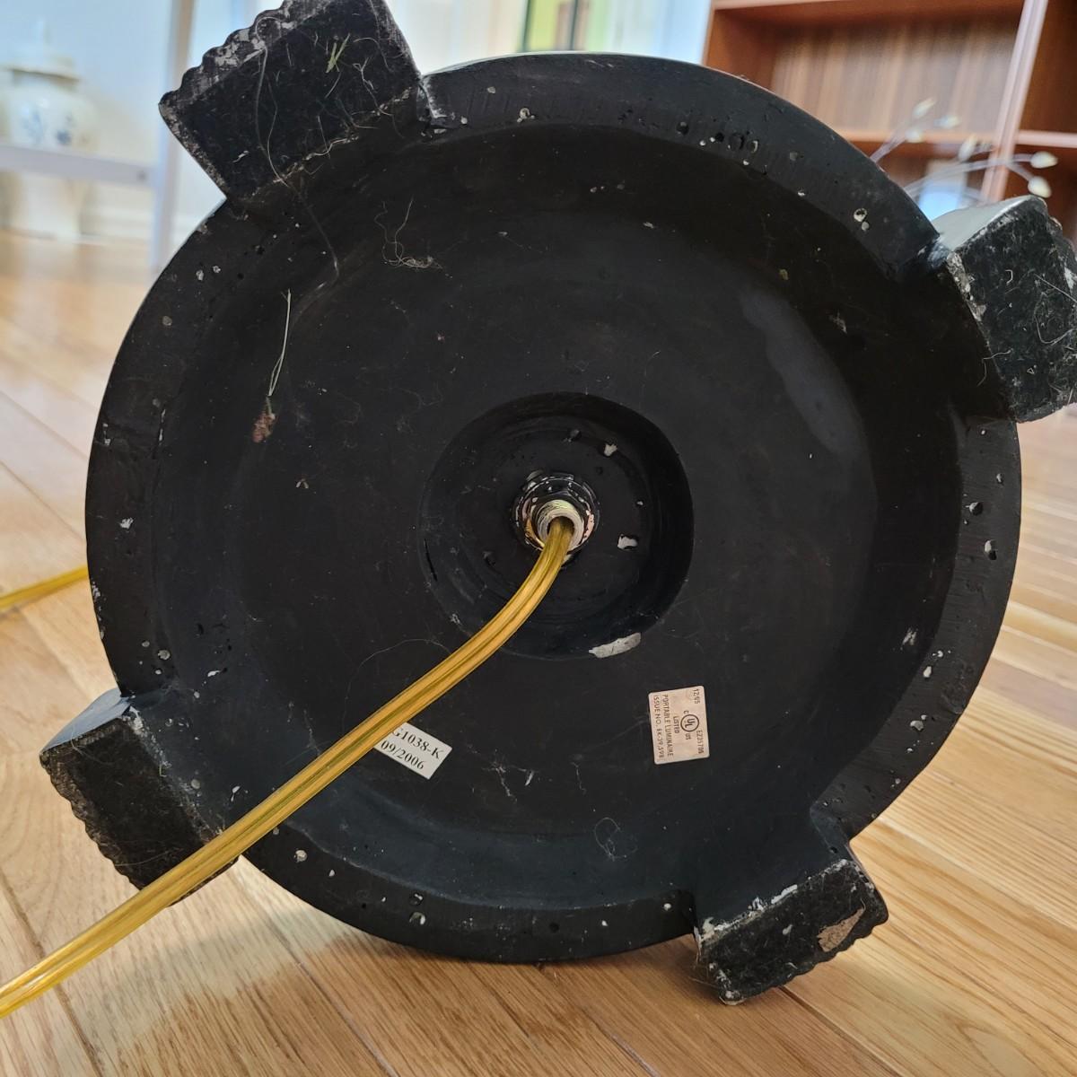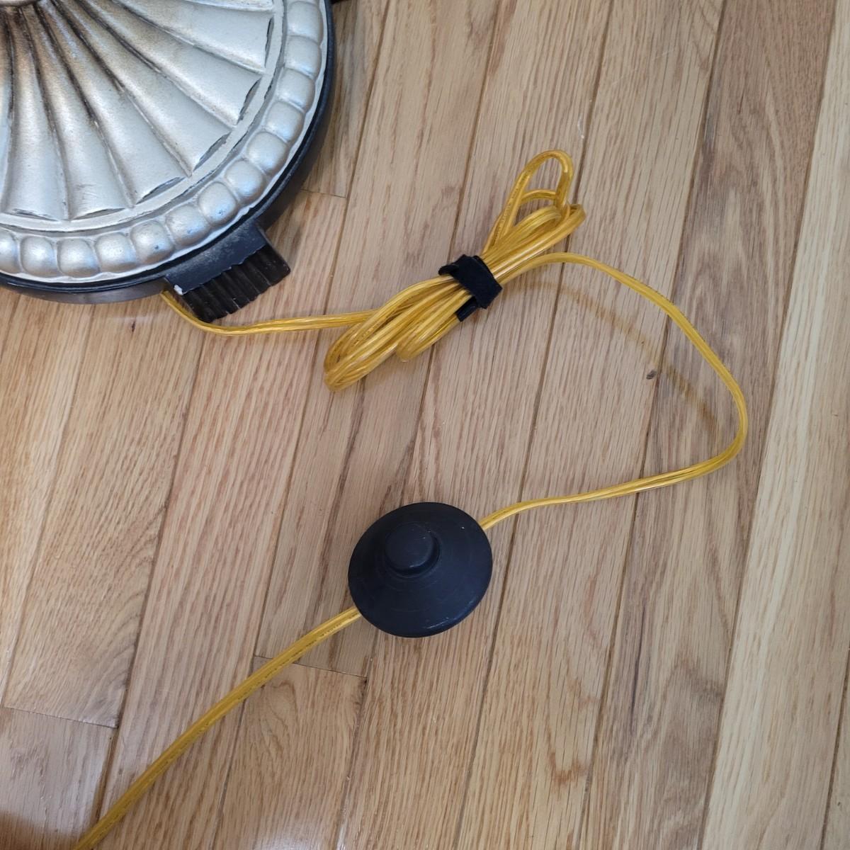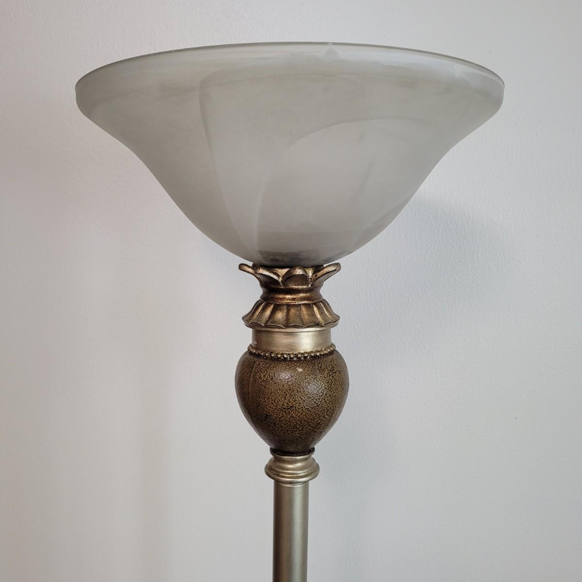 One torcherie style floor lamp. The lamp has a smoked glass top and an ornate metal pole and base. The lamp features a floor switch that is operated with a tap of the foot. The lamp powers on when plugged in and includes a bulb. Lamp measures 13"D x 70"H.
