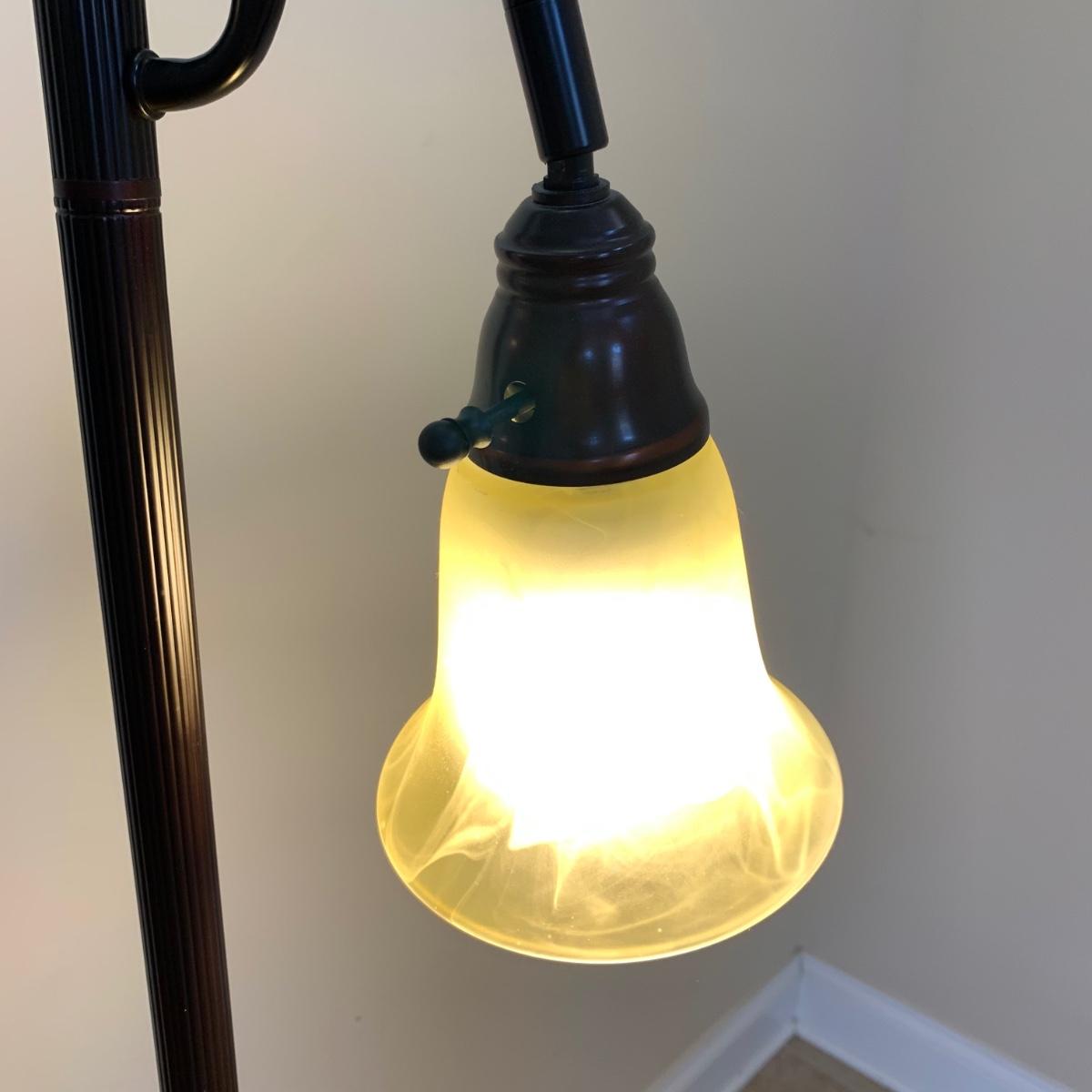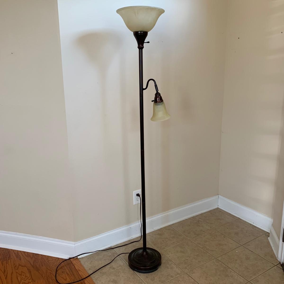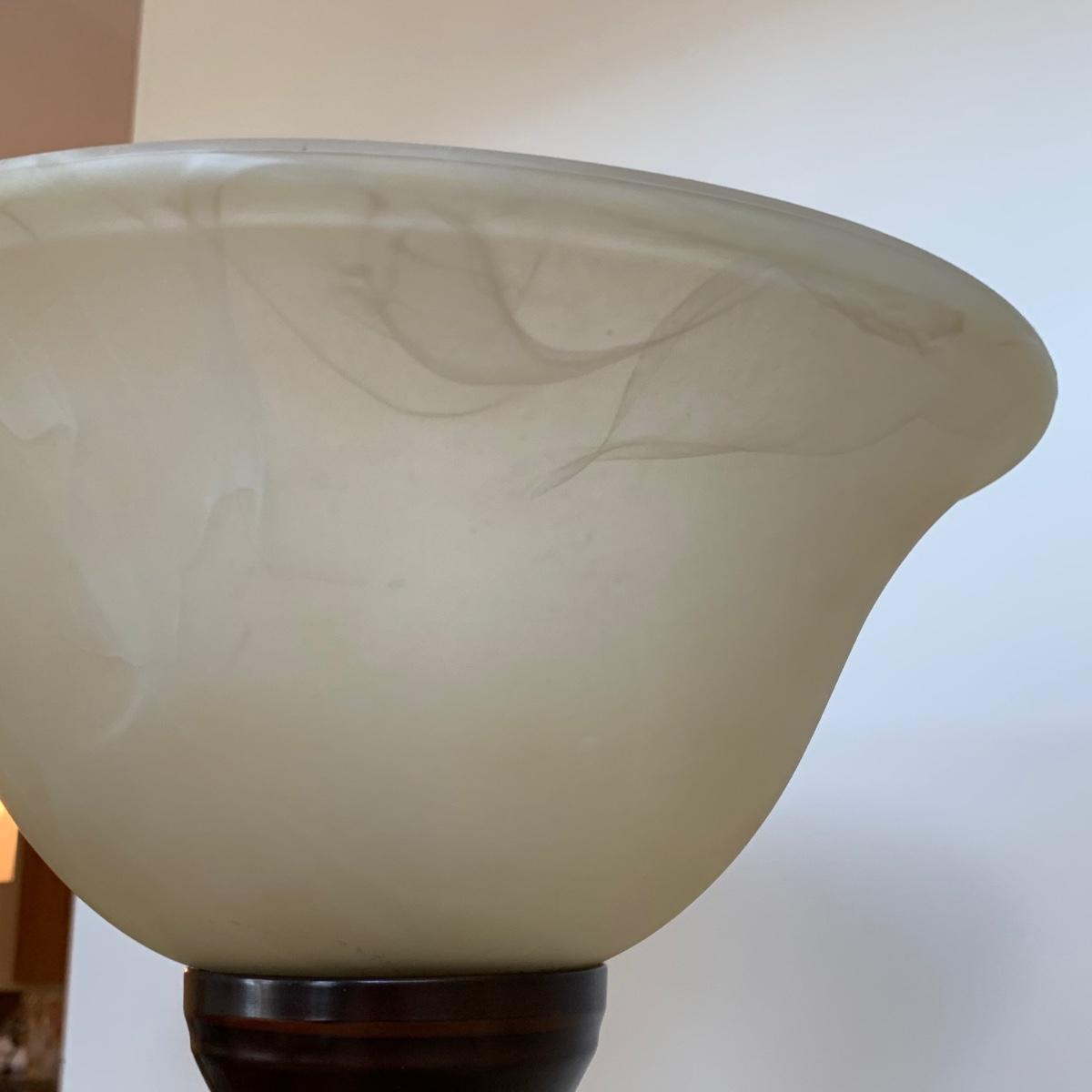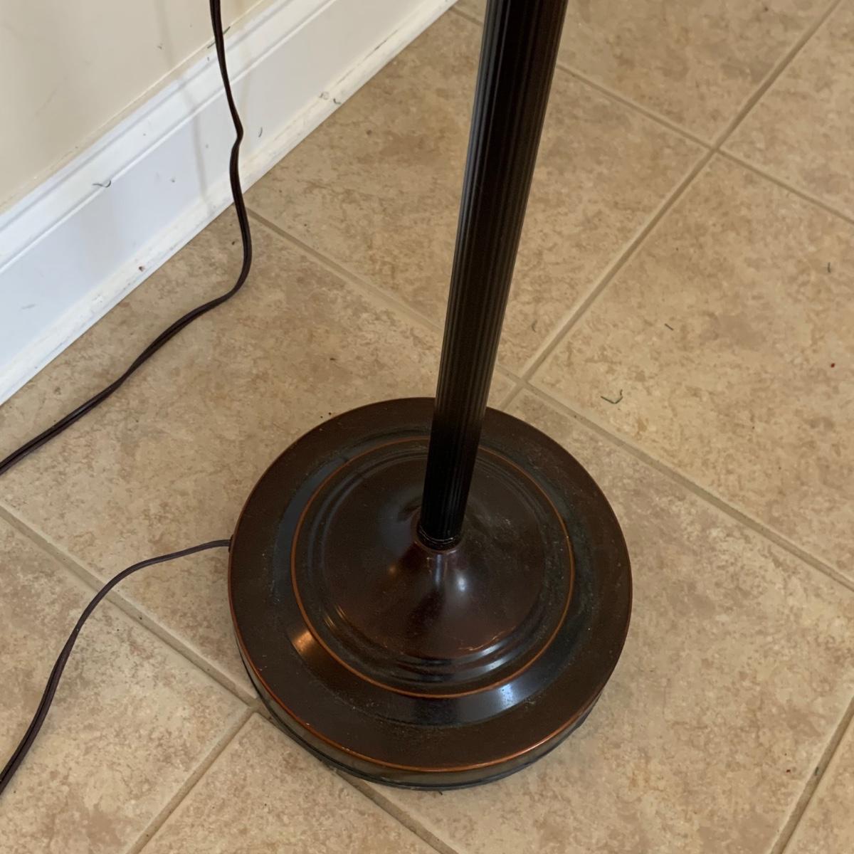 Floor lamp with a dark bronze colored metal base and frosted smoky glass shades. Lamp turned on when plugged in. It is 70.5” tall.