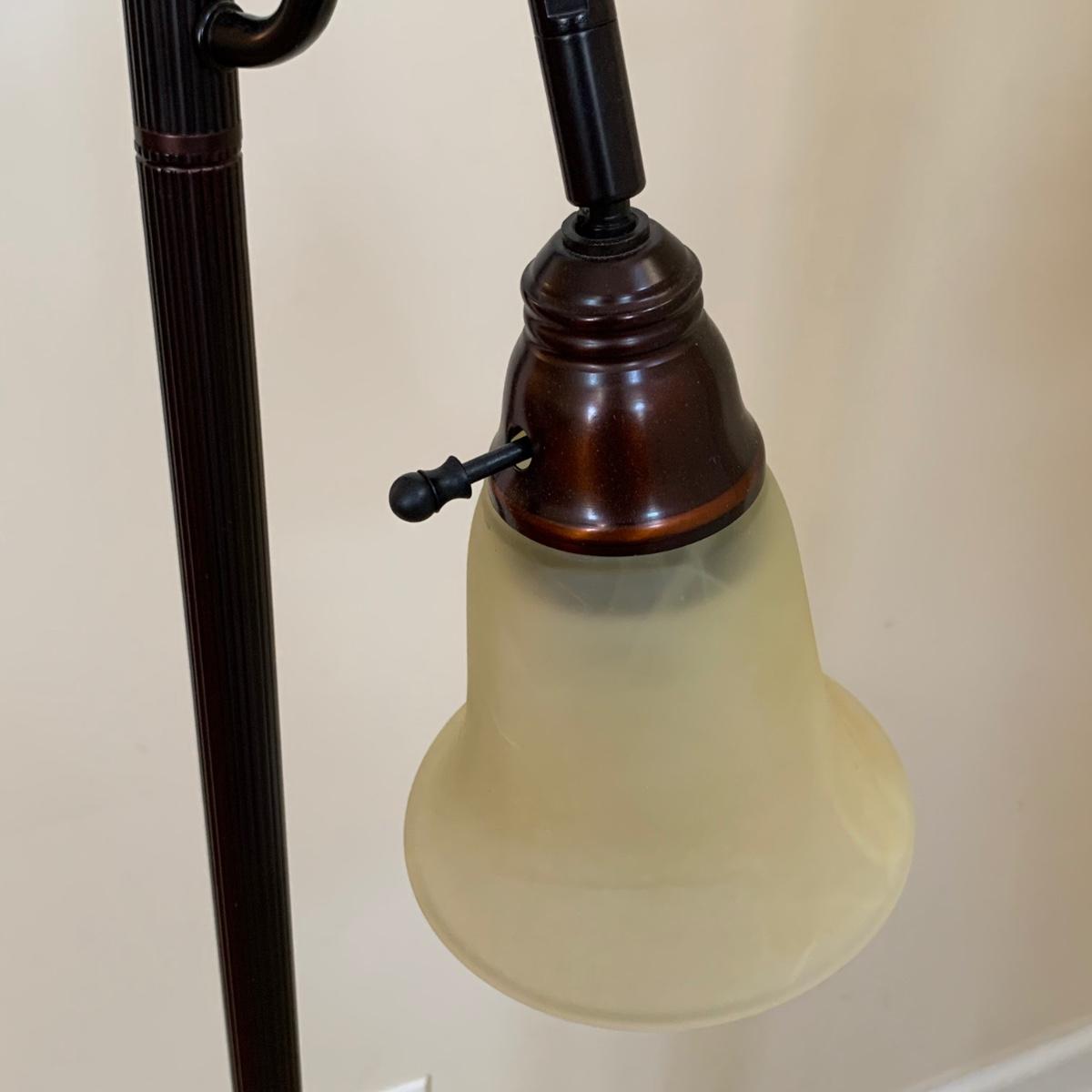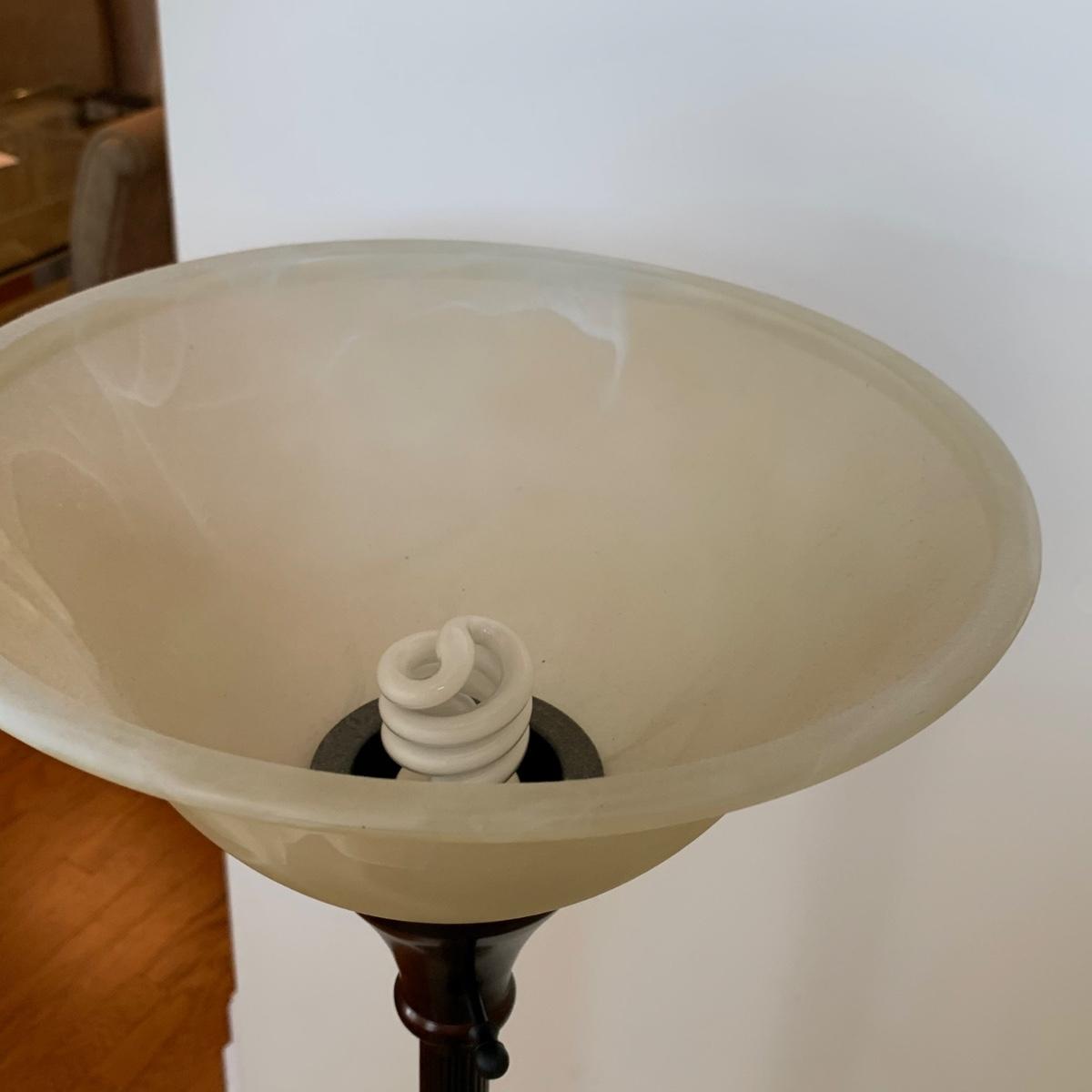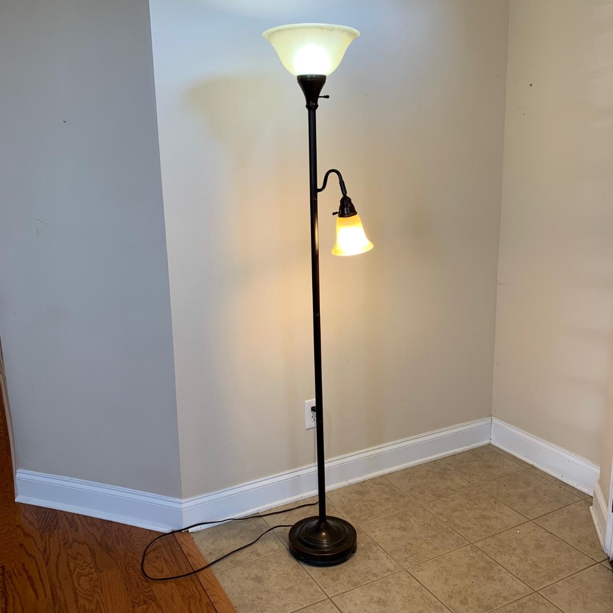 Floor lamp with a dark bronze colored metal base and frosted smoky glass shades. Lamp turned on when plugged in. It is 70.5” tall.