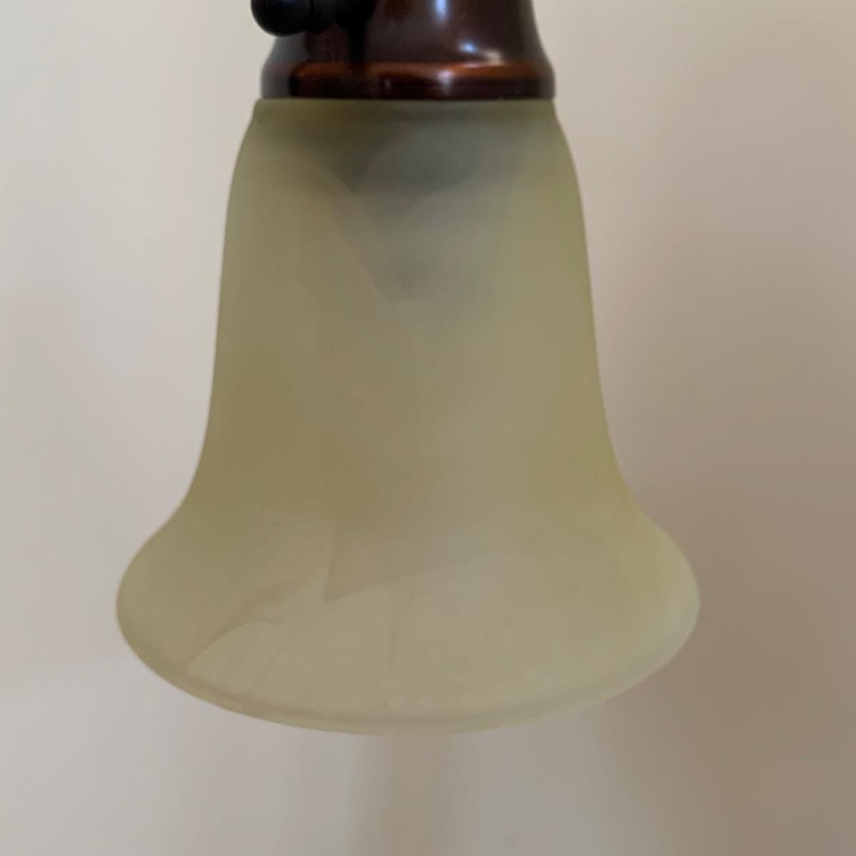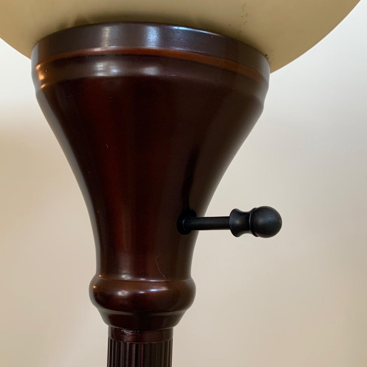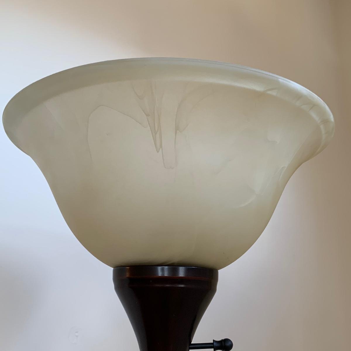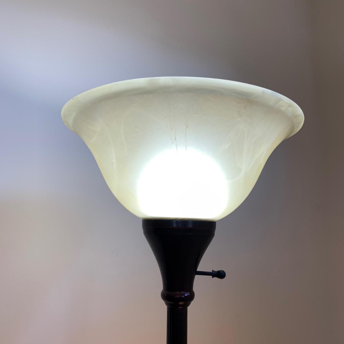 Floor lamp with a dark bronze colored metal base and frosted smoky glass shades. Lamp turned on when plugged in. It is 70.5” tall.