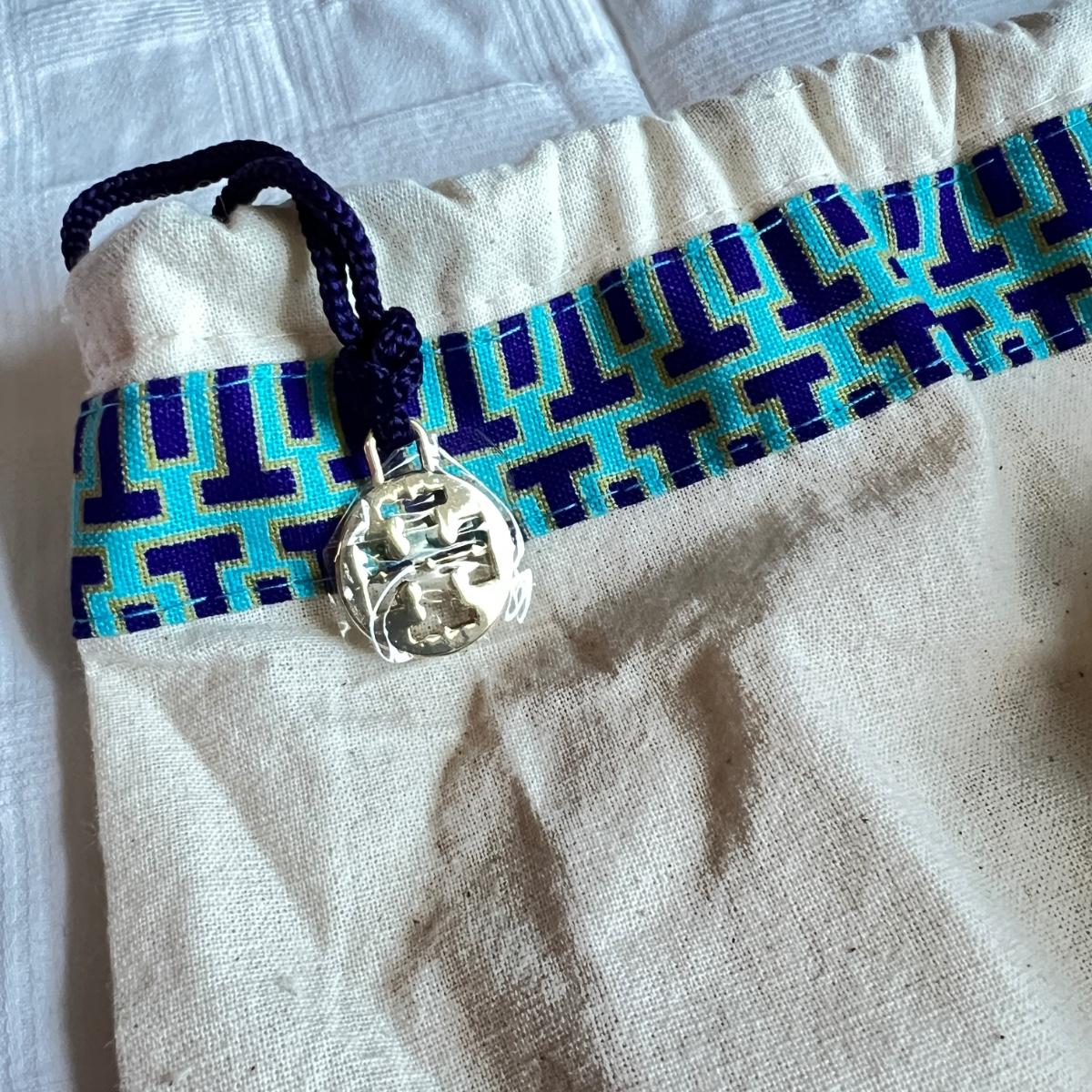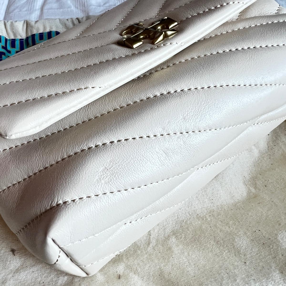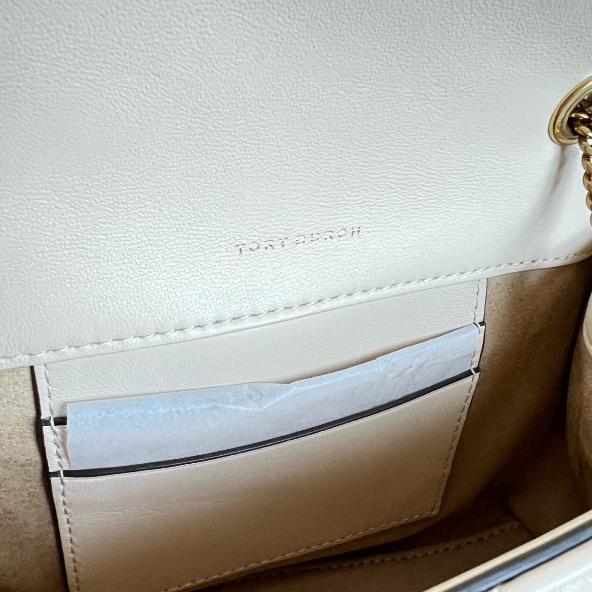 Tory Burch bag is made of cream leather. Dimensions: 8" widest across bottom x 5" tall x 2" deep. Chain strap 21.5" drop. Interior: 1 compartment. 2 card slots. Snap closure. Fabric lining. Gold tone metalware. It seems to be new because the charm on the dustbag is still covered in plastic and the card slots inside are lined with tissue paper.