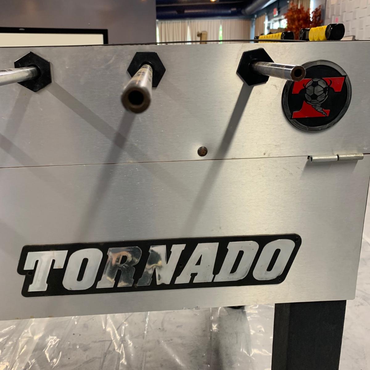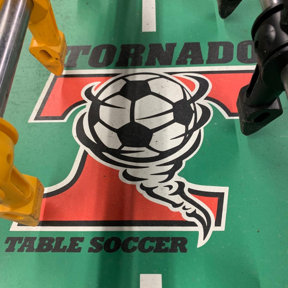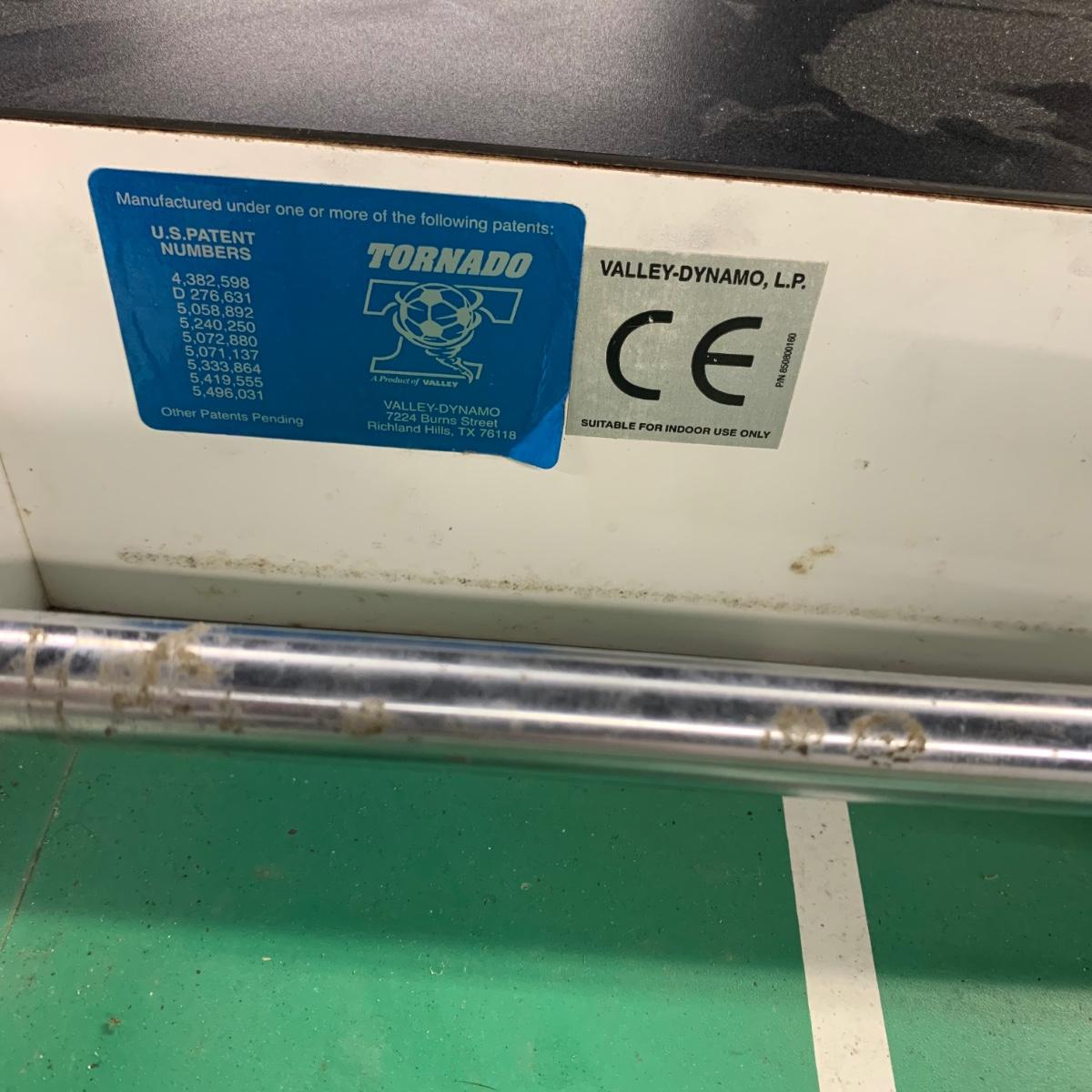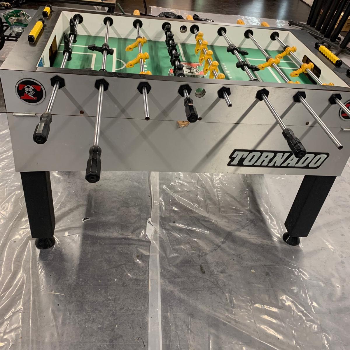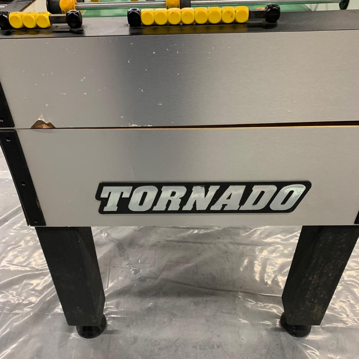 Tornado brand table soccer/foosball table. Table comes in two pieces for easier transport. When assembled, table measures 30” x 56” x 36.5”. Table appears to have been used and loved for many years. It has some warped pieces on its side panels, some dust on the legs and surface, and some scratches on the surface. The pins that allow the top part to be opened as a lid are missing, but could easily be replaced. The legs are a sturdy plastic and the frame is wood. There is a keyhole but no key is included. No balls are included. Local pick up only. The winning bidder will need to bring help to move this item as it is quite substantial. There is a small flight of steps to move it down from the building to the parking lot.