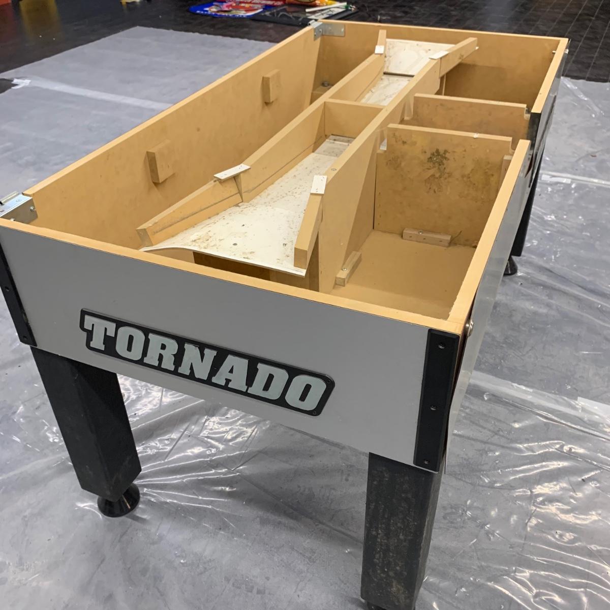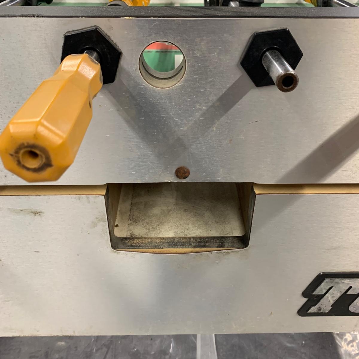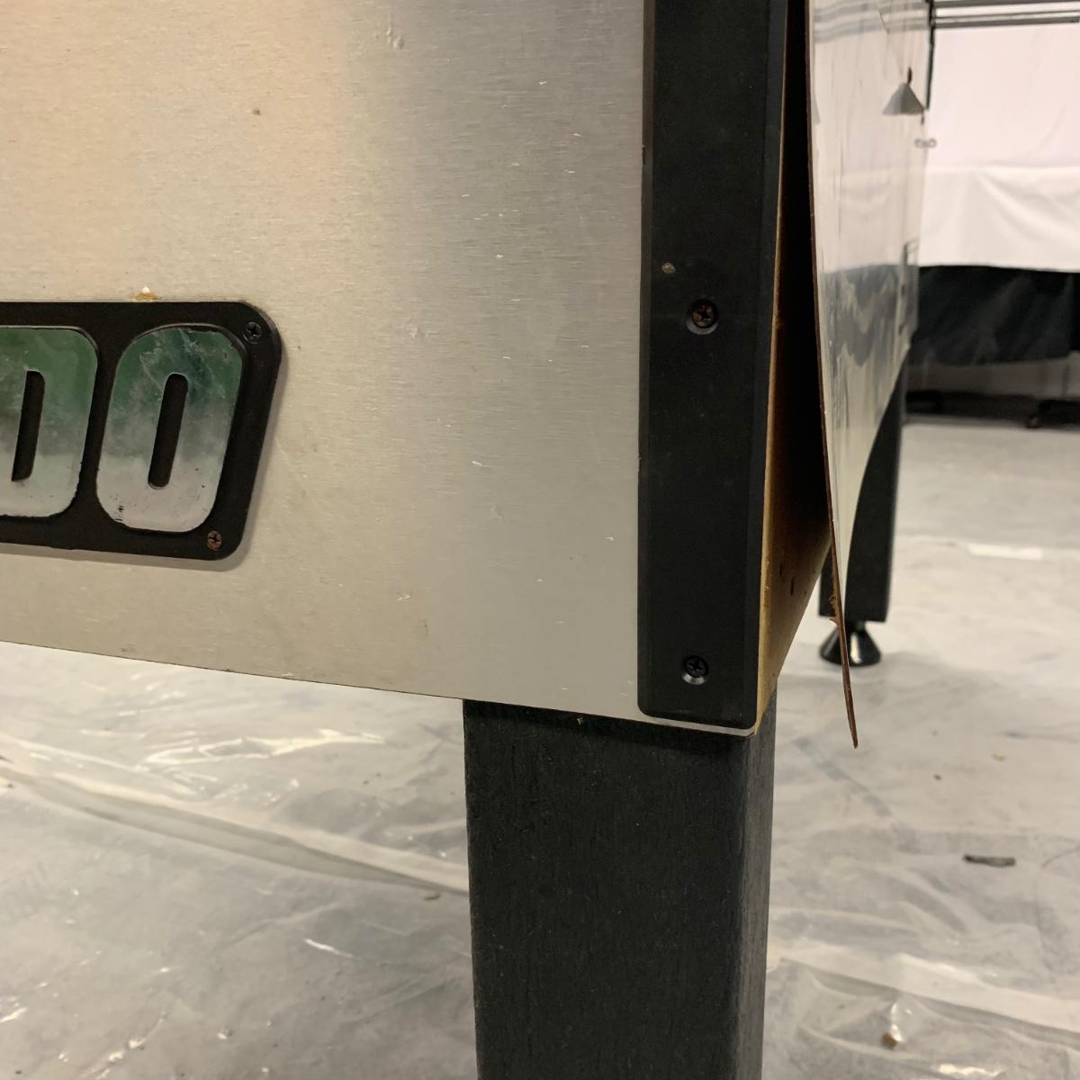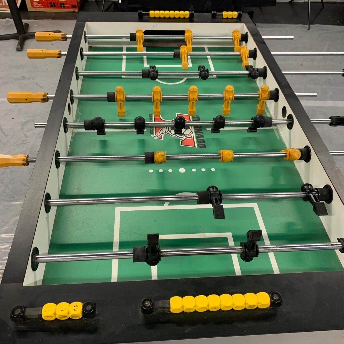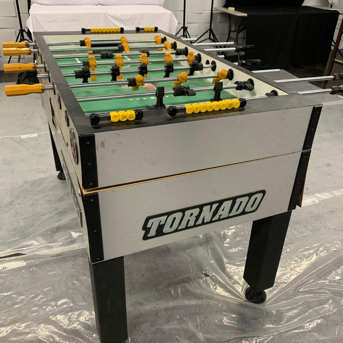 Tornado brand table soccer/foosball table. Table comes in two pieces for easier transport. When assembled, table measures 30” x 56” x 36.5”. Table appears to have been used and loved for many years. It has some warped pieces on its side panels, some dust on the legs and surface, and some scratches on the surface. The pins that allow the top part to be opened as a lid are missing, but could easily be replaced. The legs are a sturdy plastic and the frame is wood. There is a keyhole but no key is included. No balls are included. Local pick up only. The winning bidder will need to bring help to move this item as it is quite substantial. There is a small flight of steps to move it down from the building to the parking lot.