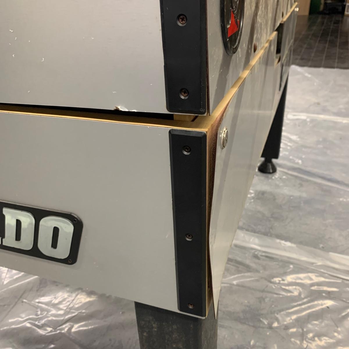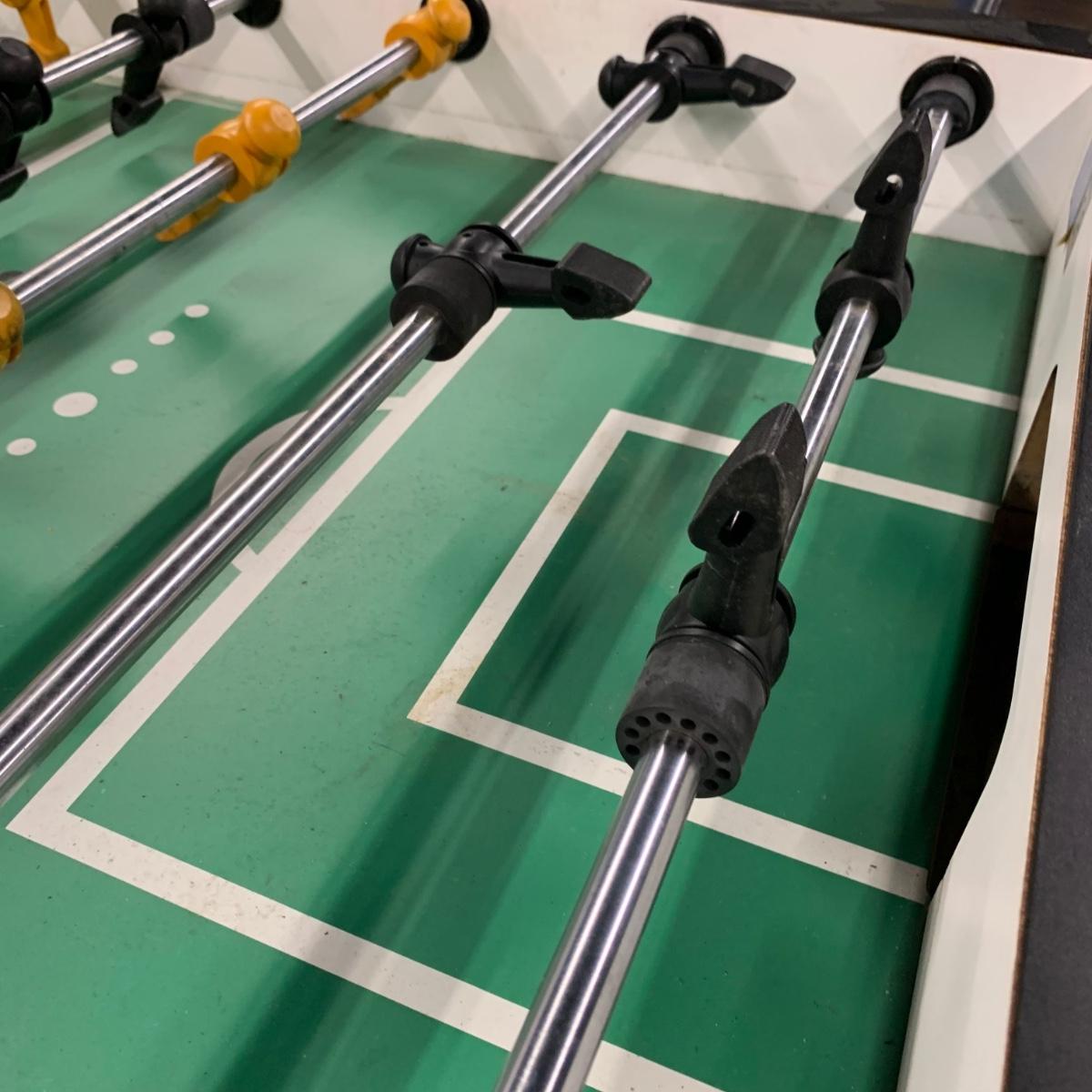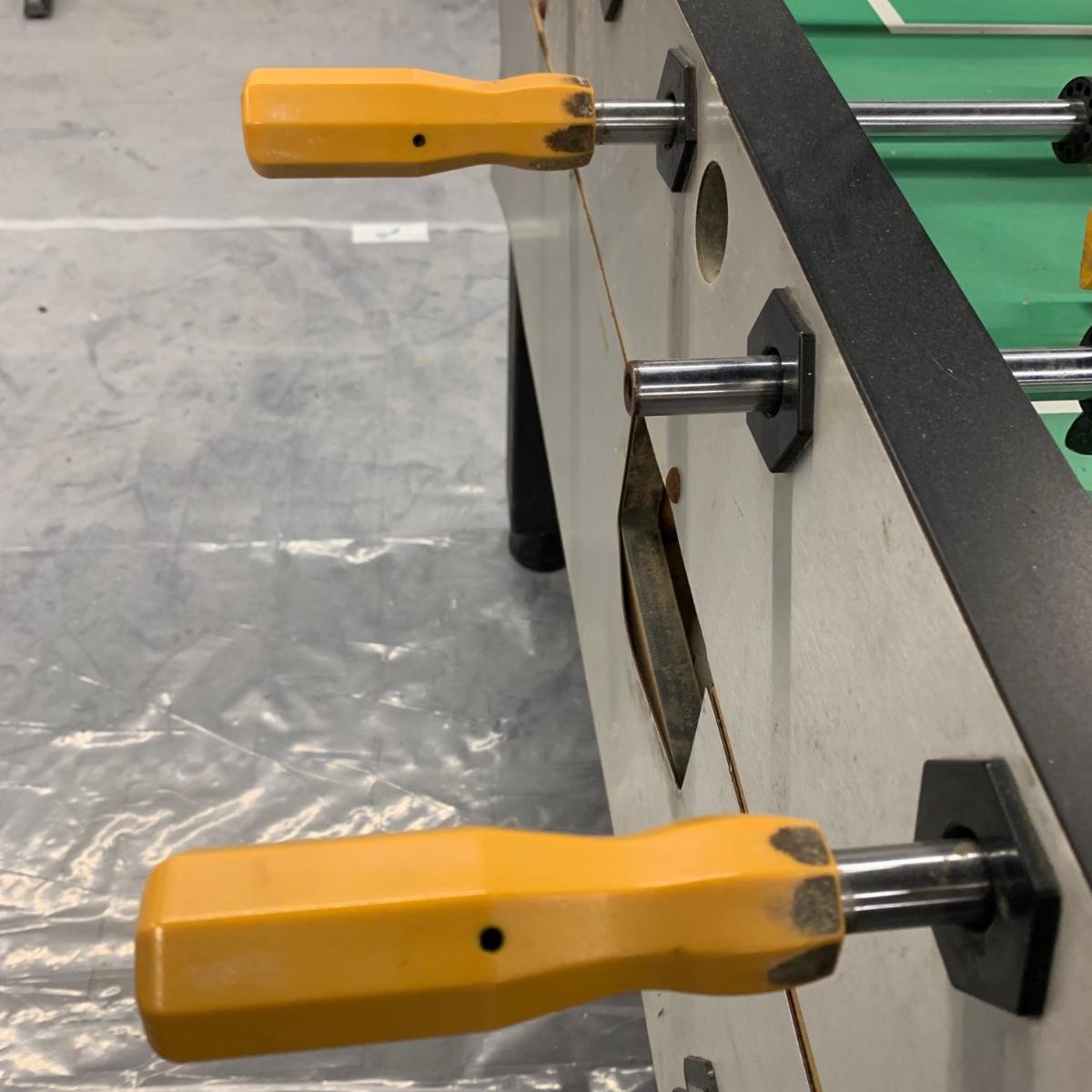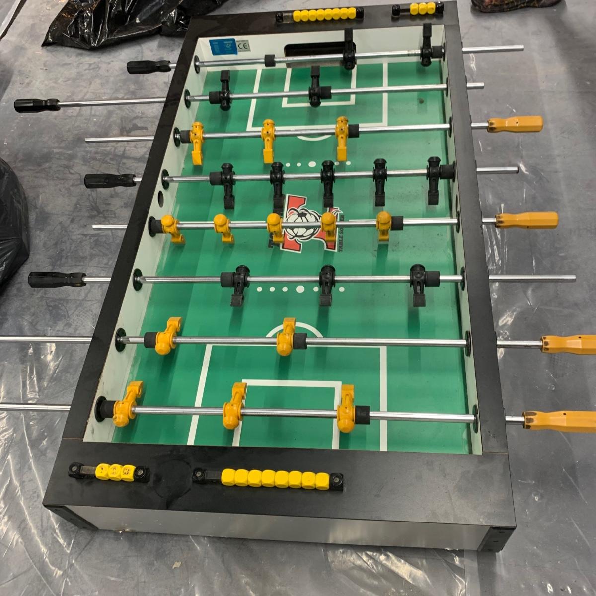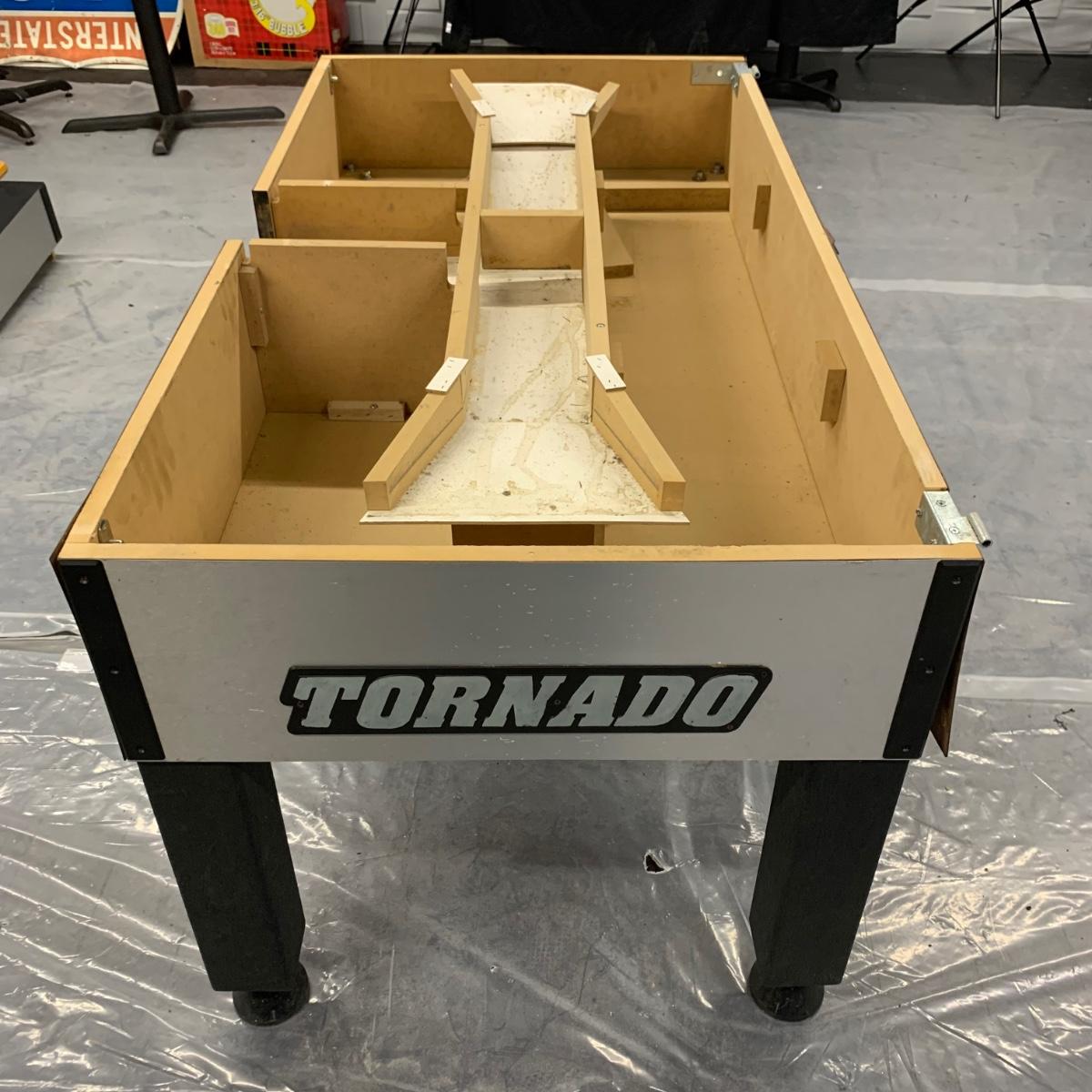 Tornado brand table soccer/foosball table. Table comes in two pieces for easier transport. When assembled, table measures 30” x 56” x 36.5”. Table appears to have been used and loved for many years. It has some warped pieces on its side panels, some dust on the legs and surface, and some scratches on the surface. The pins that allow the top part to be opened as a lid are missing, but could easily be replaced. The legs are a sturdy plastic and the frame is wood. There is a keyhole but no key is included. No balls are included. Local pick up only. The winning bidder will need to bring help to move this item as it is quite substantial. There is a small flight of steps to move it down from the building to the parking lot.