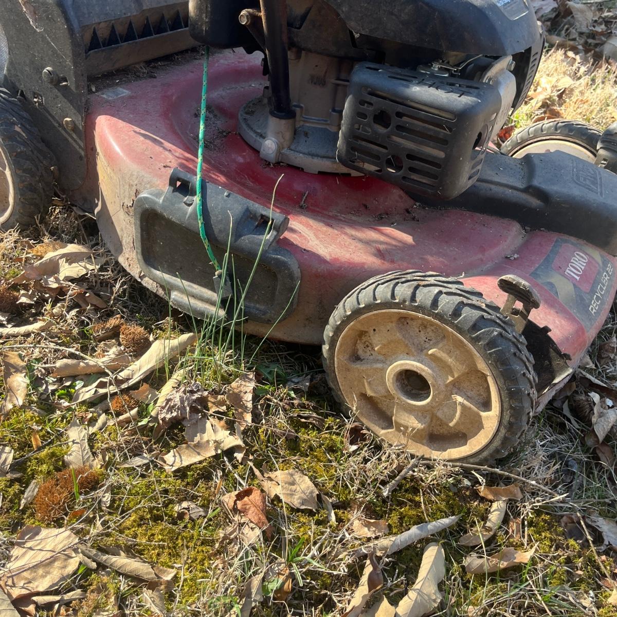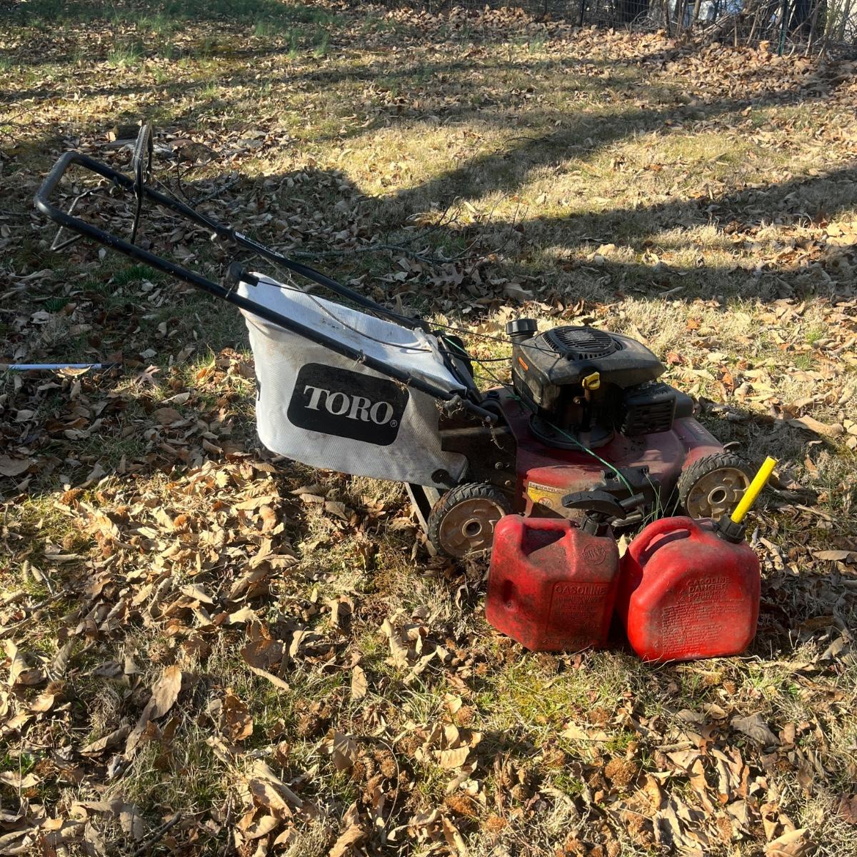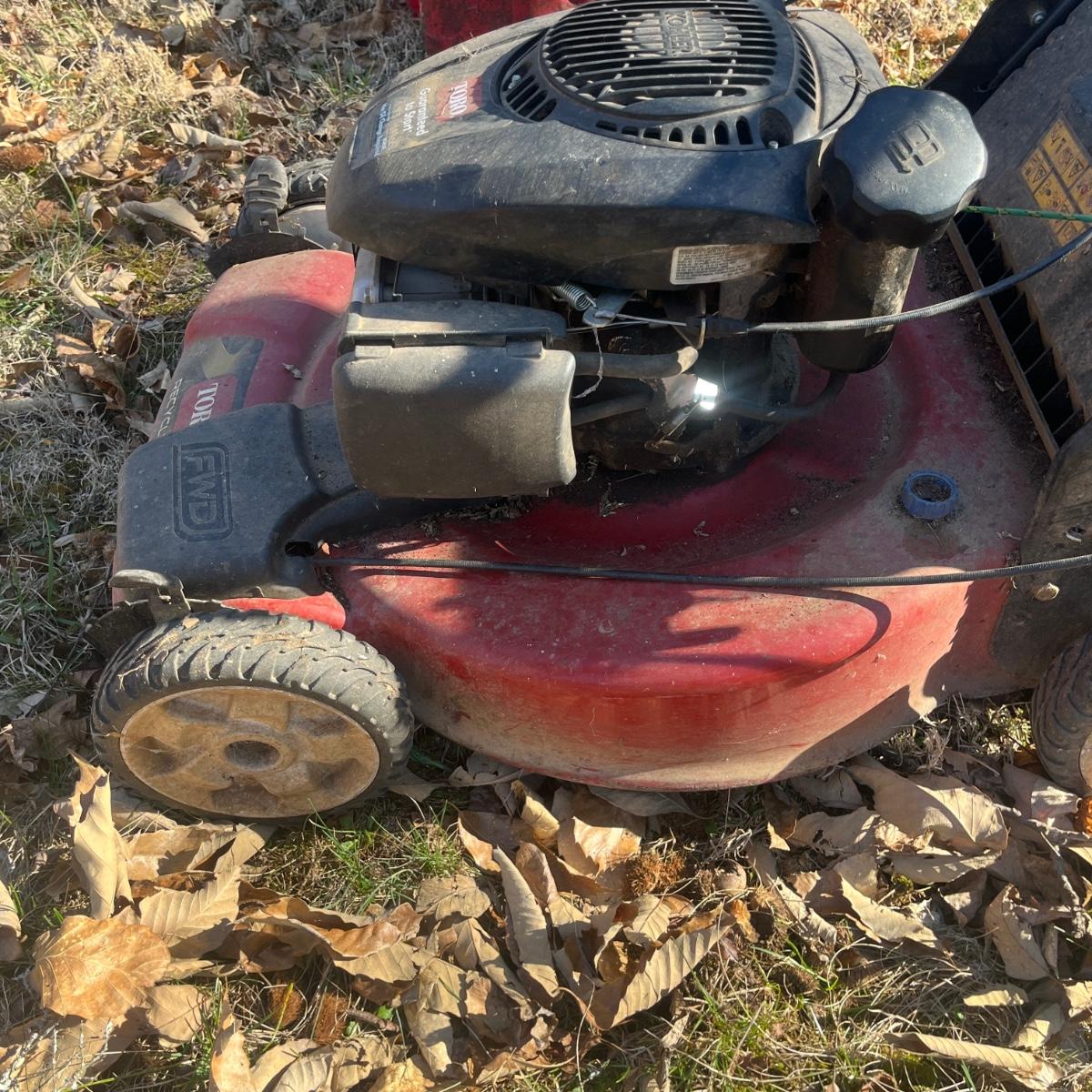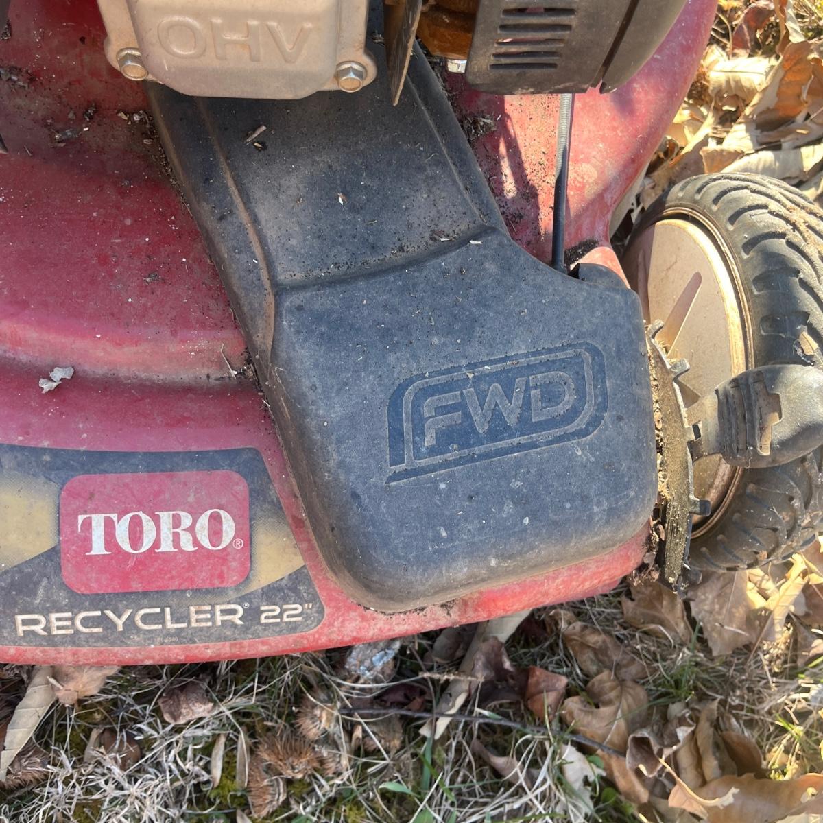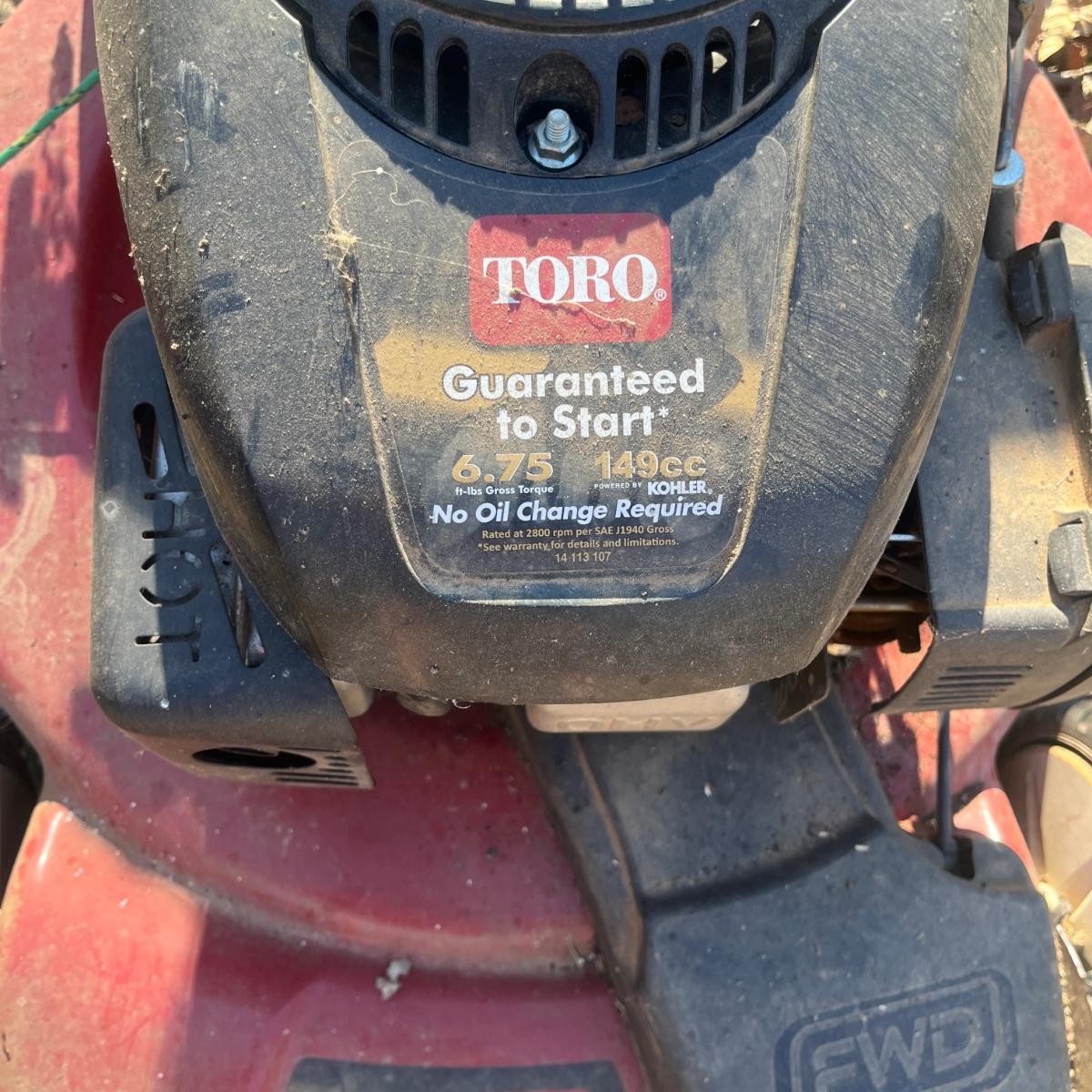 This 22” self propelled mower with a 6.75HP motor by Toro includes grass catcher. Mower turned over easy but did not start. Also includes two gallon gas cans with one being full with what we assume is gas but cannot guarantee.
