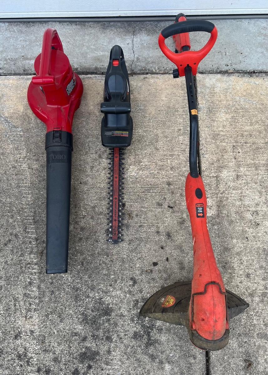 Lot is for GRASSHOG corded weedeater, Toro corded blower and Black & Decker corded hedge trimmer. All tested and works as they should. See pictures for model numbers and specs.