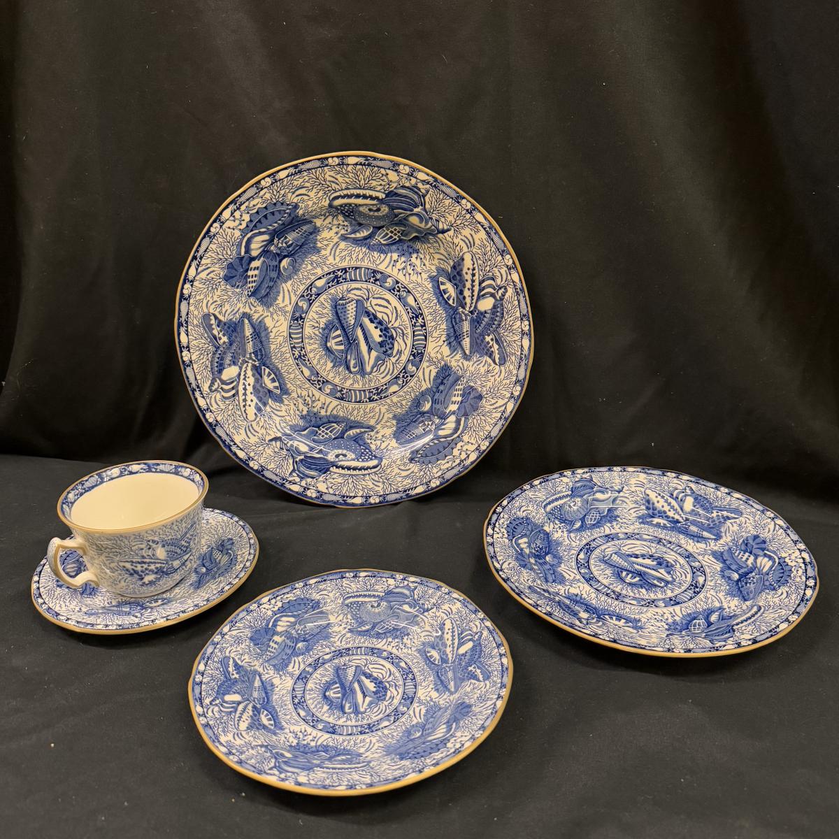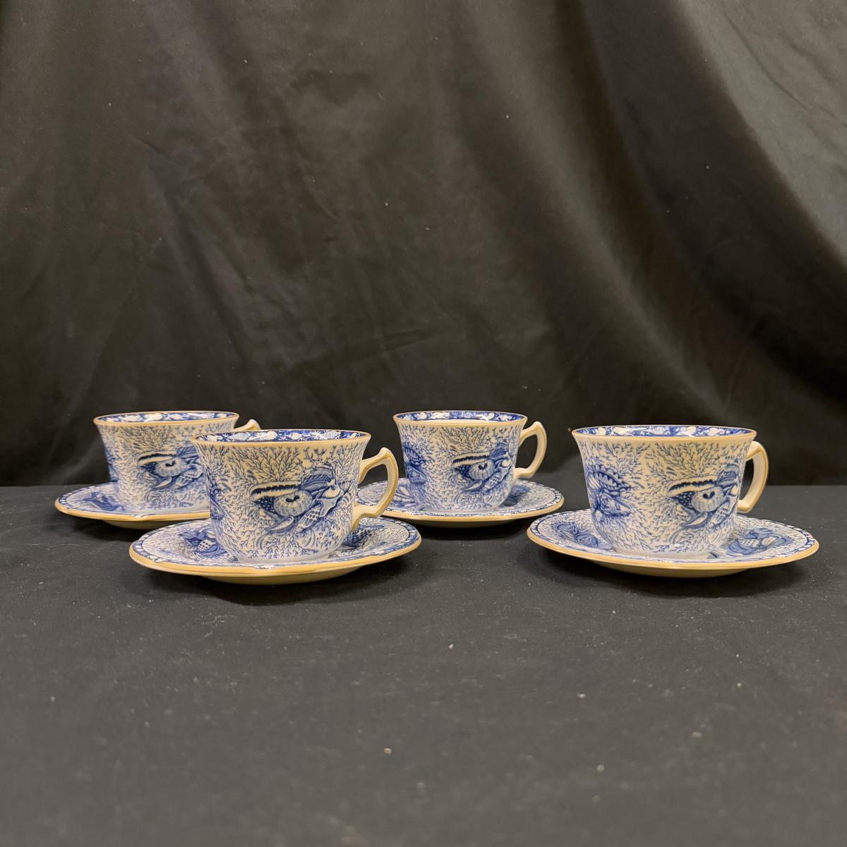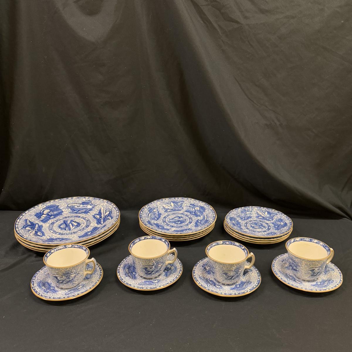 Lot includes a set of four Torquay Mottahedeh Winterthur reproduction china. You’ll find four cups, four saucers, four appetizer plates, and four dinner plates - all from the same set. The largest plates measure 10.5”D x 1”H. There is one plate that has a stain on it that may be removable - see picture included. Shipping available.