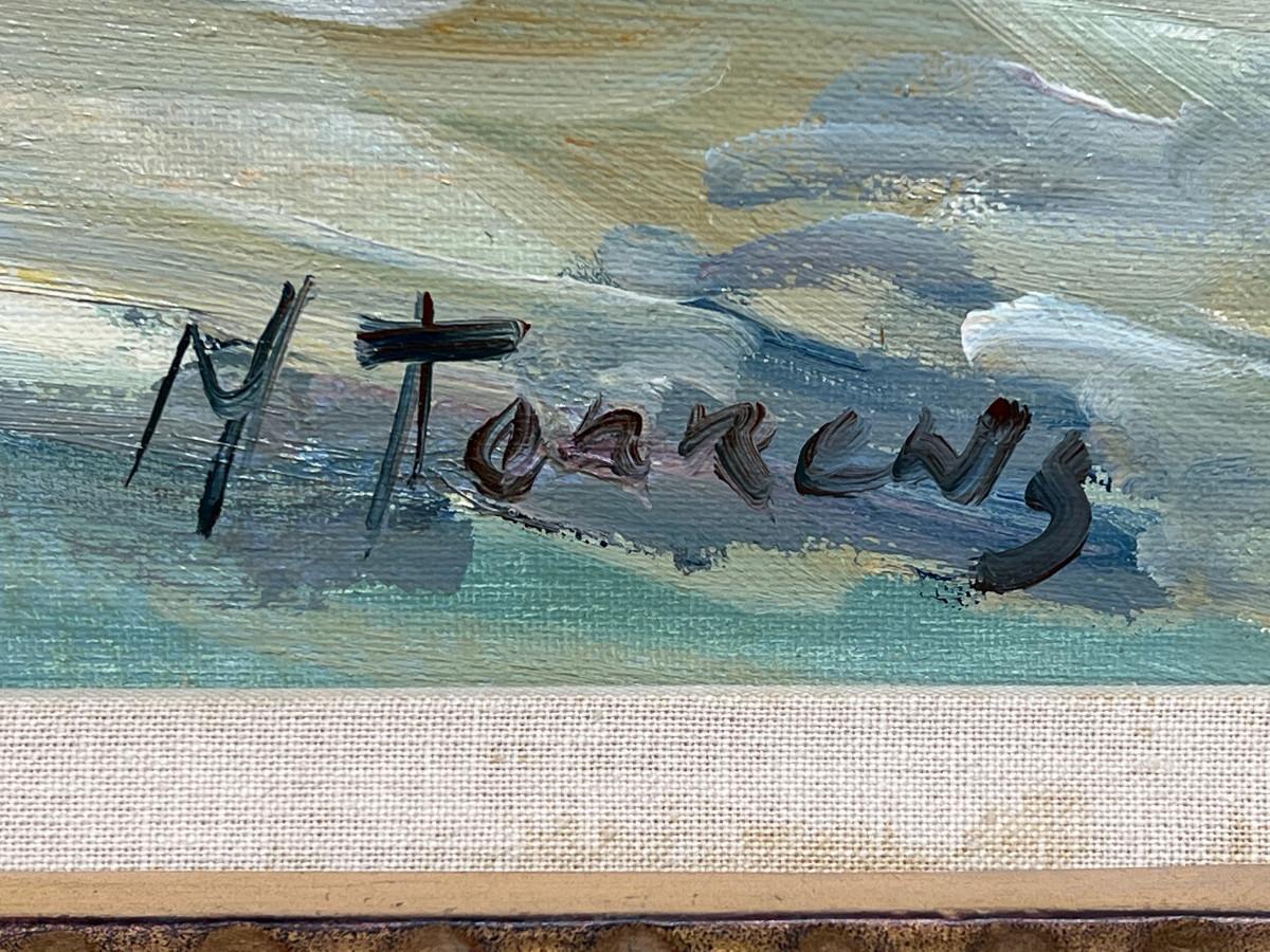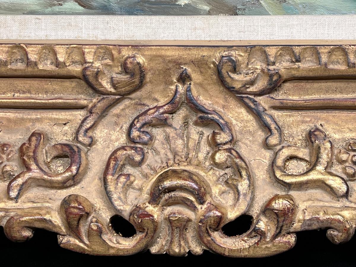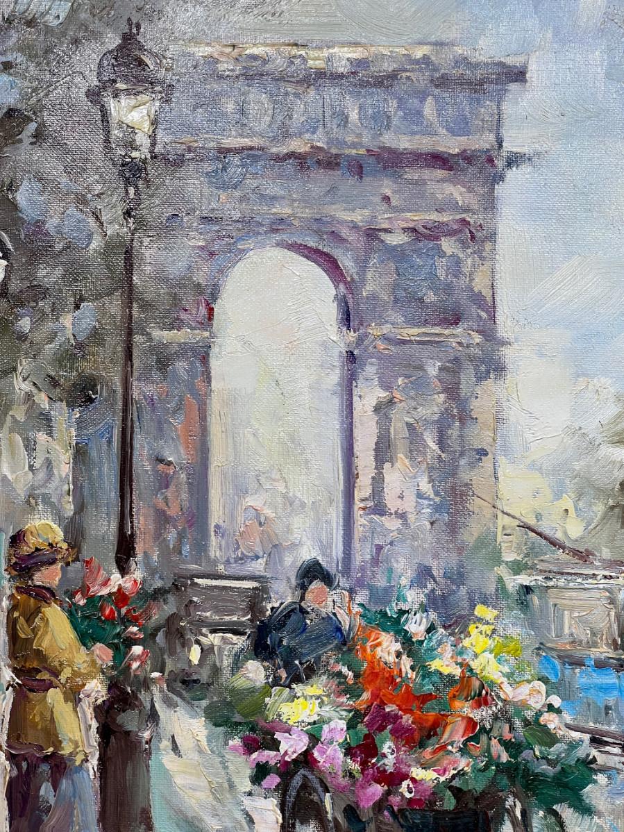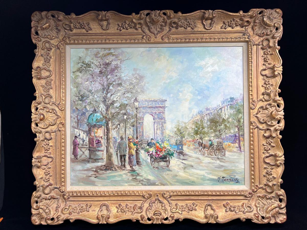 DESCRIPTION: The subject item is an original oil painting on stretched canvas, by French artist, M. Torrens. This large colorful, impressionistic Parisian street scene feature the famous Arch de Triumph in Paris. The painting has been set into a very elaborate french frame.