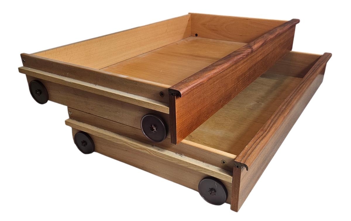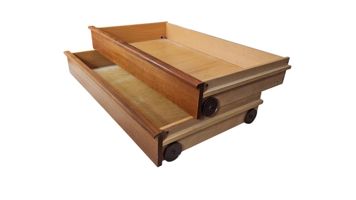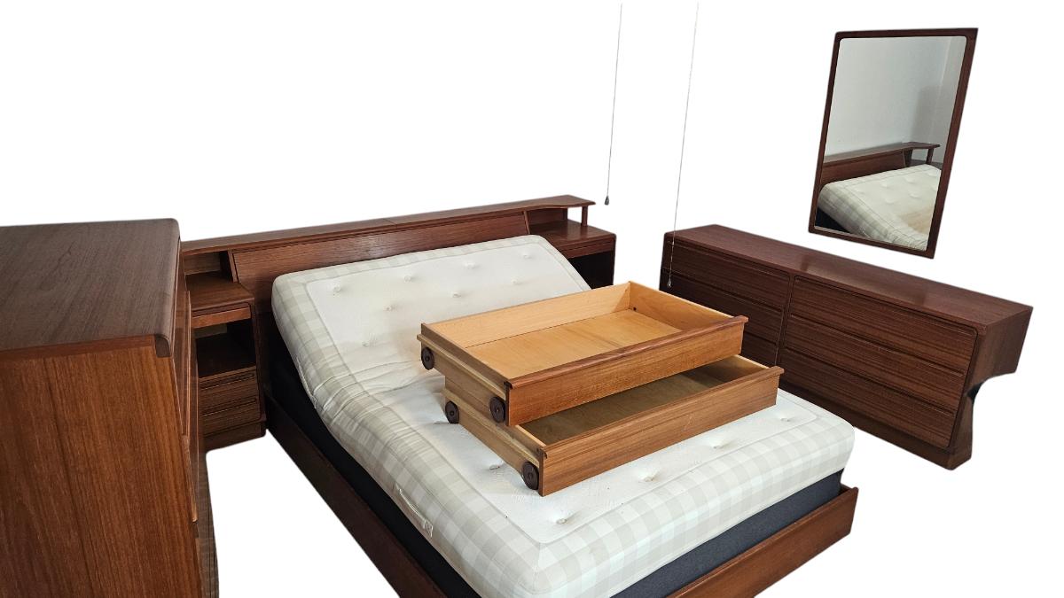 Pieces include 2 Cabinets, Bed with Frame and Mattress, Mirror, 2 Rolling Storage Bins