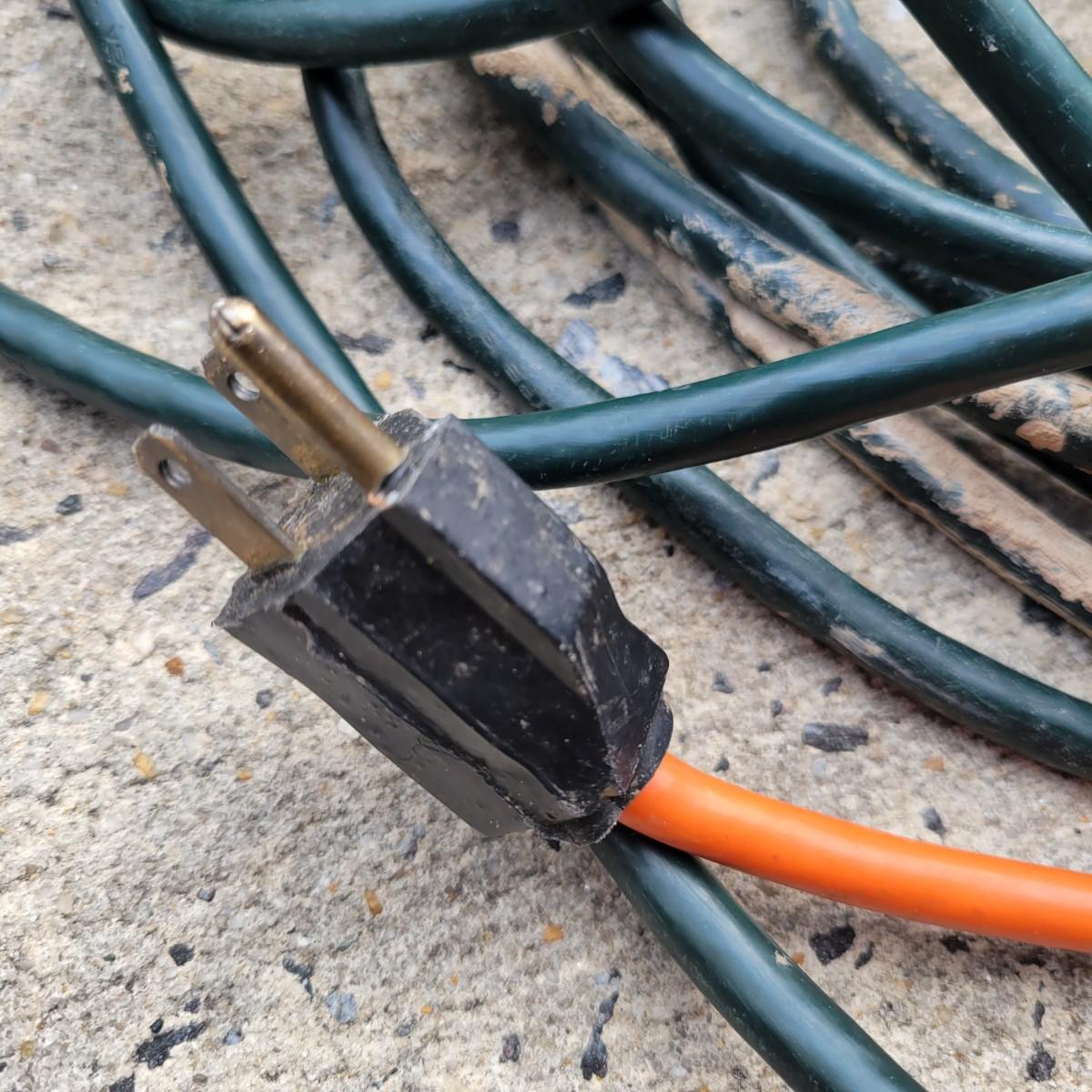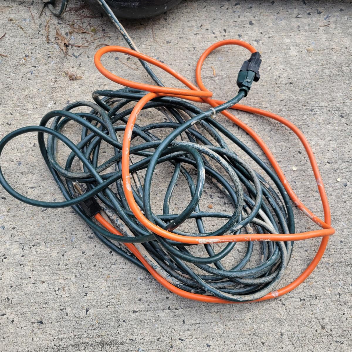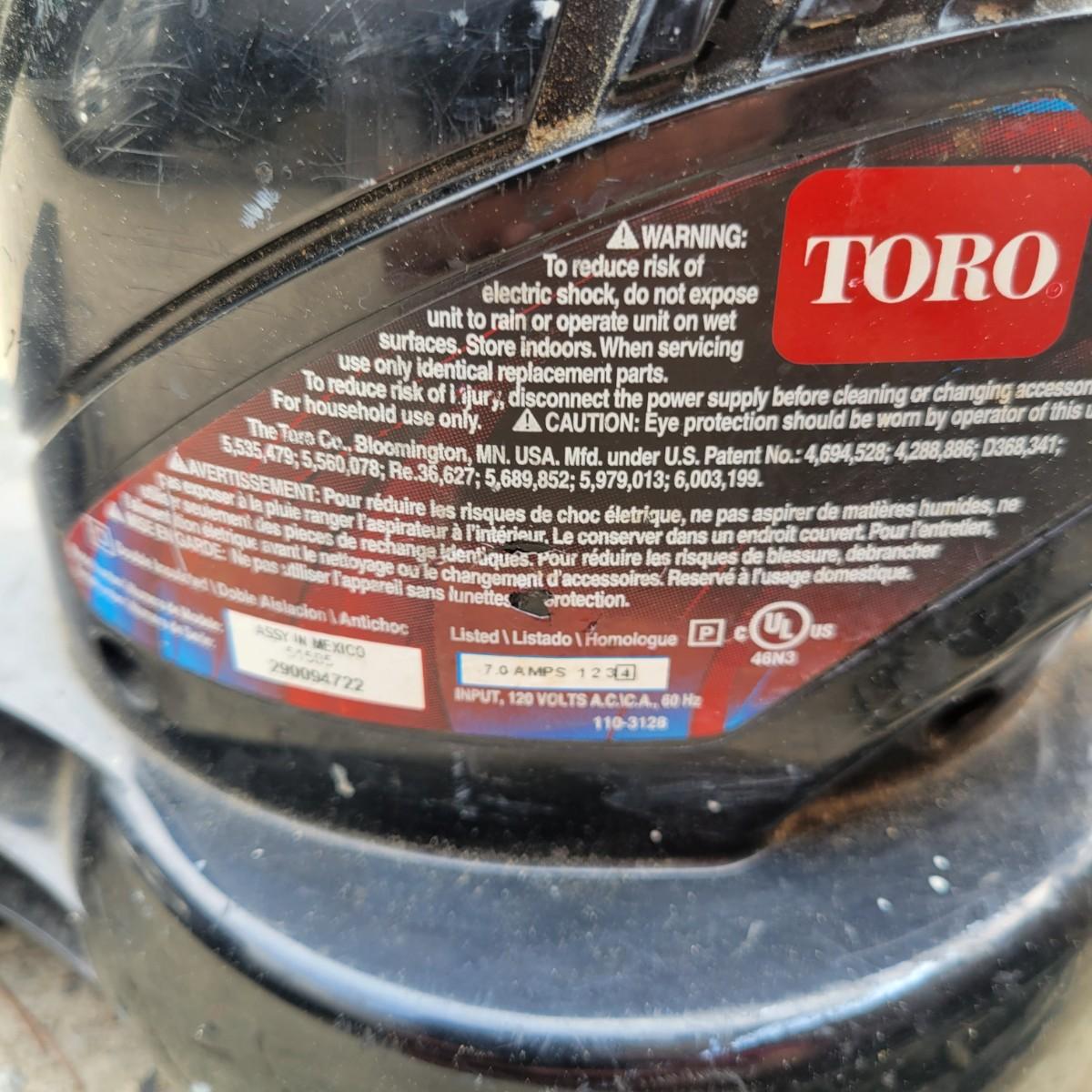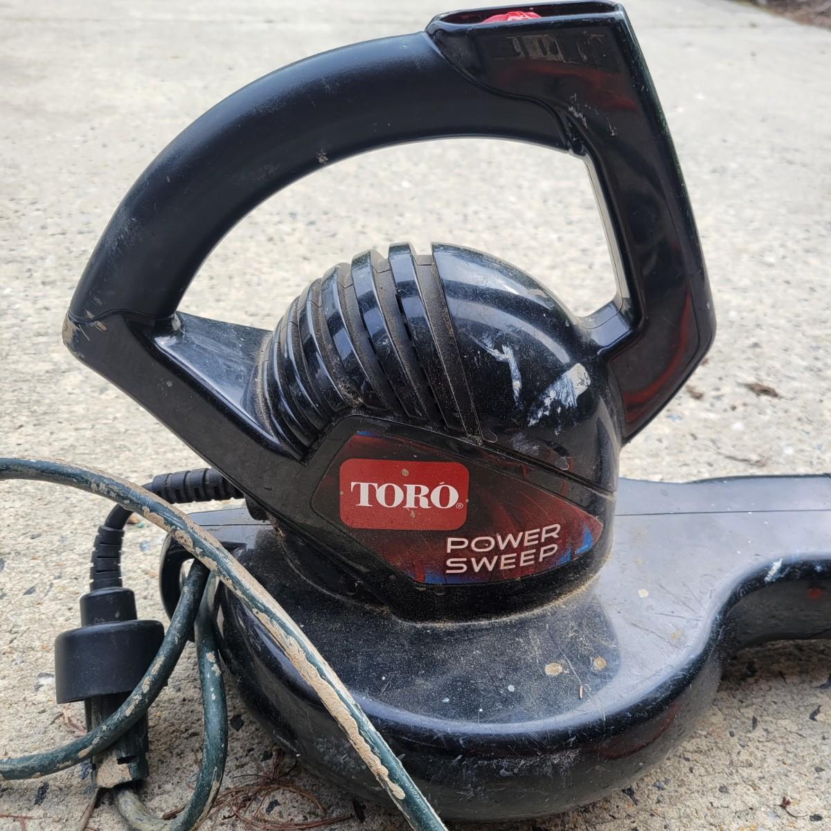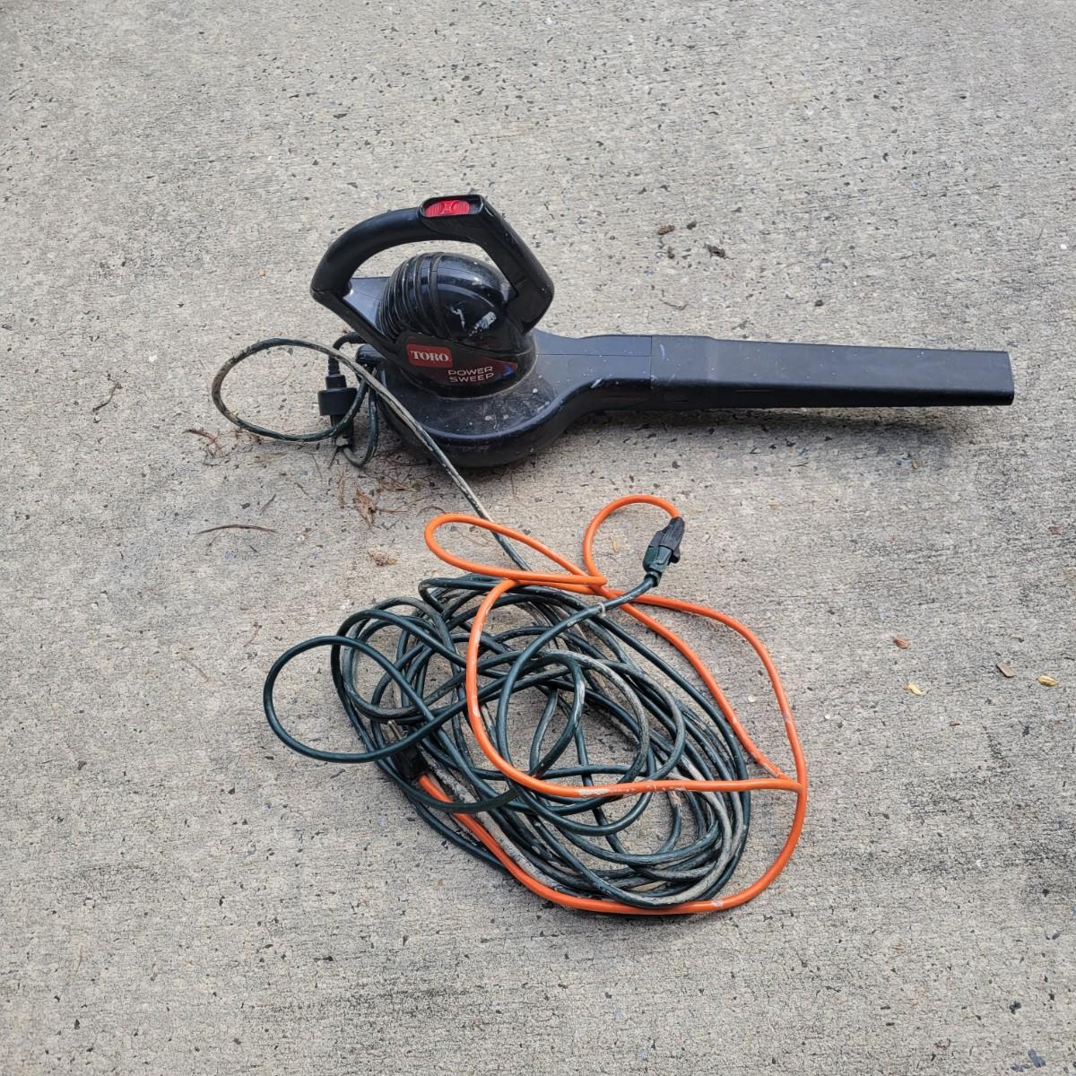 A Torro power sweep electric blower that powered on when plugged in. This lot also includes two extension cords. One is 25' and the other is 6'. Local pickup only
