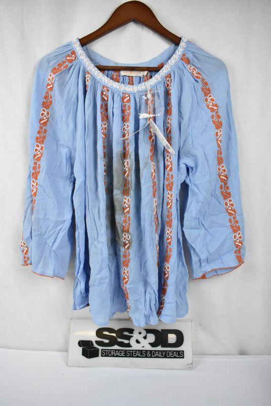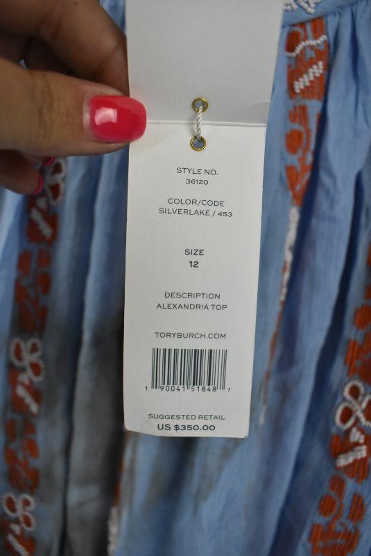 Tory Burch $350 Beaded Shirt size 12, NEEDS CLEANING. NWT but dirty. Light Blue with Orange & White