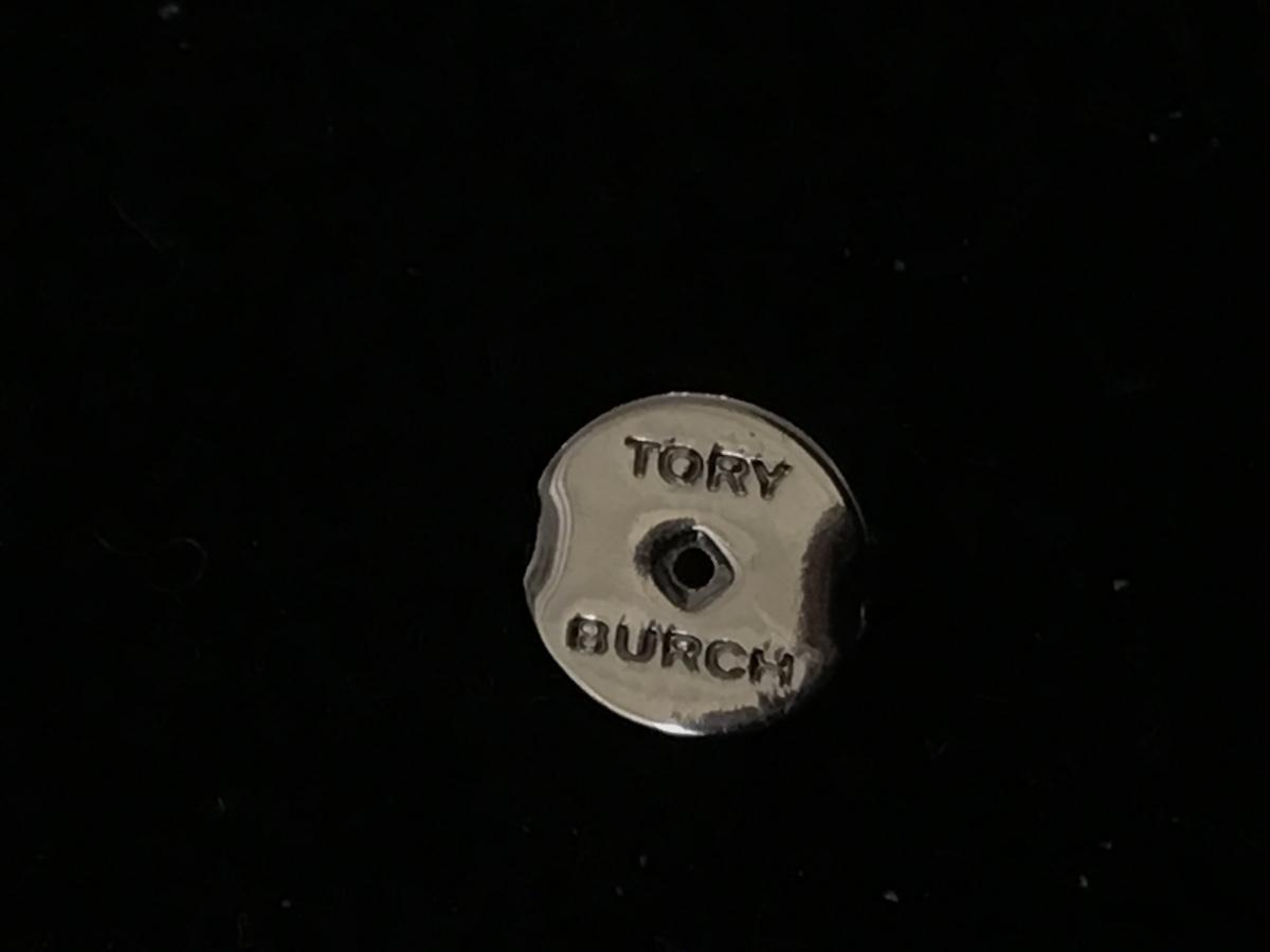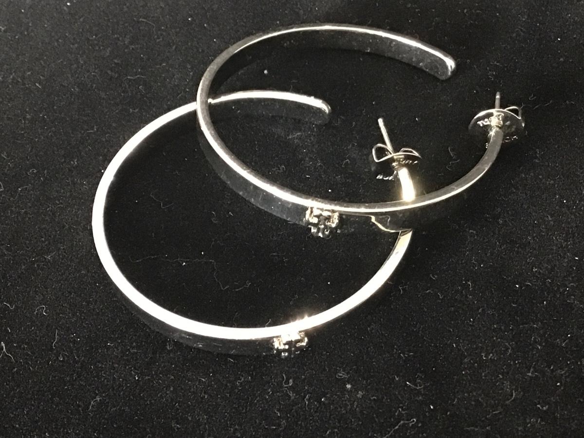 Tory Burch. Silver Tone Marked Hoop Earrings