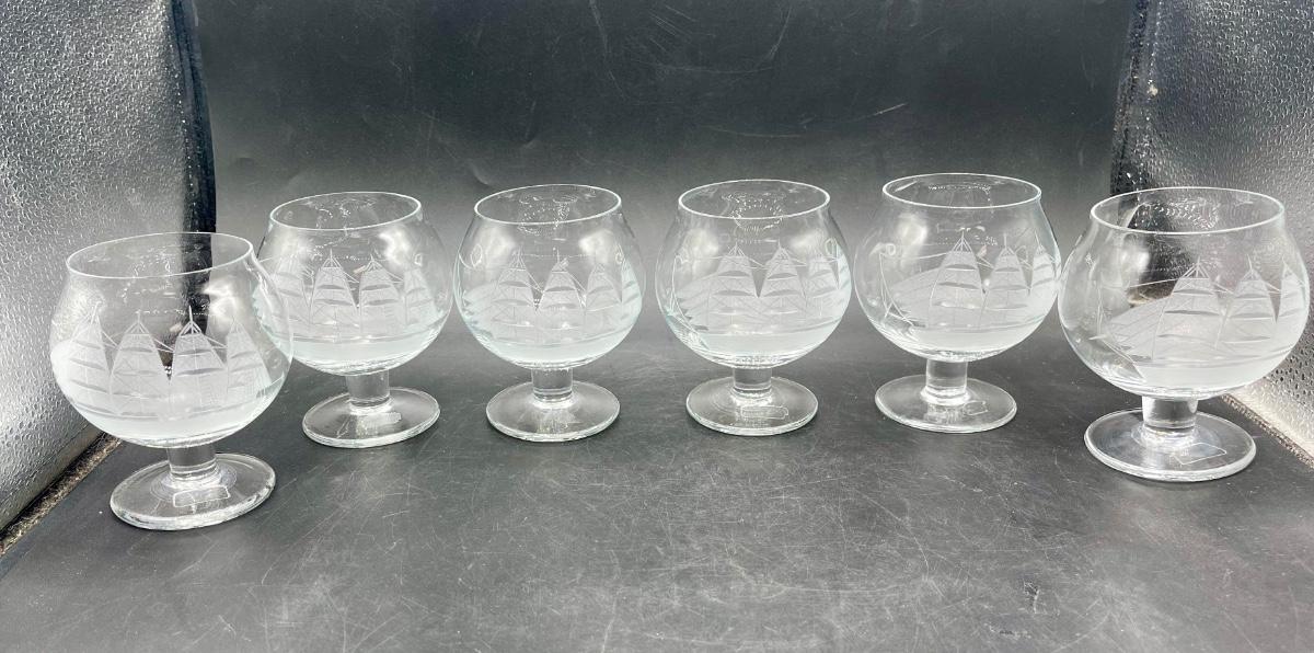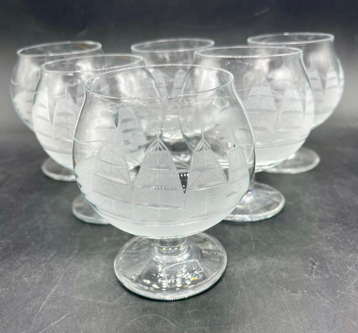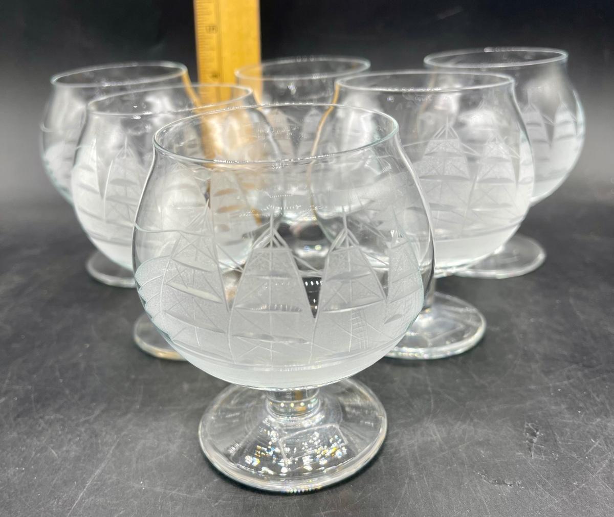 Toscany Clipper Ship Etched Frosted Brandy Snifter Glasses set of 6